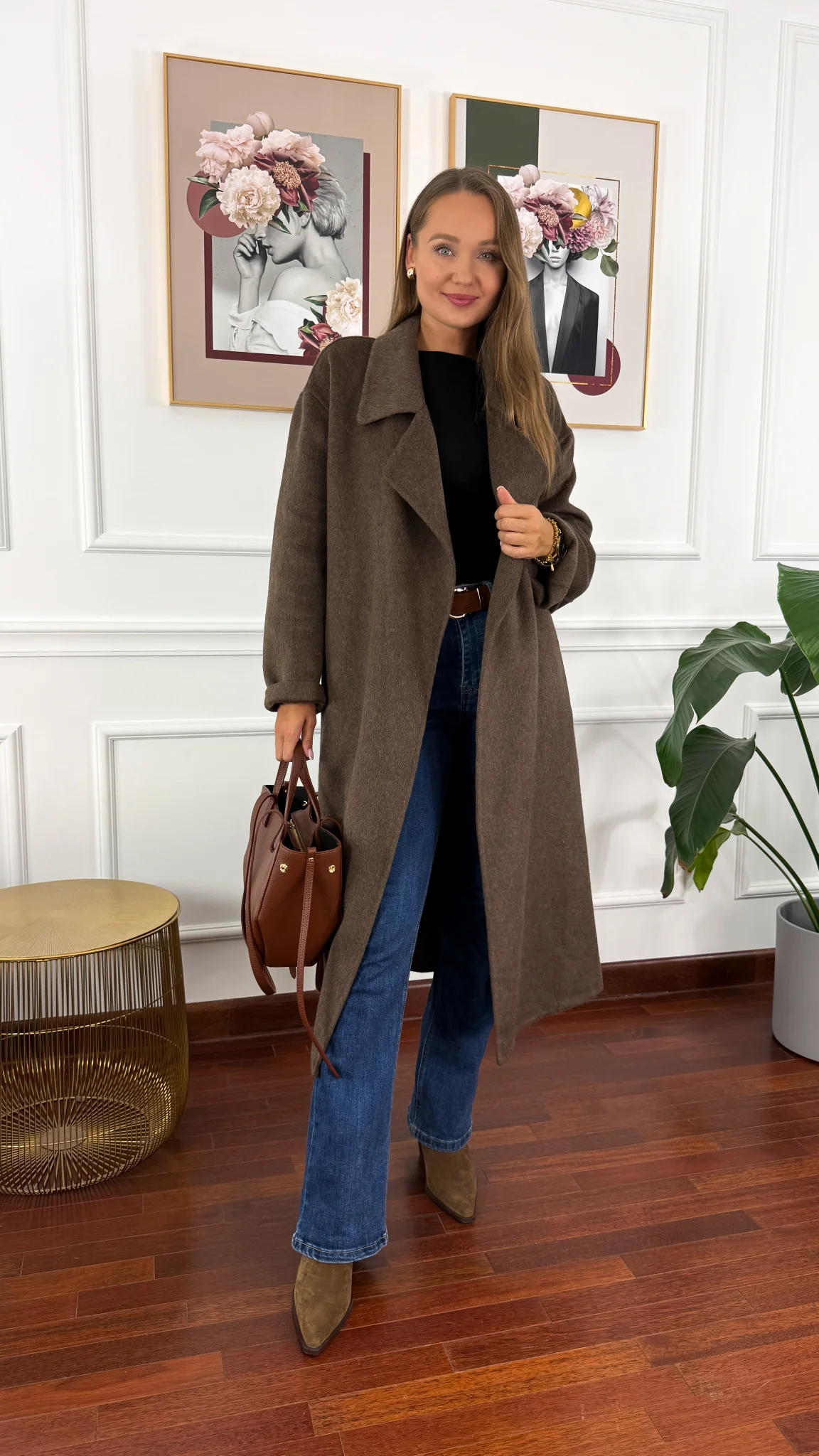 Obecnie brak na stanie XS/S S/M Powiadom mnie o dostępności. Wełniany płaszcz Eva czekoladowa 389,99 zł