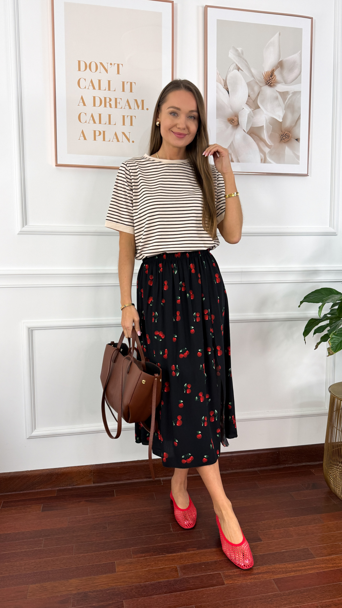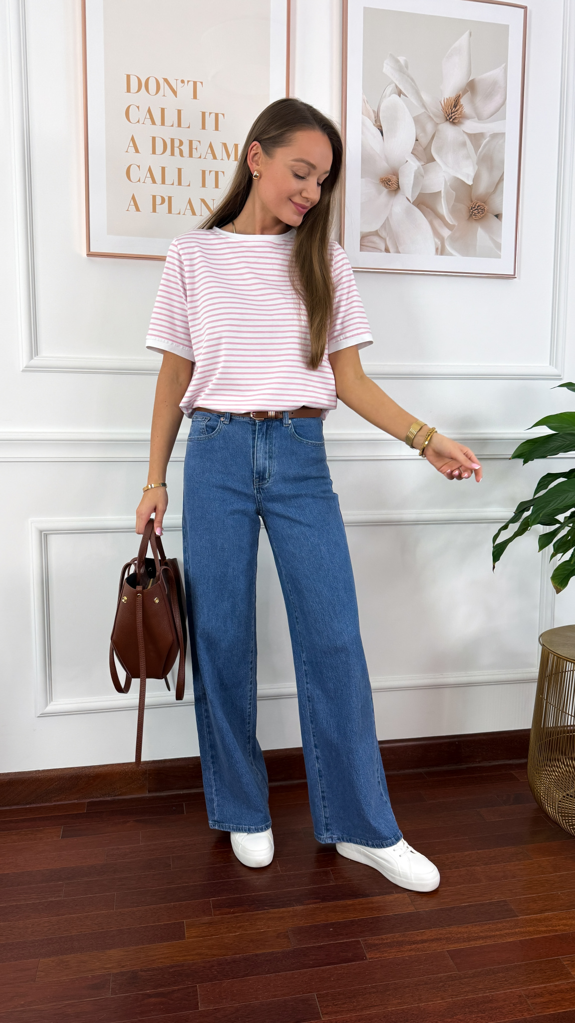 Obecnie brak na stanie One size Powiadom mnie o dostępności. Bawełniany T-shirt Ella w paski biało-różowe 99,99 zł