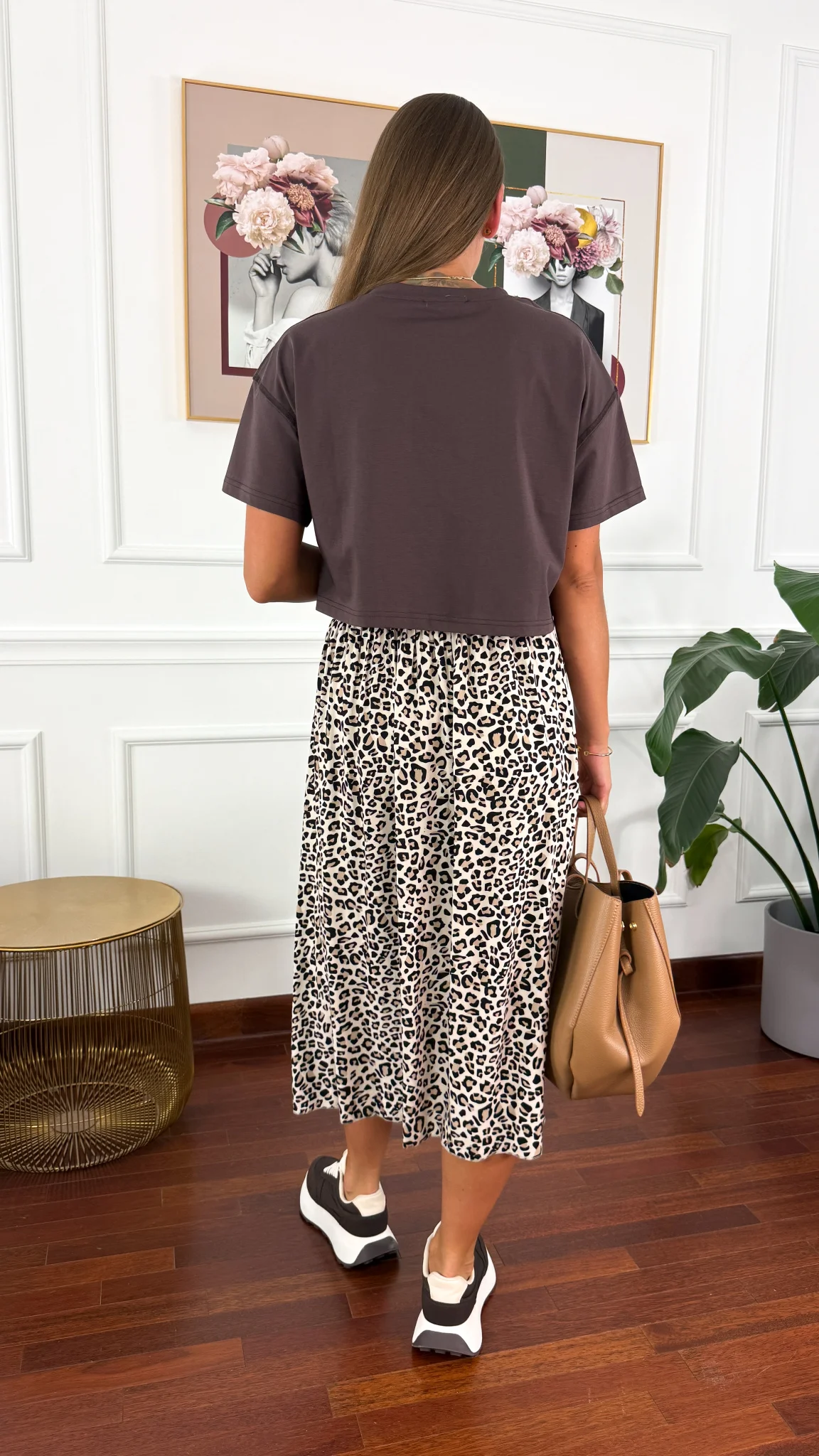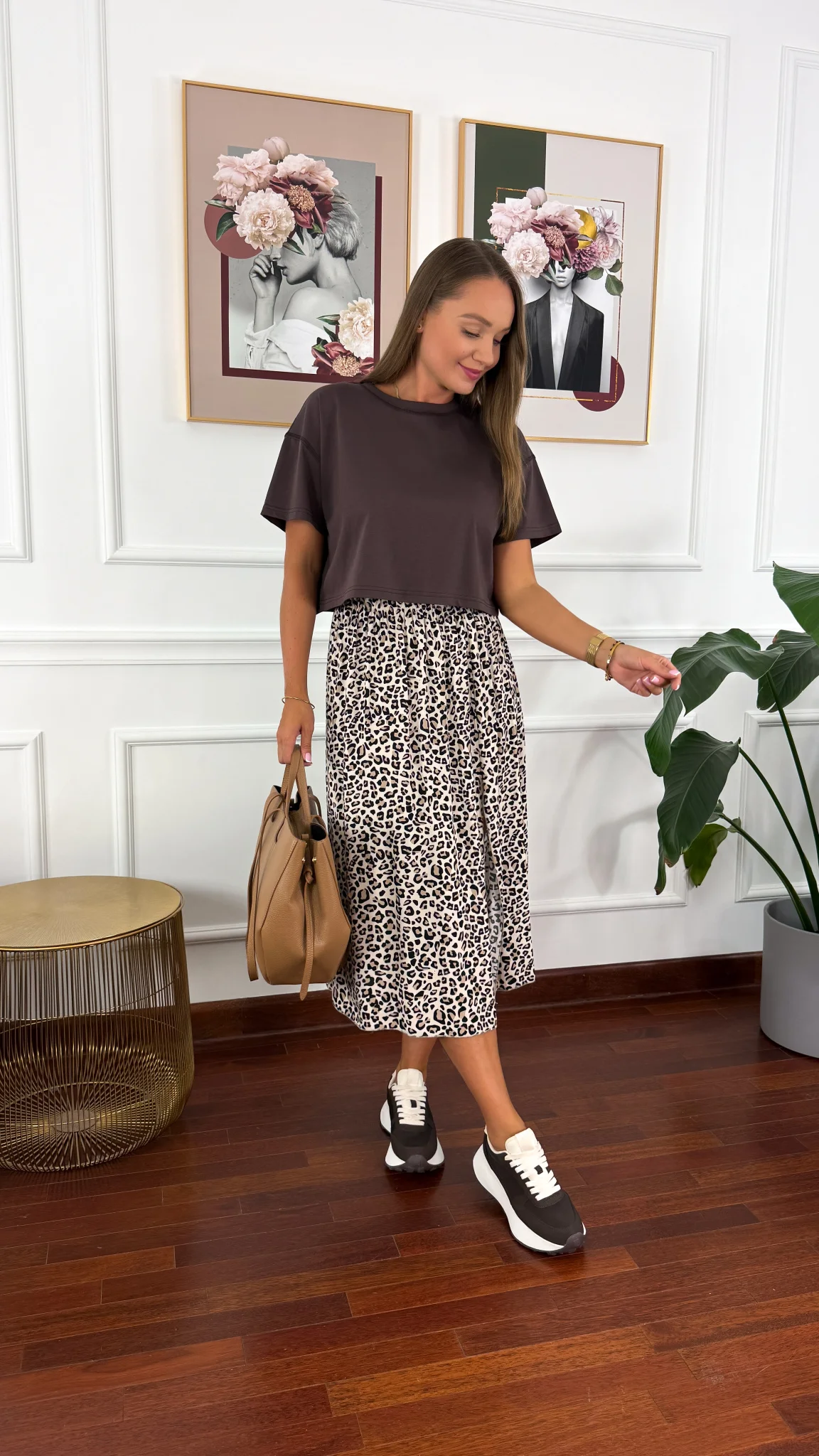 Basicowy t-shirt z krótszym stanem oraz okrągłym dekoltem.