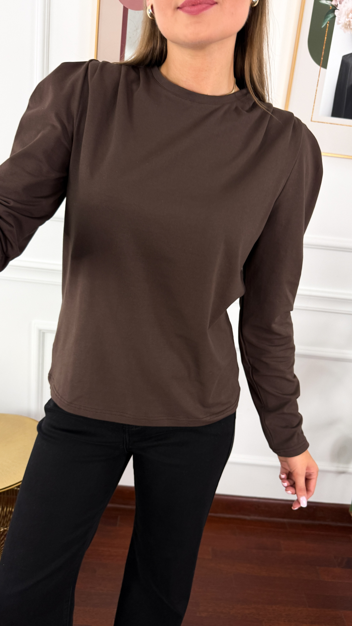 Model sprawdzi się na sylwetkę w rozmiarze od S do L. Bluzka z okrągłym dekoltem i długim rękawem. W ramionach wszyto poduszki. W górnej części występuje drapowanie materiału.