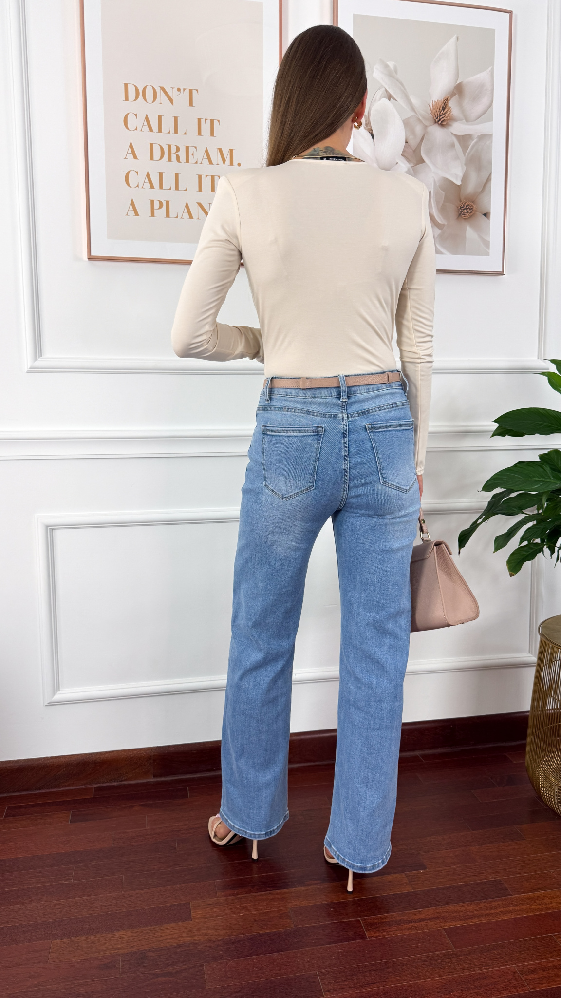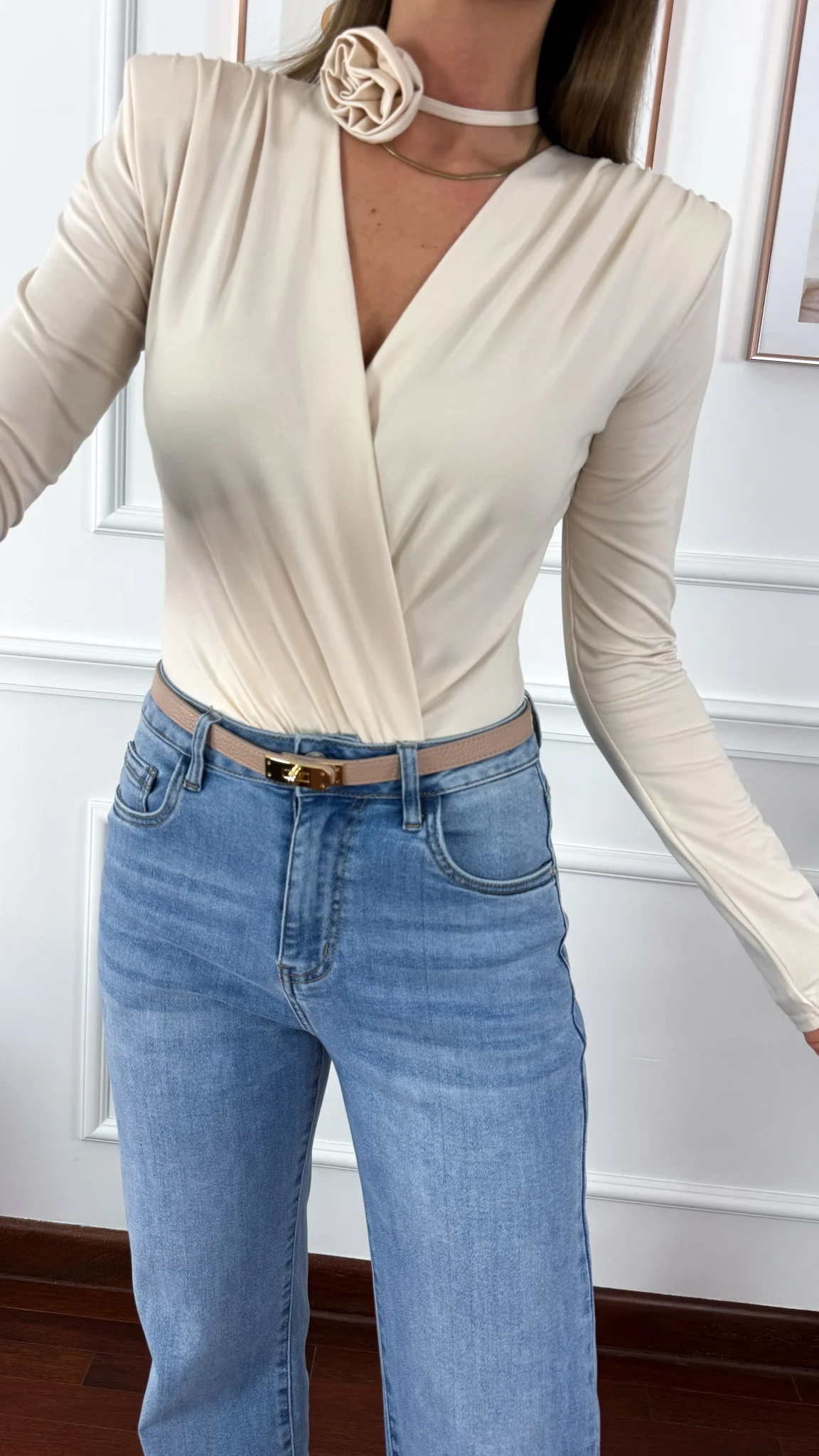 Body z przekładanym dekoltem oraz długim rękawem. Od przodu materiał jest drapowany. W ramionach wszyto poduszki. Materiał jest niezwykle przyjemny w dotyku. Dół body to figi zapiane na zatrzaski. W zestawie z ozdobną różą.