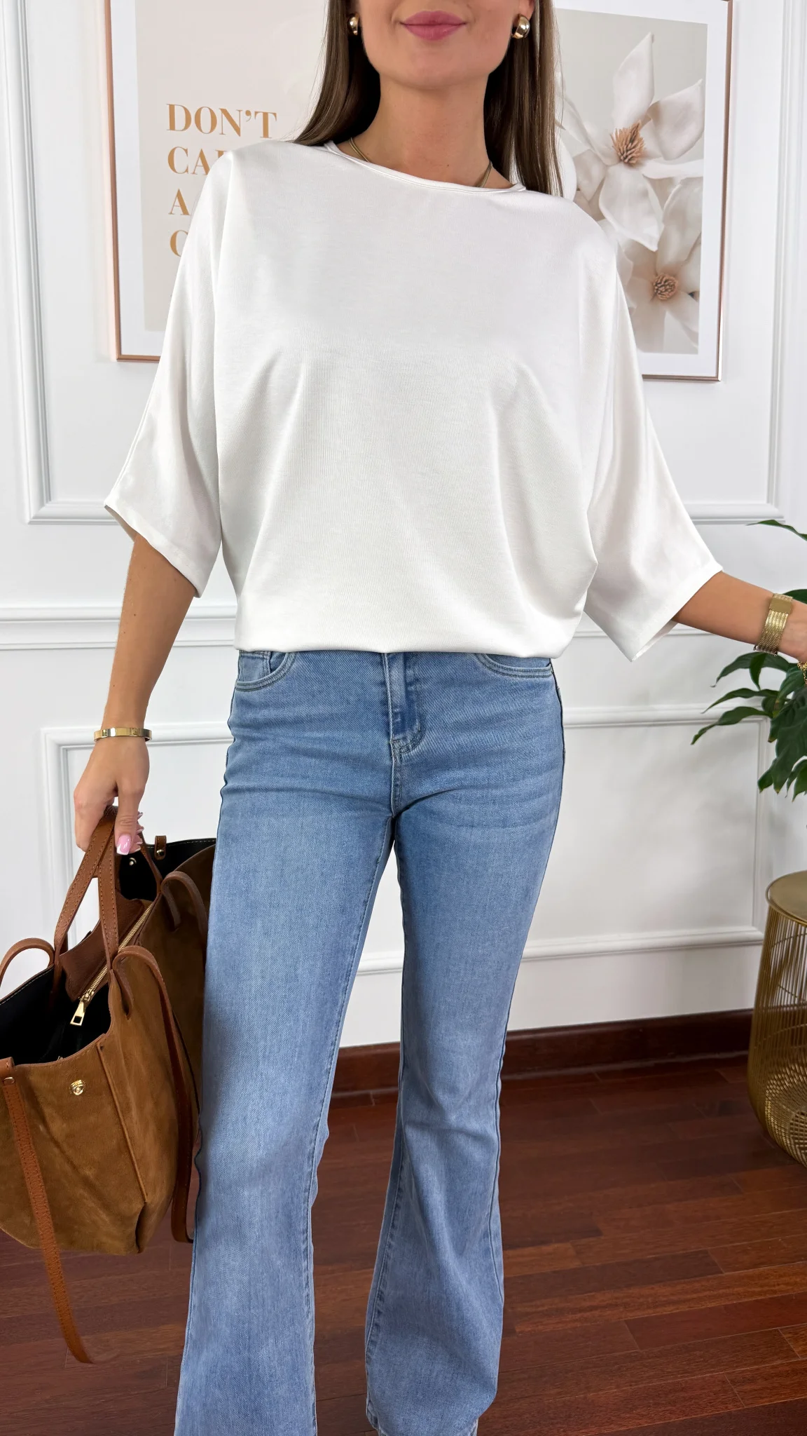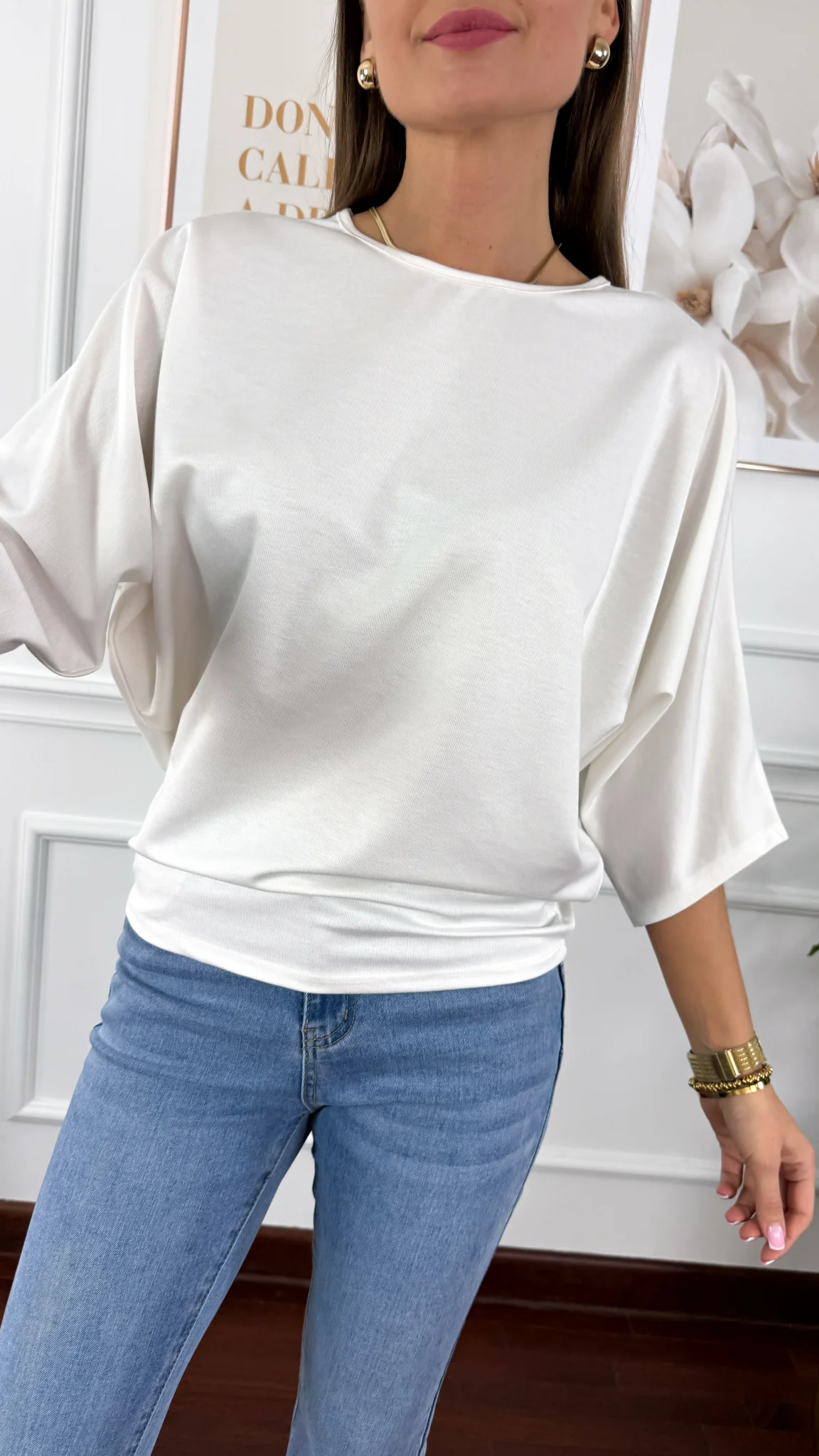Bluzka sprawdzi się na sylwetkę od S do L. Oversize'owa bluzką z okrągłym dekoltem oraz rękawem 3/4 o fasonie nietoperza.