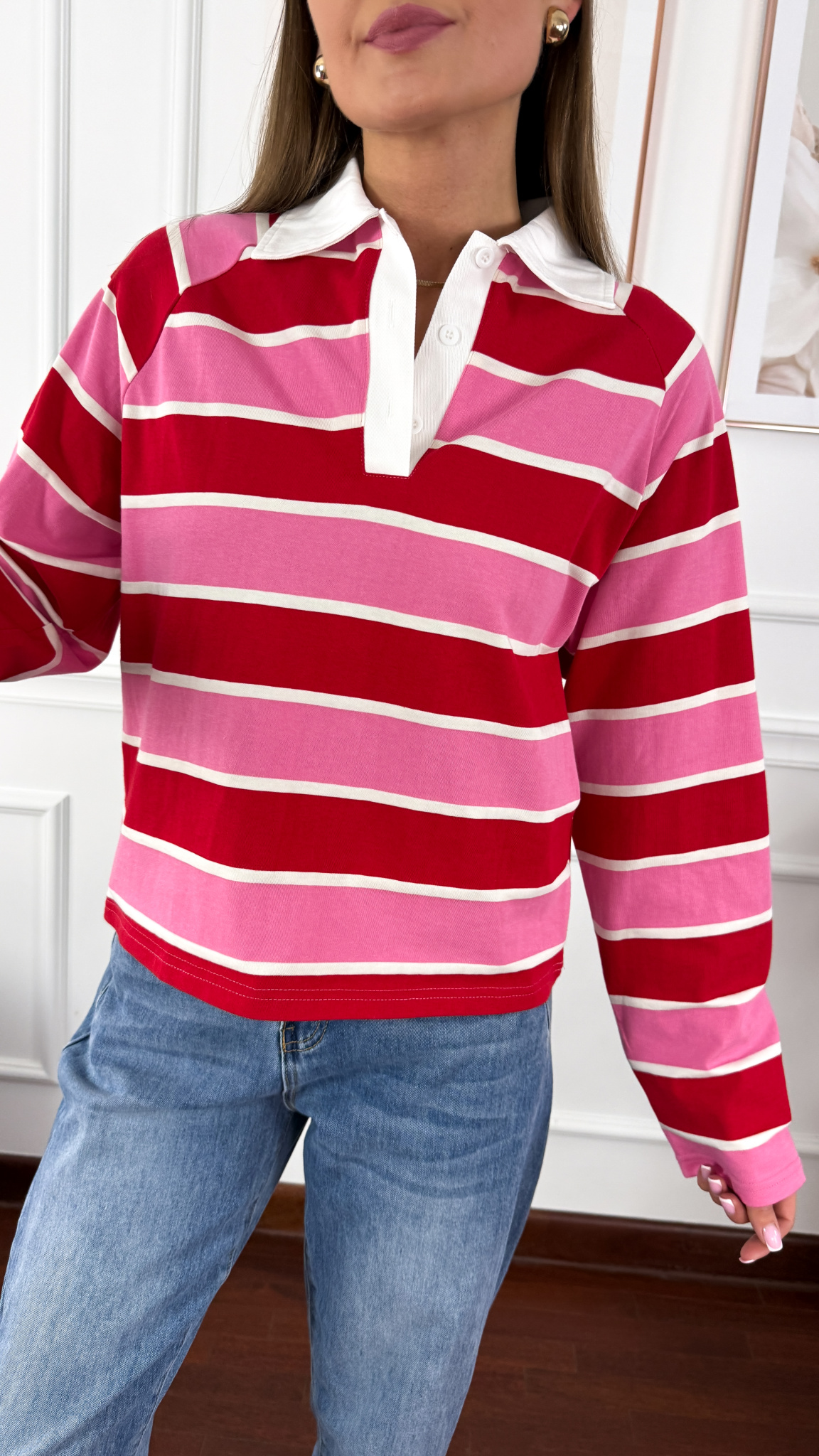 Bawełniana bluzka polo w paski. Posiada ozdobny kołnierzyk. Rękaw prosty.