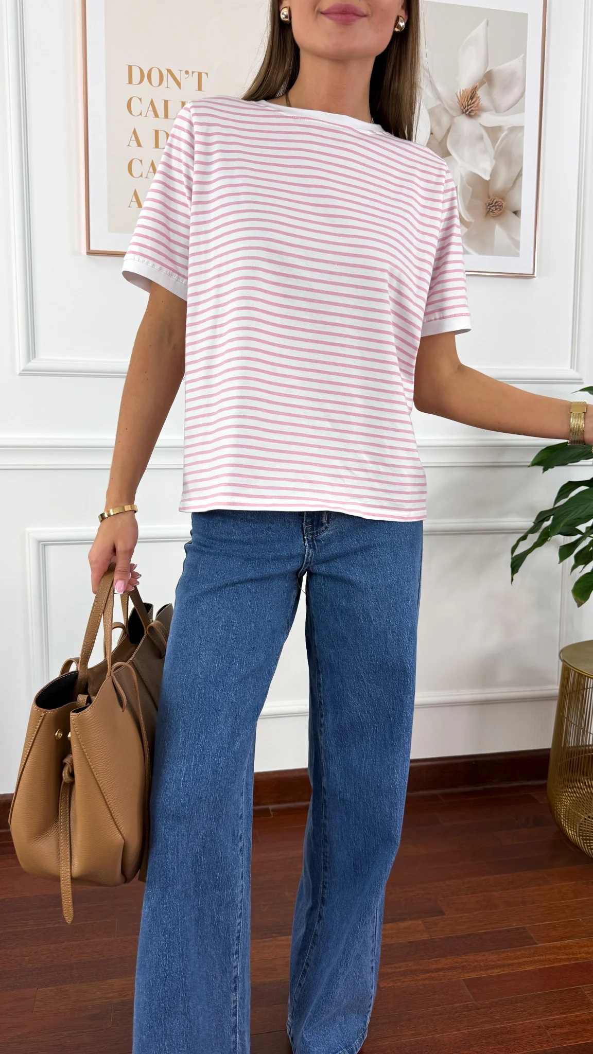 Model sprawdzi się na sylwetkę w rozmiarze od S do XL. Basicowy oversizowy t-shirt z okrągłym dekoltem w paski.