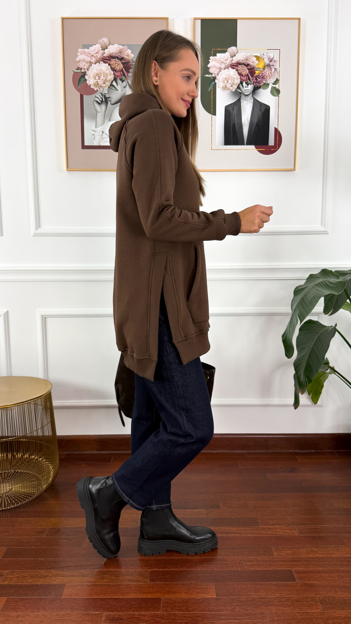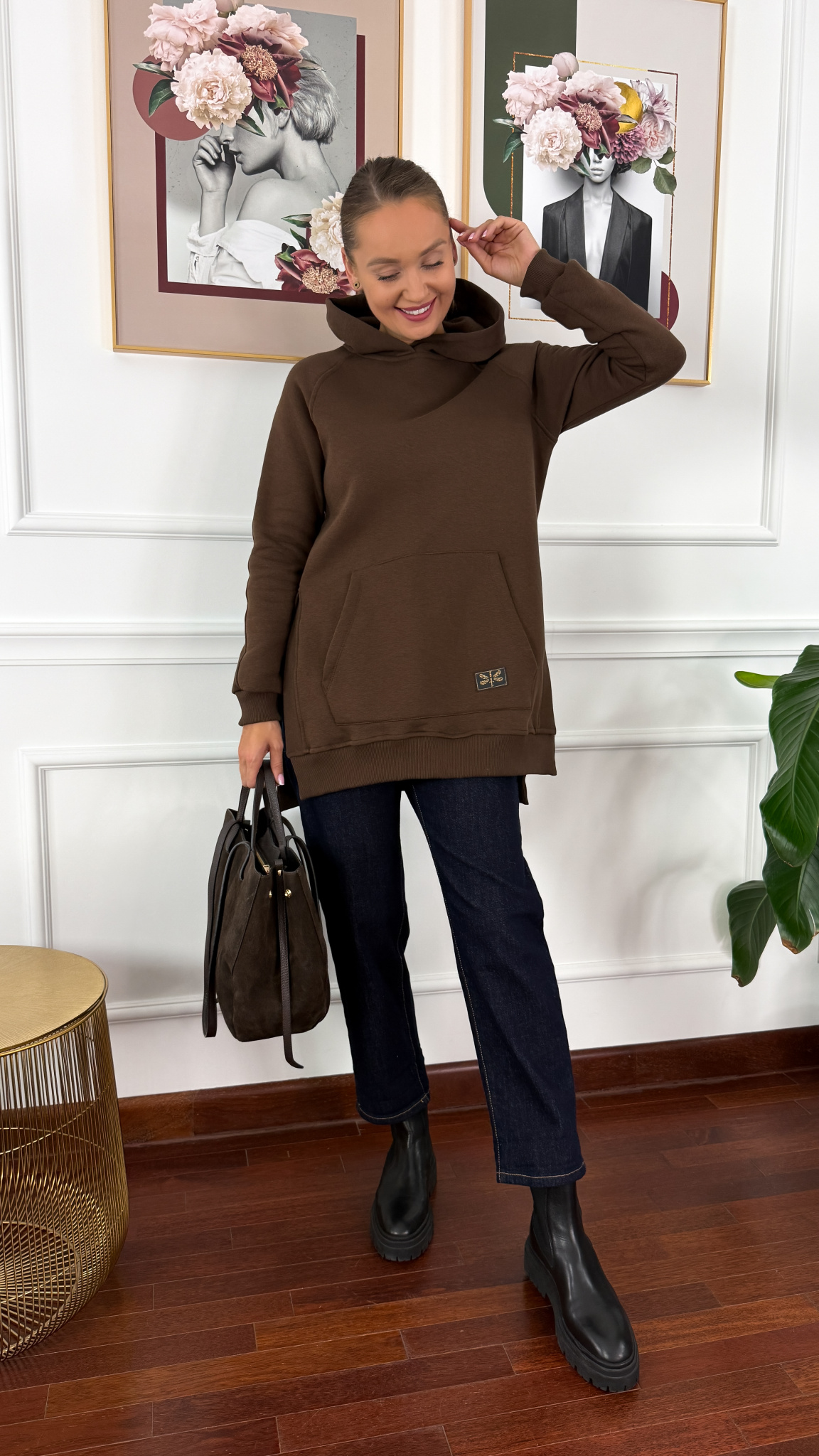 Model sprawdzi się na sylwetkę od XS/S do małej L. Bawełniany bluza dresowy. Bluza kangurka o oversize'owym fasonie z rozcięciami po bokach. Rękaw oraz dół zakończony ściągaczem. Bluza wykonany z grubszego materiału.