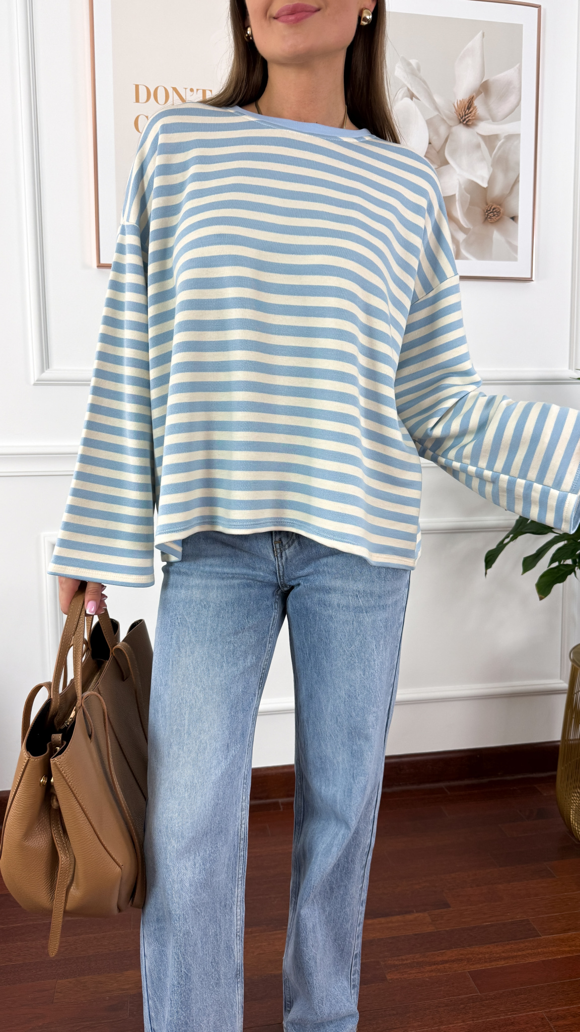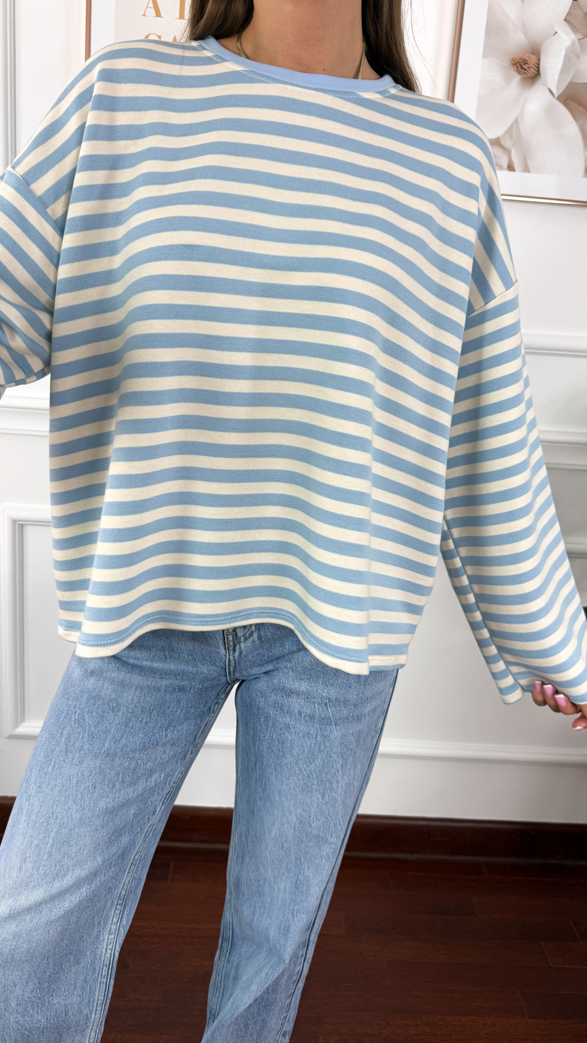 Bluza sprawdzi się na sylwetkę w rozmiarze od S do XL. Oversizowa bluza z okrągłym dekoltem i rozszerzanymi rękawami.