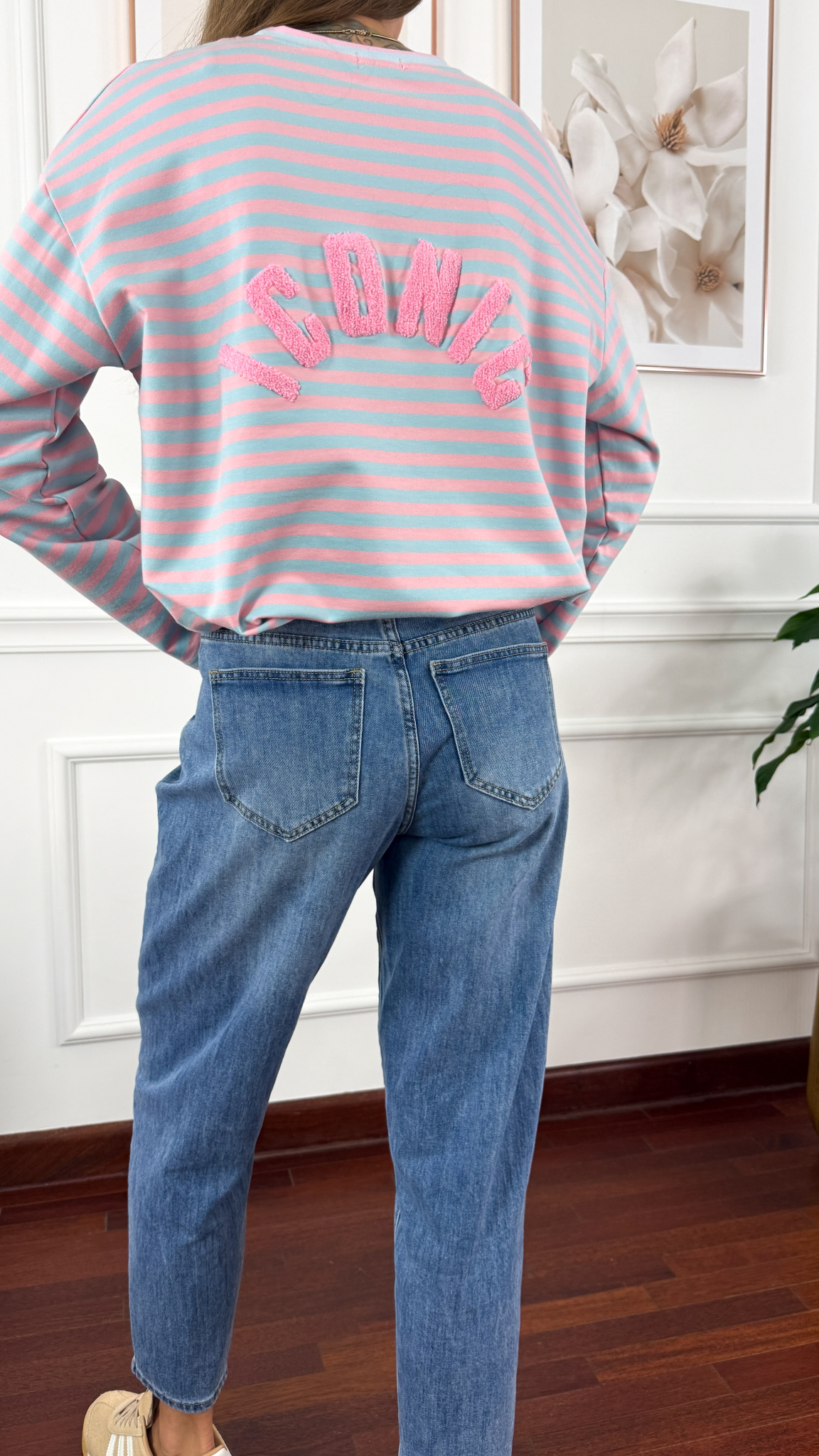 Bluza sprawdzi się na sylwetkę w rozmiarze od S do L. Oversizowa bluza z okrągłym dekoltem i rozszerzanymi rękawami. Na plecach występuje napis ICONIC.