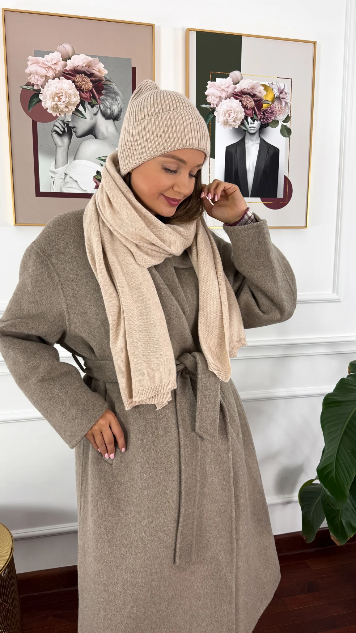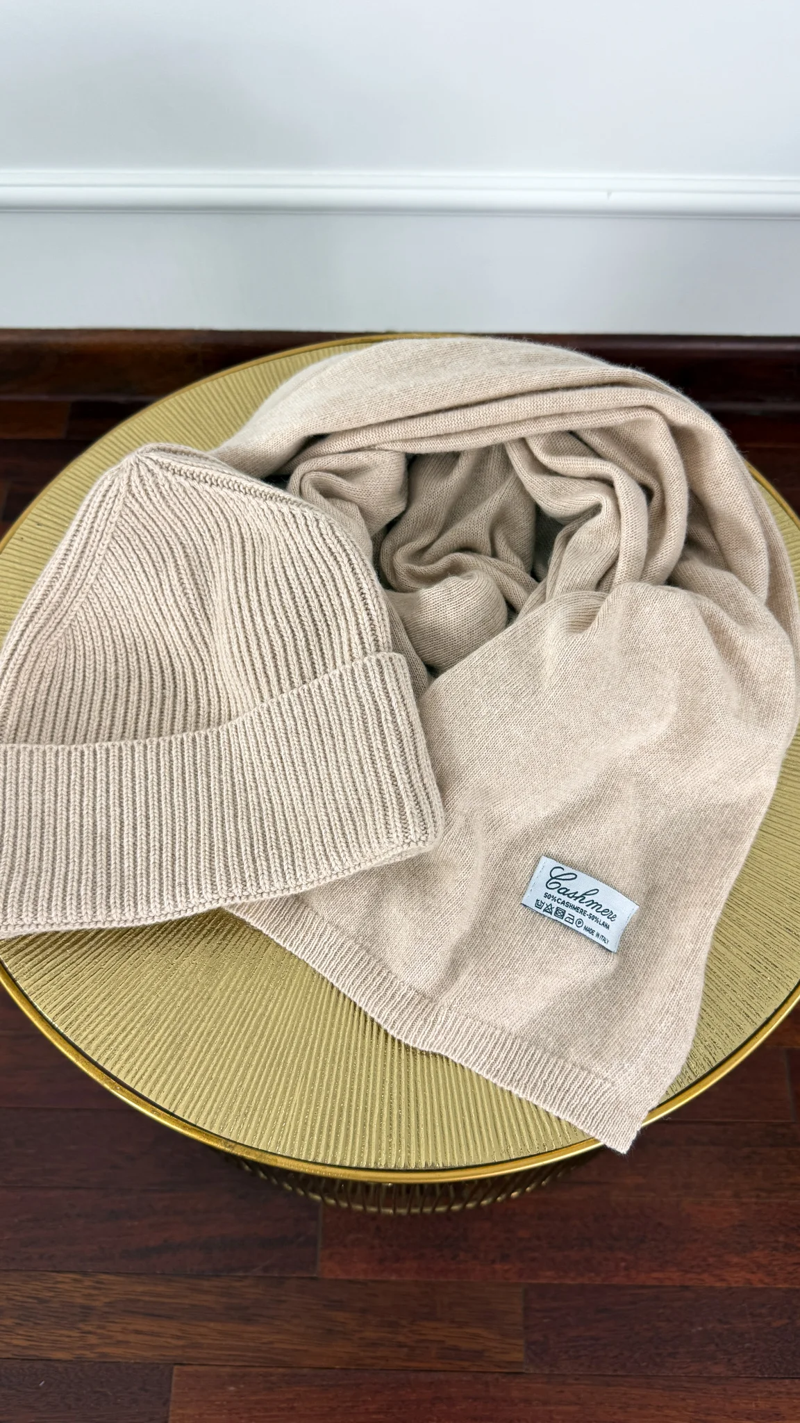 Kaszmirowo-wełniany komplet czapka i szal Winter beżowy