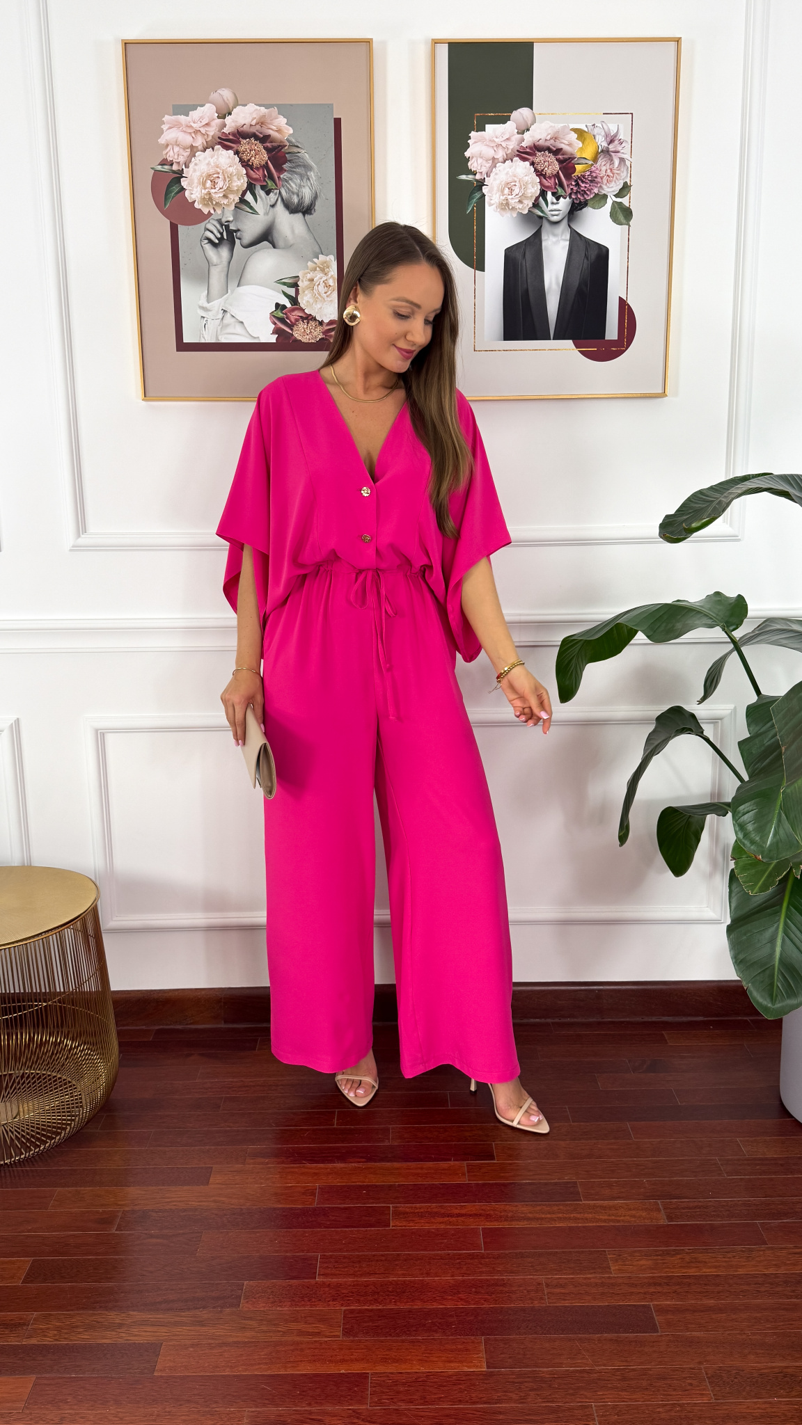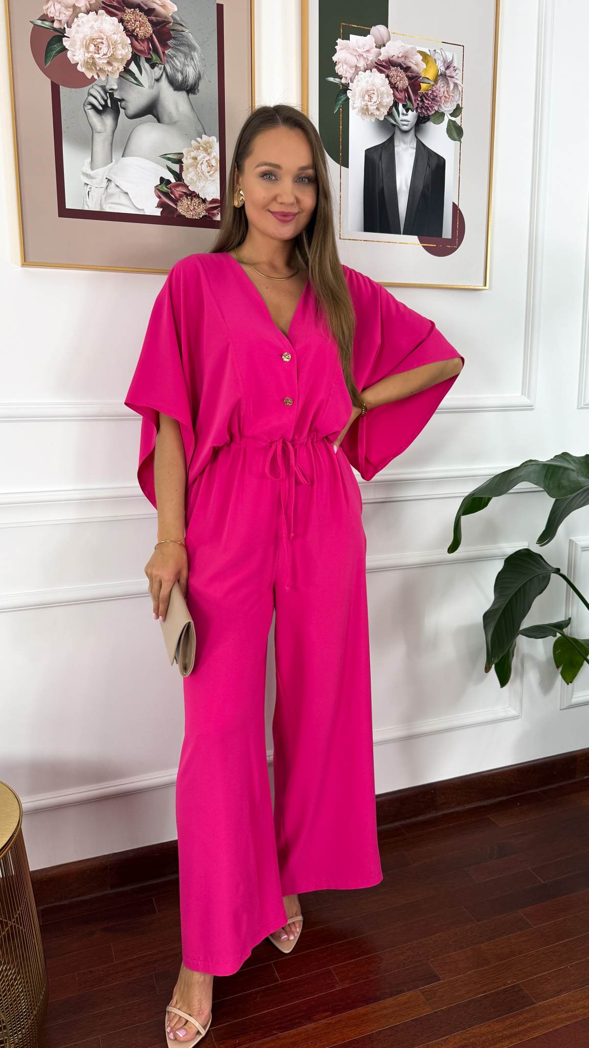 Wiskozowy kombinezon polskiej produkcji. Dekolt w serek. Od przodu zapinany na pozłacane guziki. W talii wszyto troczek.