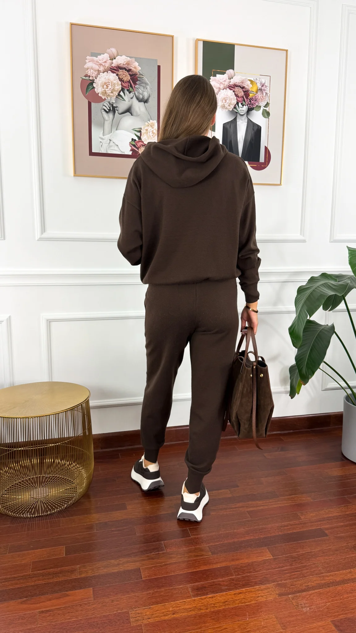 Dzianinowy komplet składający się z swetra oraz spodni. Materiał jest niezwykle przyjemny w dotyku. Oversizowa bluza kangurka z kapturem. Spodnie z wyższym stanem w pasie mają wszytą gumkę.. Komplet idealnie sprawdzi się w chłodniejsze dni.
