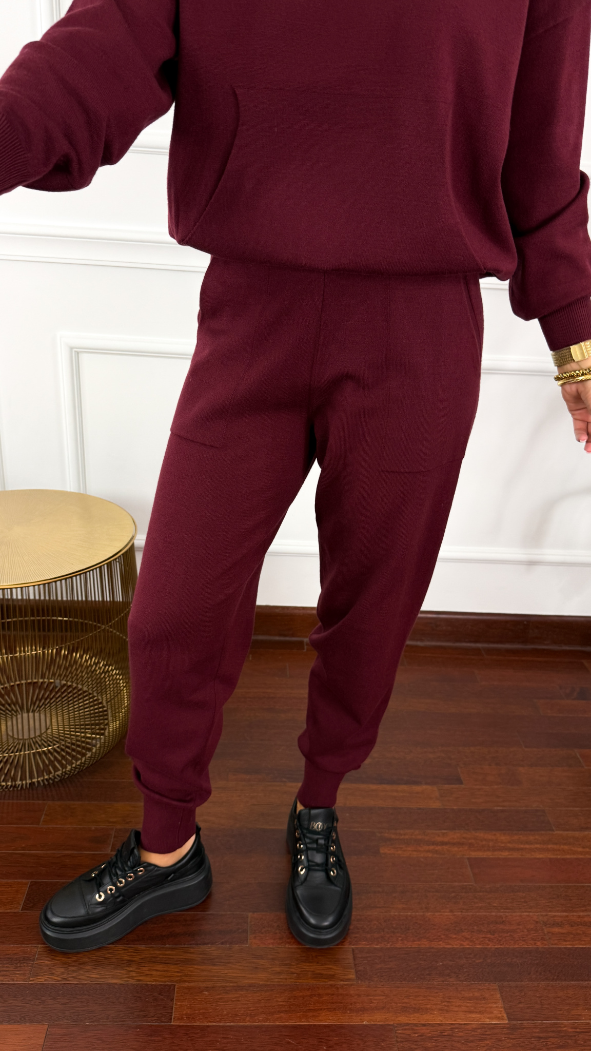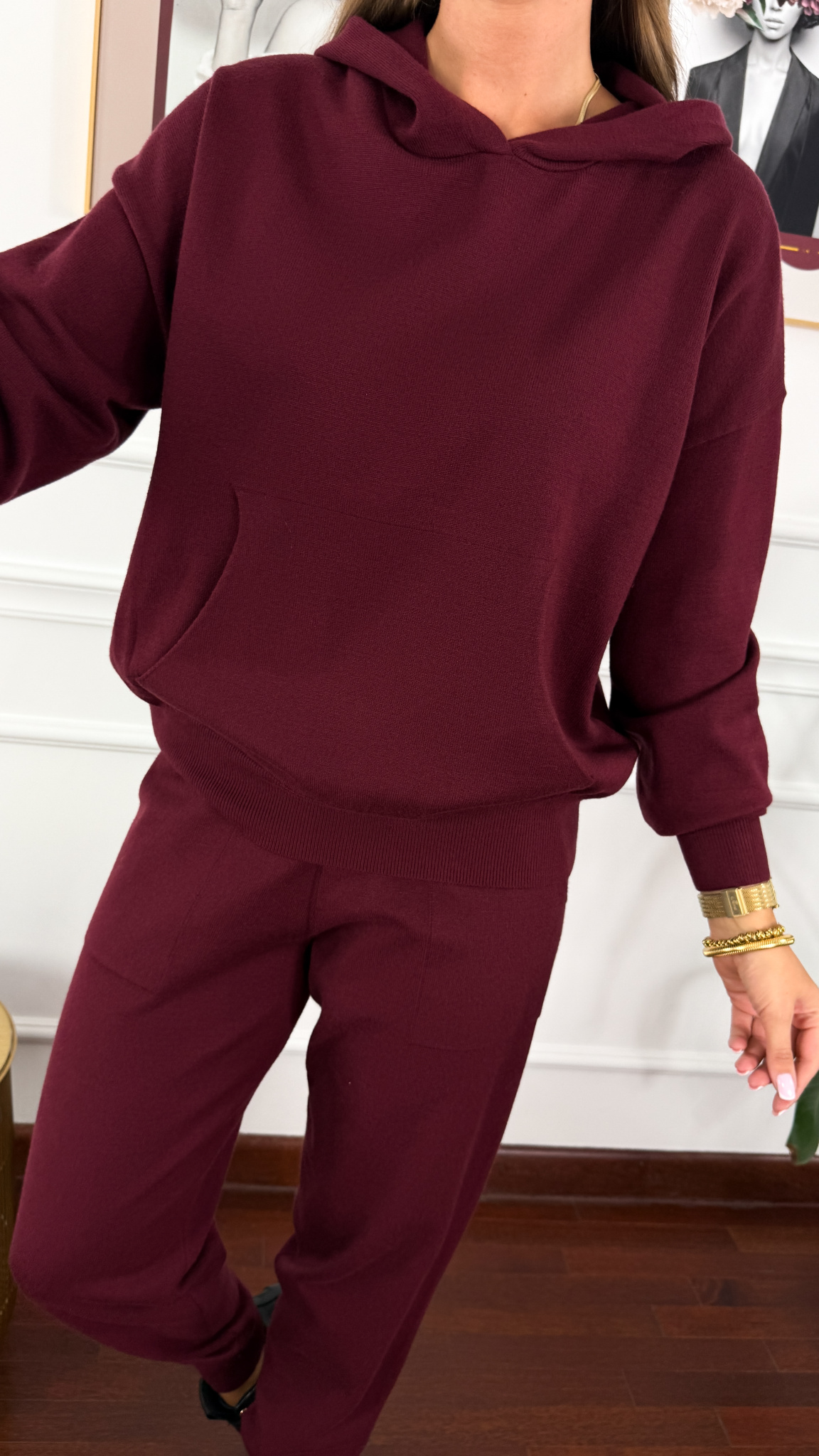 Dzianinowy komplet składający się z swetra oraz spodni. Materiał jest niezwykle przyjemny w dotyku. Oversizowa bluza kangurka z kapturem. Spodnie z wyższym stanem w pasie mają wszytą gumkę.. Komplet idealnie sprawdzi się w chłodniejsze dni.