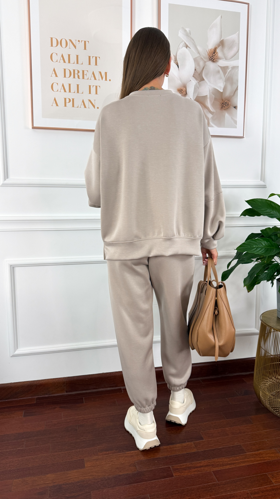 Model sprawdzi się na sylwetkę od S do XL. Wiskozowy komplet dresowy. Bluza o oversize'owym fasonie wkładana przez głowę. Spodnie z nogawką zakończona na dole ściagaczem. W pasie wszyto gumę oraz posiada sznurek do związania. Posiada praktyczne kieszonki.