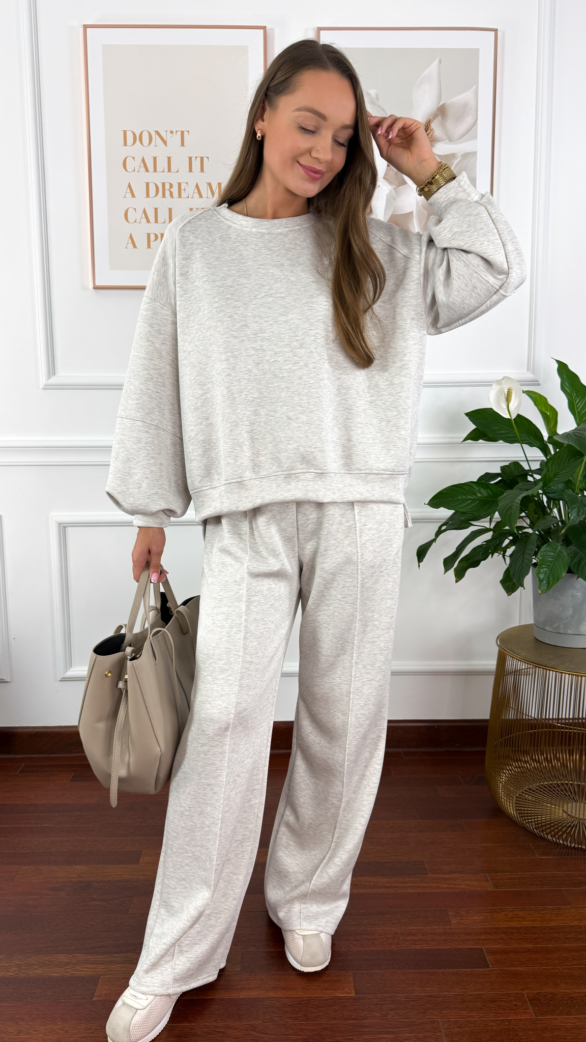 Model sprawdzi się na sylwetkę od S do XL. Wiskozowy komplet dresowy. Bluza o oversize'owym fasonie wkładana przez głowę. Spodnie z prosta nogawką. W pasie wszyto gumę oraz posiada sznurek do związania. Posiada praktyczne kieszonki.