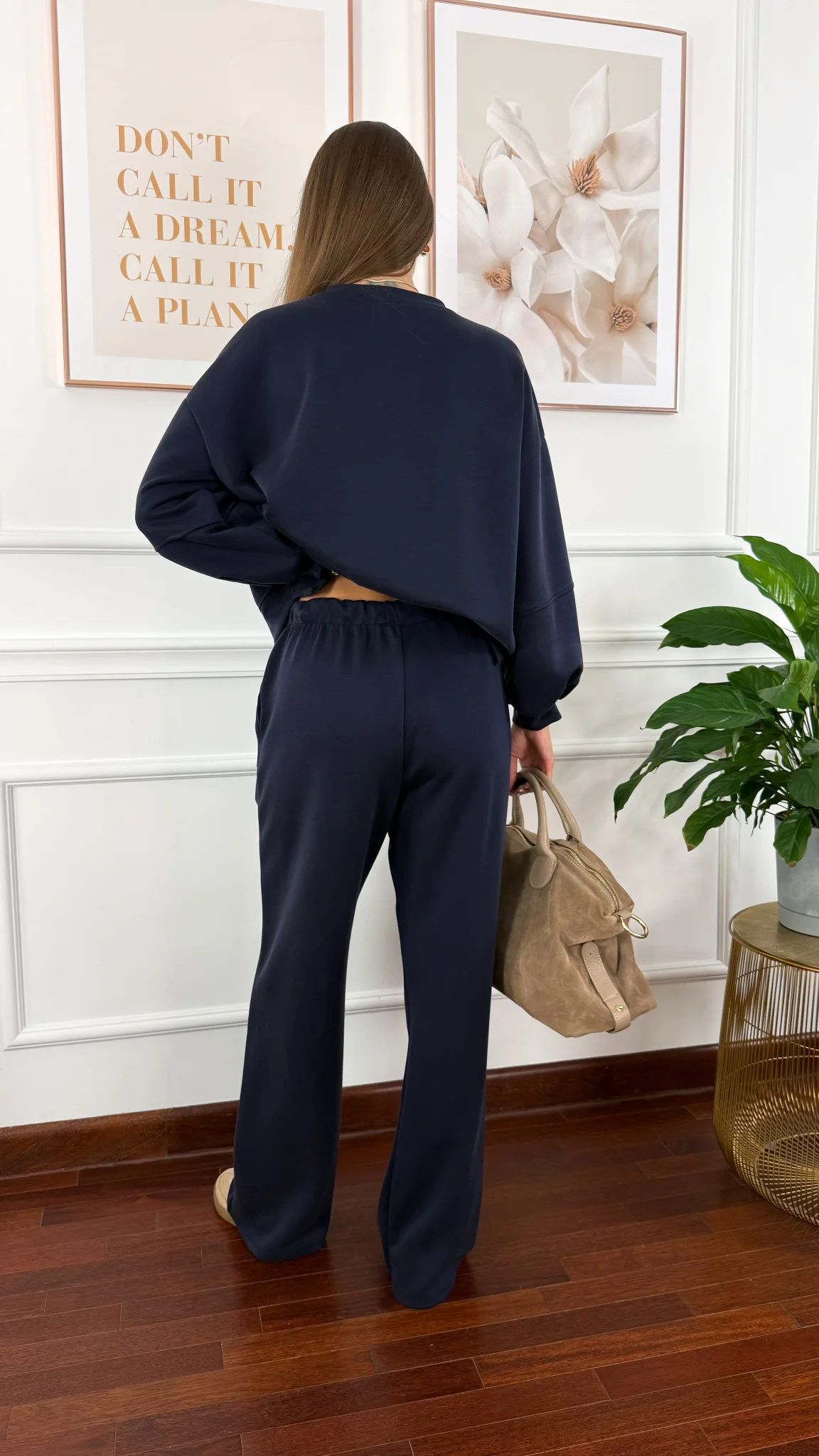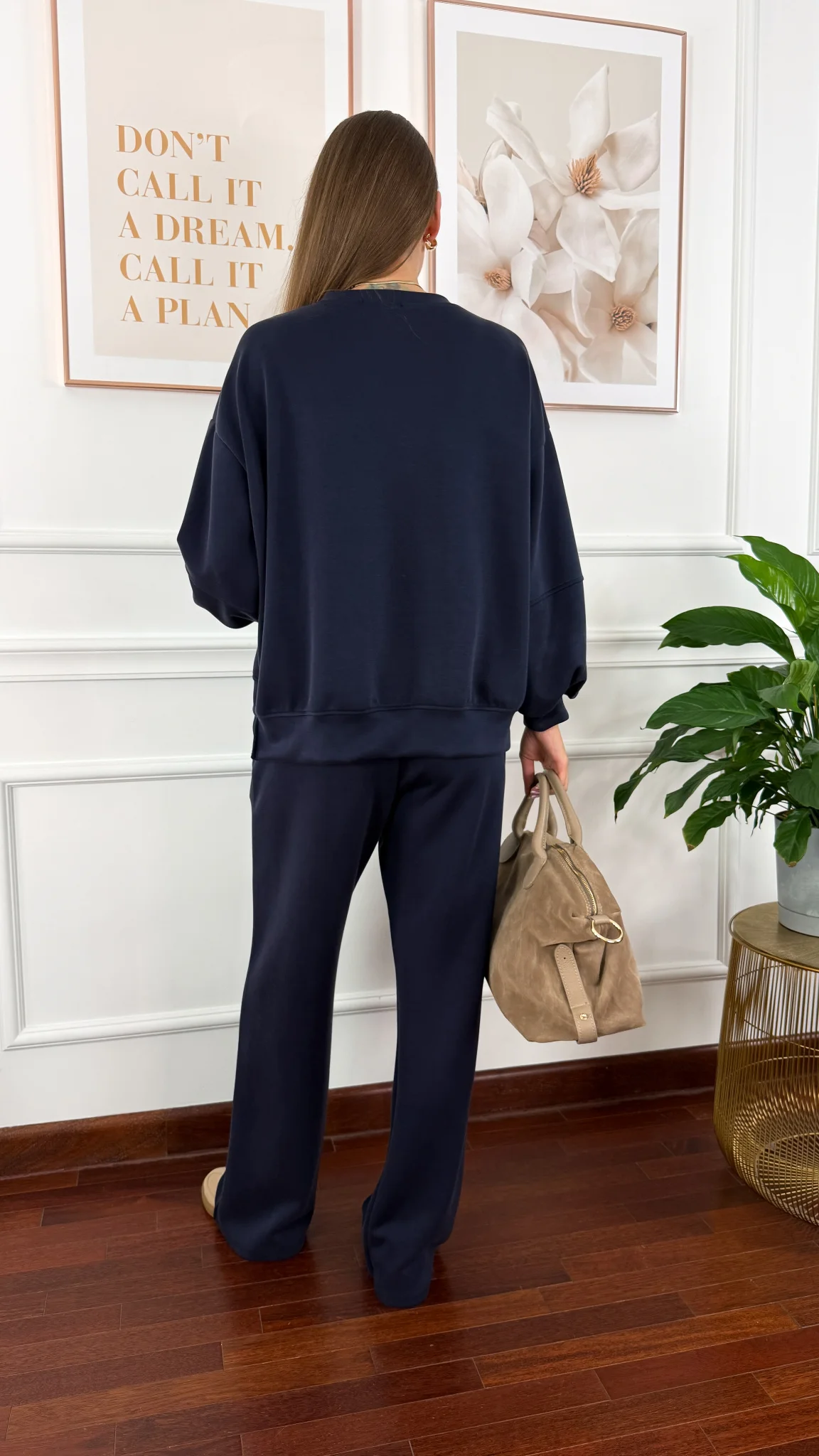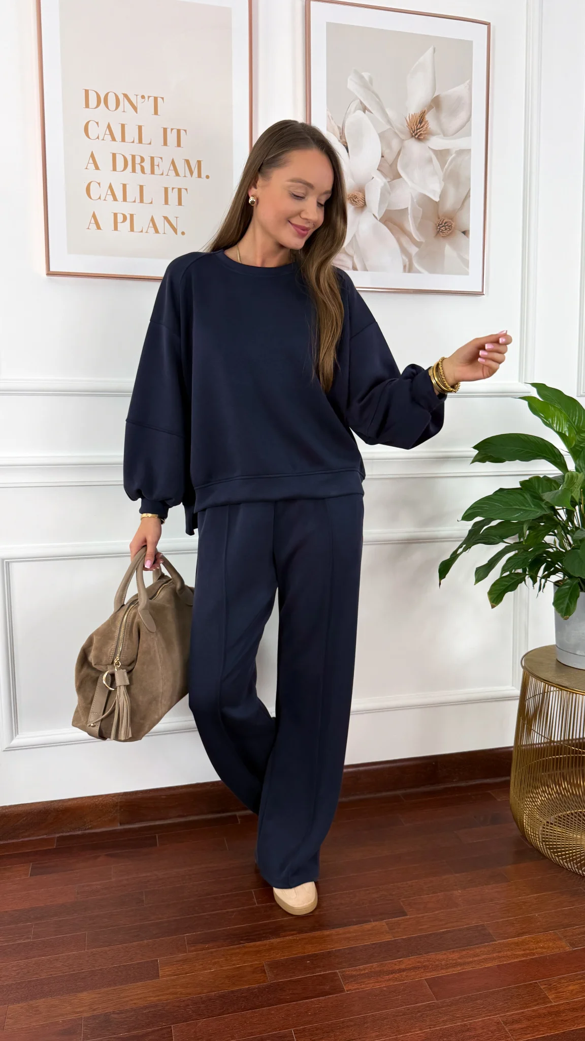 Model sprawdzi się na sylwetkę od S do XL. Wiskozowy komplet dresowy. Bluza o oversize'owym fasonie wkładana przez głowę. Spodnie z prosta nogawką. W pasie wszyto gumę oraz posiada sznurek do związania. Posiada praktyczne kieszonki.