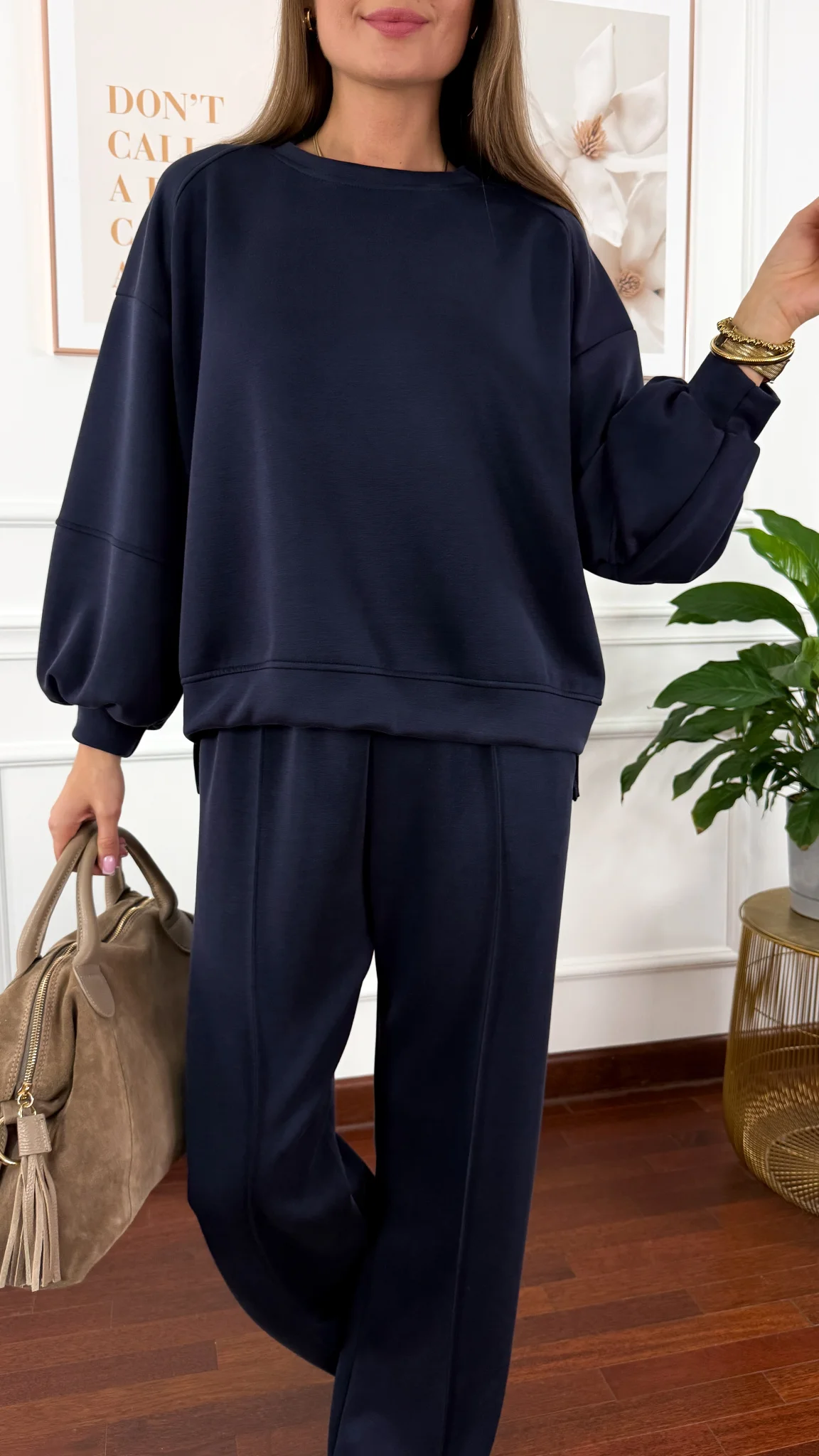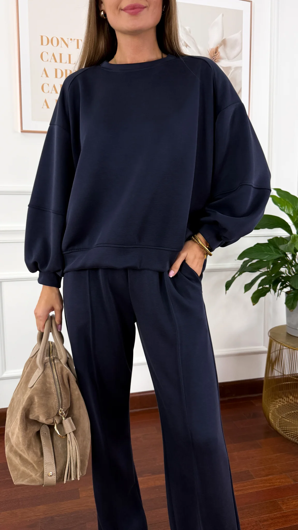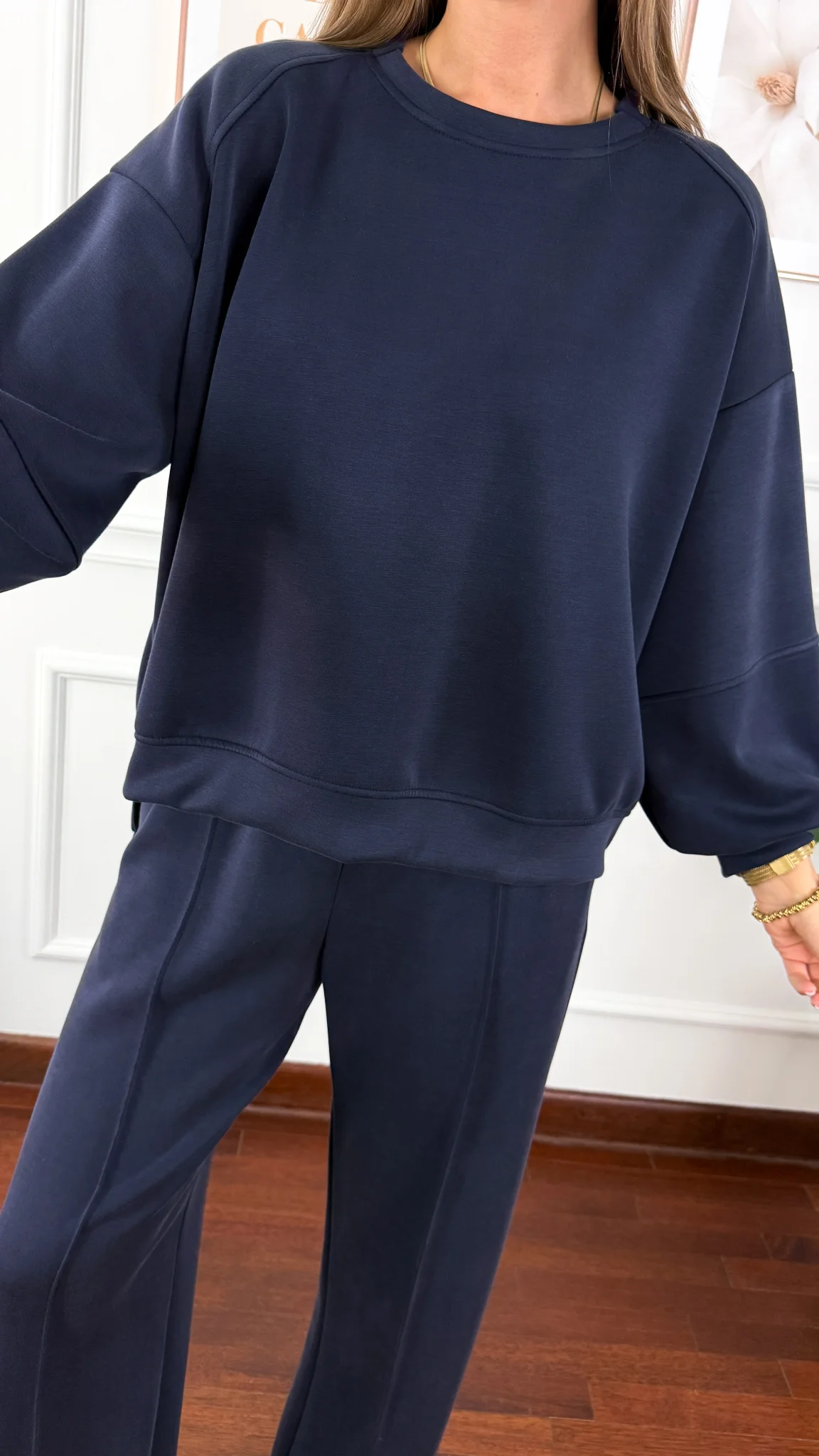 Model sprawdzi się na sylwetkę od S do XL. Wiskozowy komplet dresowy. Bluza o oversize'owym fasonie wkładana przez głowę. Spodnie z prosta nogawką. W pasie wszyto gumę oraz posiada sznurek do związania. Posiada praktyczne kieszonki.