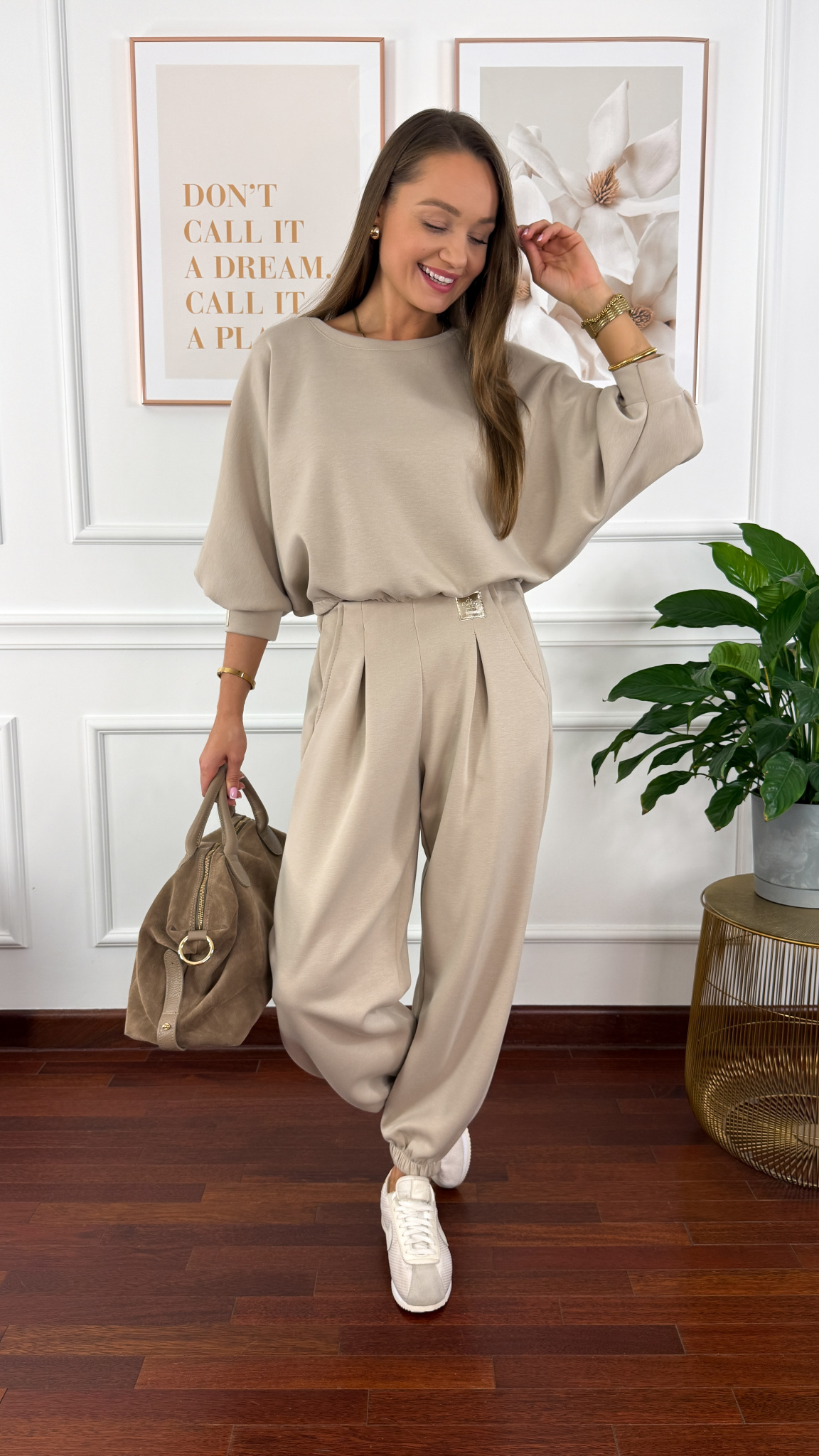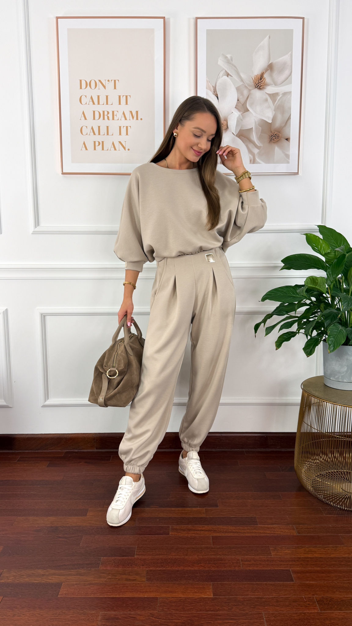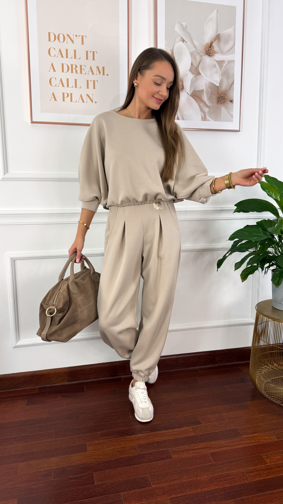 Model sprawdzi się na sylwetkę od S do L. Wiskozowy komplet dresowy. Bluza o oversize'owym fasonie wkładana przez głowę zakończona gumką. Rękaw 7/8 nietoperz. Spodnie zakończone ściągaczem. W pasie wszyto gumę oraz posiada sznurek do związania. Posiada praktyczne kieszonki.