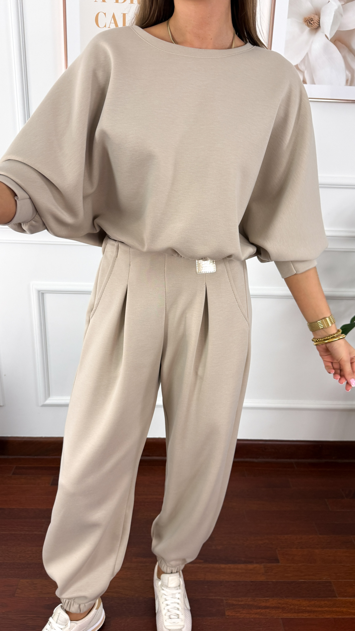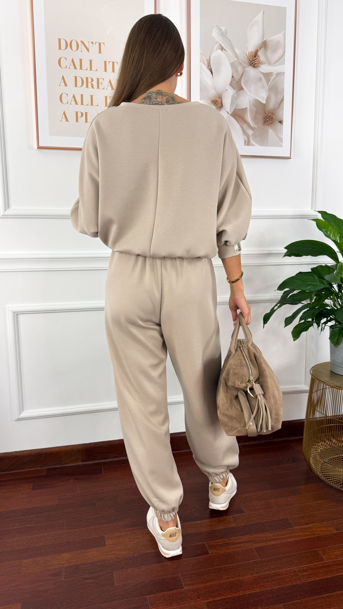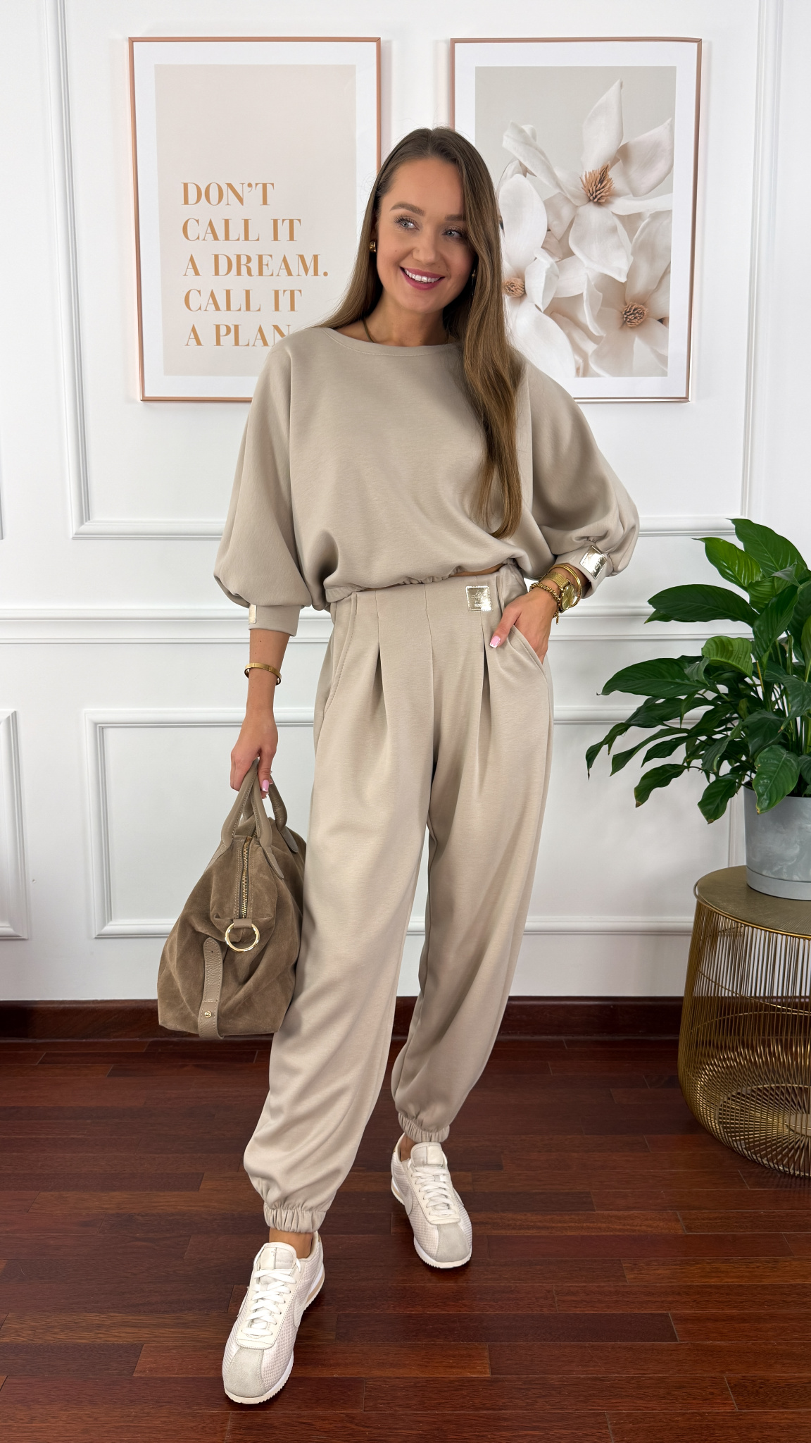 Model sprawdzi się na sylwetkę od S do L. Wiskozowy komplet dresowy. Bluza o oversize'owym fasonie wkładana przez głowę zakończona gumką. Rękaw 7/8 nietoperz. Spodnie zakończone ściągaczem. W pasie wszyto gumę oraz posiada sznurek do związania. Posiada praktyczne kieszonki.