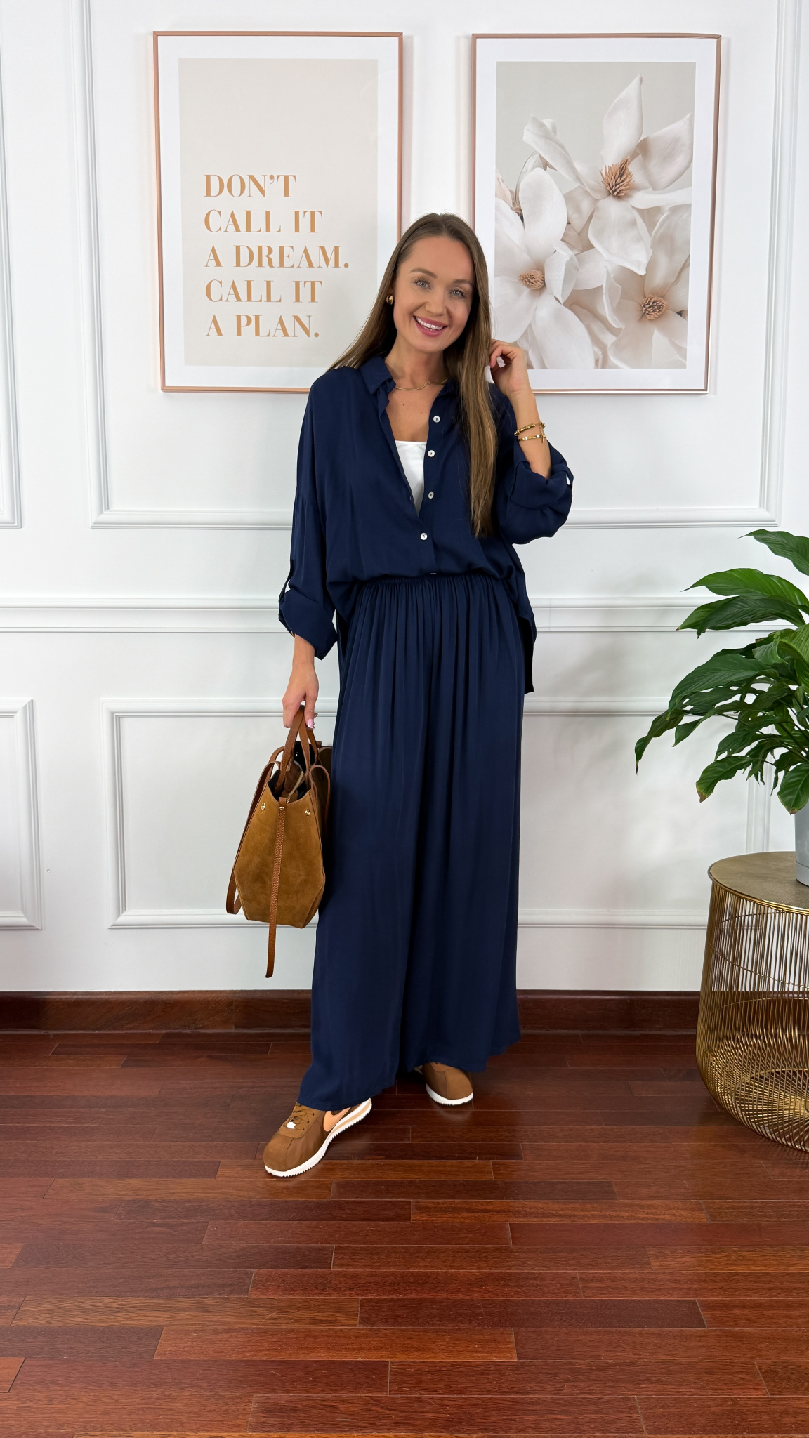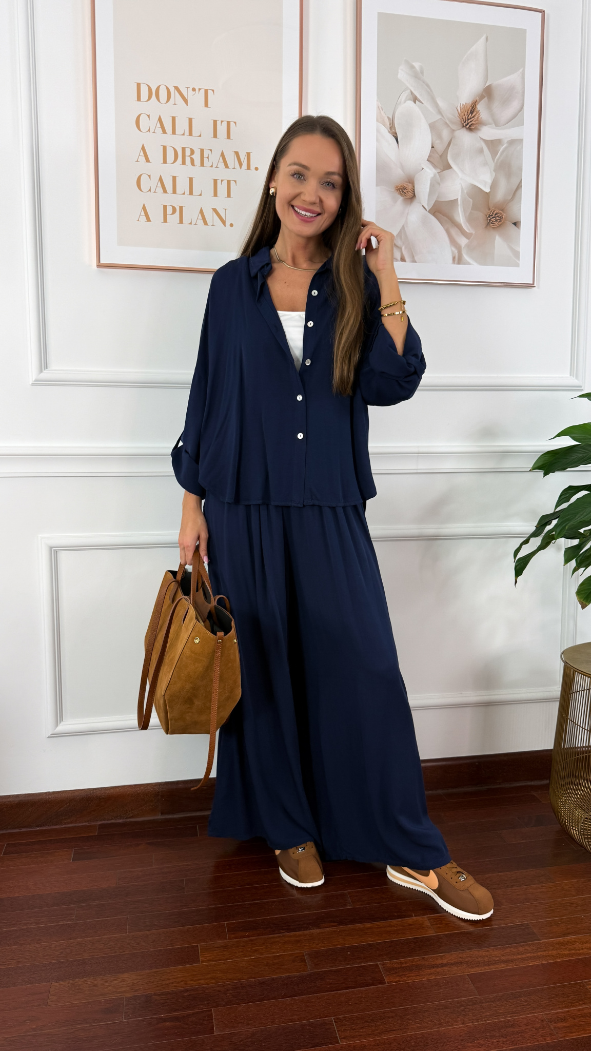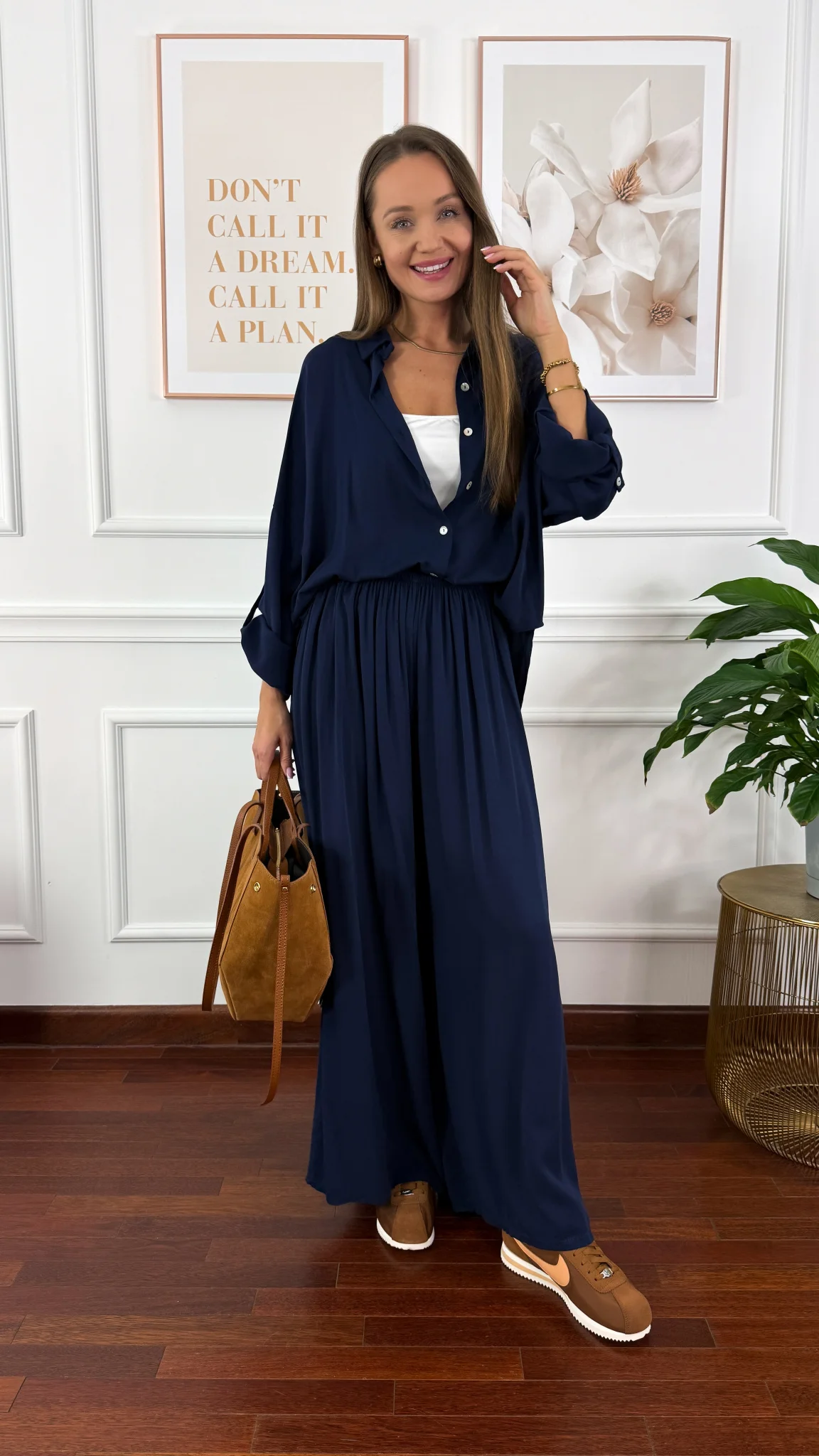 Model sprawdzi się na sylwetkę od S do XL. Wiskozowy komplet składający się z koszuli oraz spodni. Materiał jest lejący oraz niezwykle przyjemny w dotyku. Oversizowa koszula z przodu krótsza, z tyłu dłuższa. Rękawy można podwinąć i zapiąć na guzik. Spodnie mają wszytą gumkę w pasie. Nogawki są bardzo szerokie. Komplet idealnie sprawdzi się w cieplejsze dni.