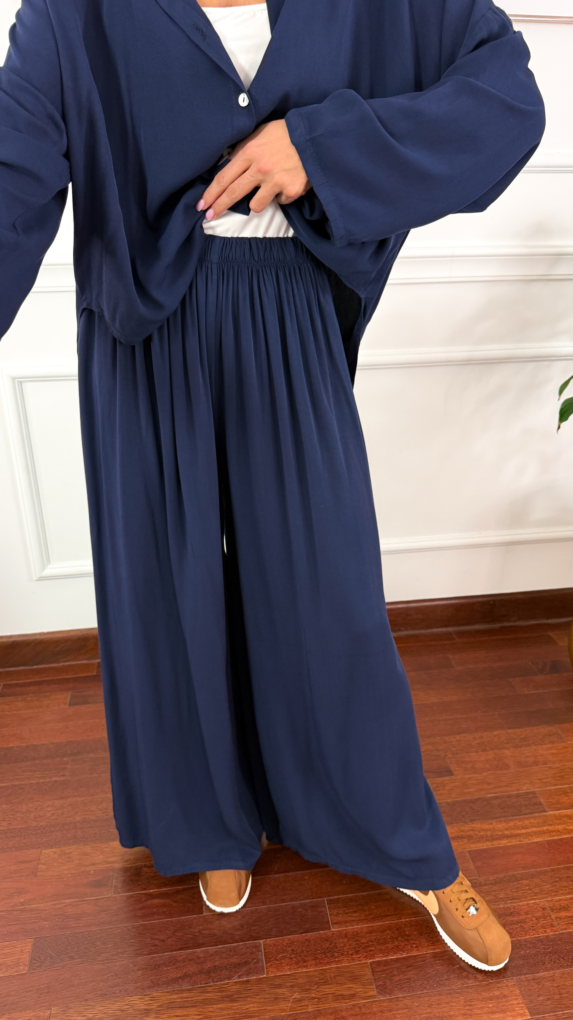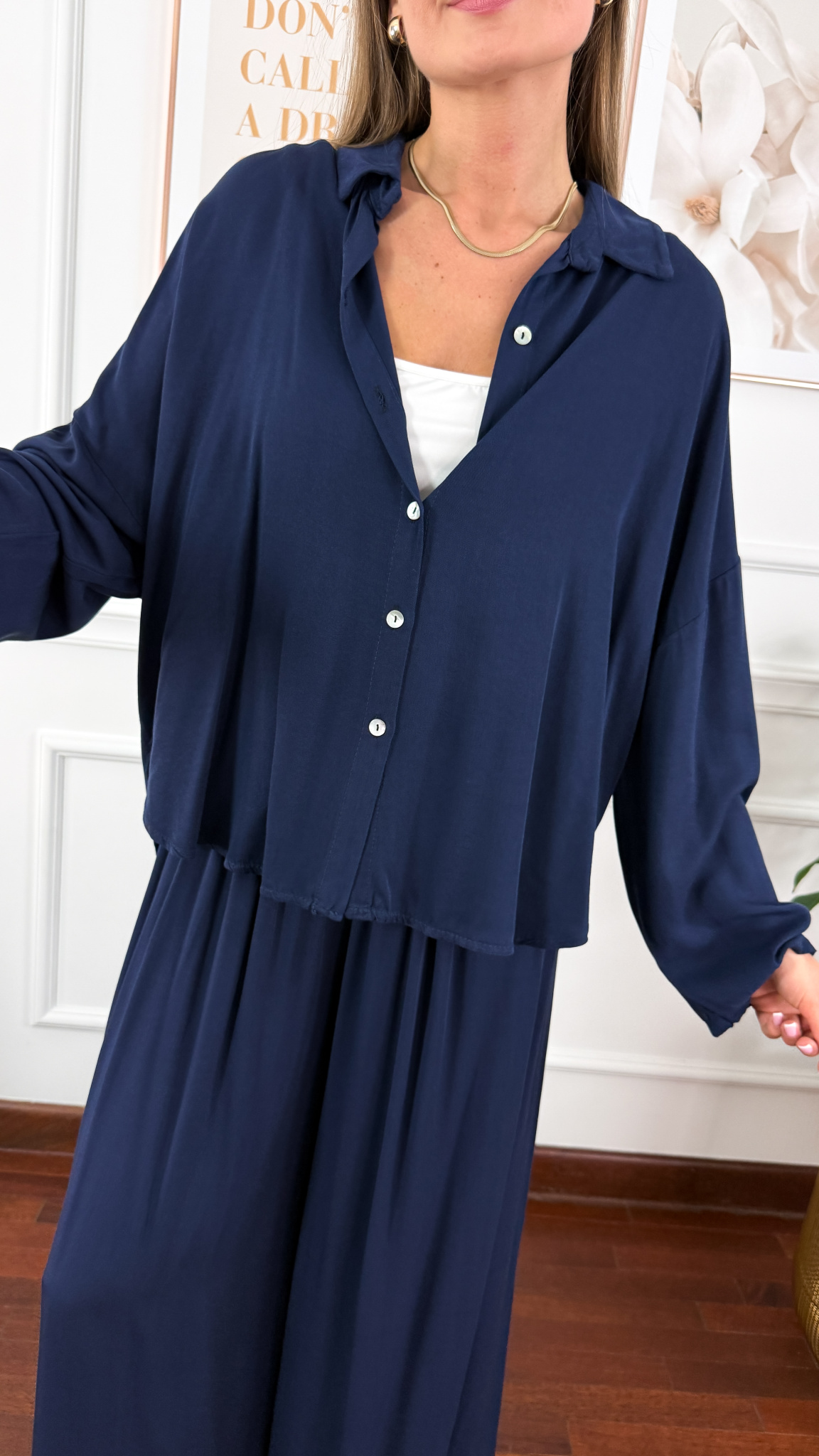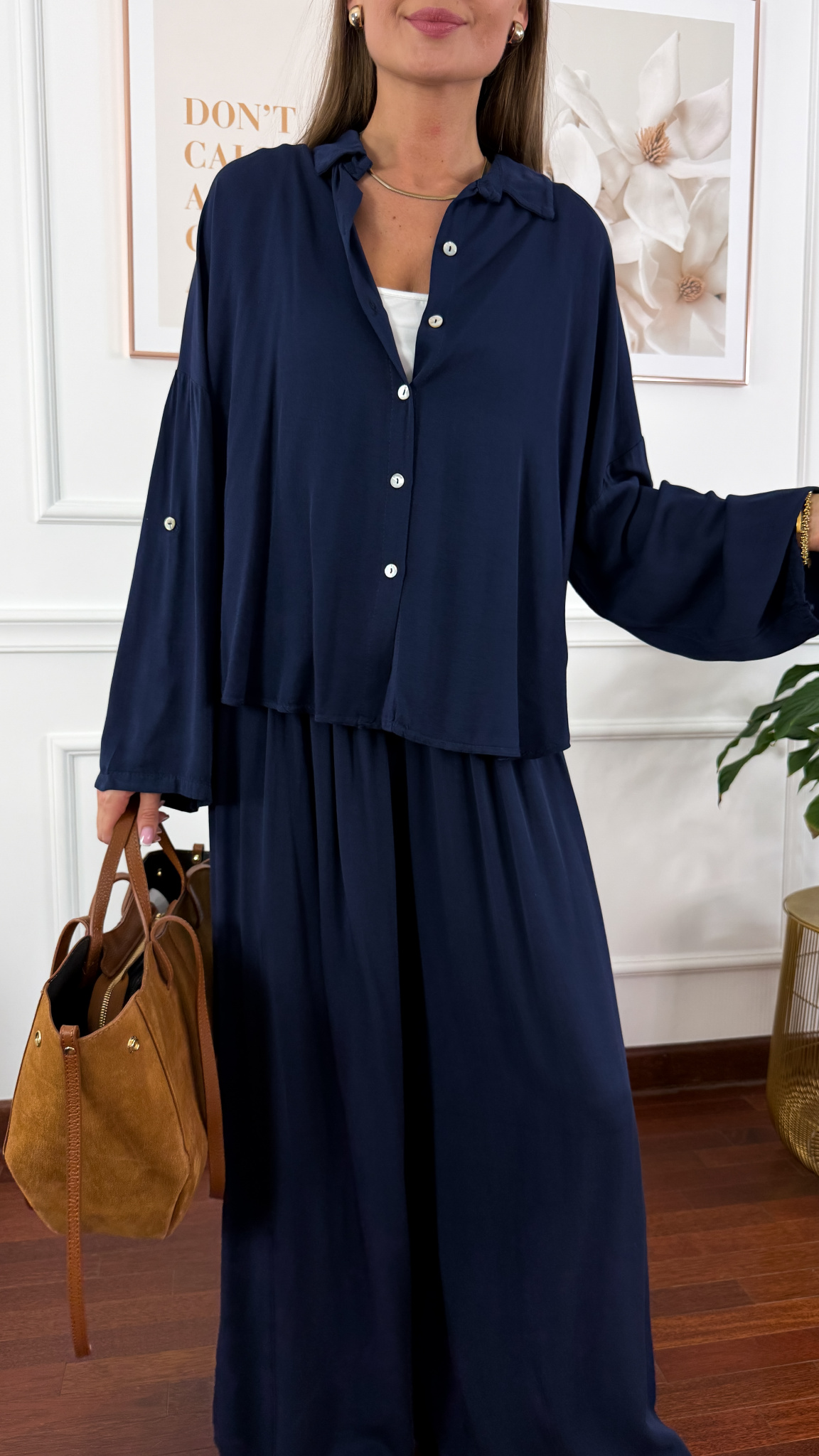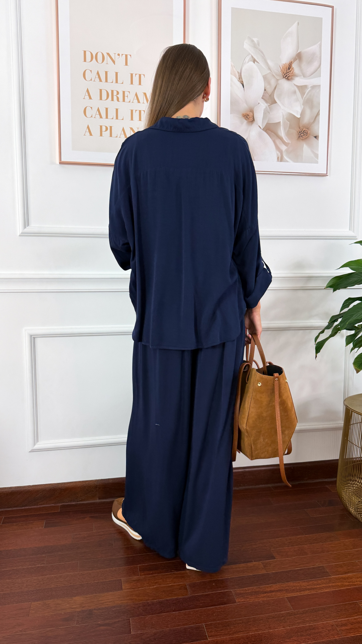 Model sprawdzi się na sylwetkę od S do XL. Wiskozowy komplet składający się z koszuli oraz spodni. Materiał jest lejący oraz niezwykle przyjemny w dotyku. Oversizowa koszula z przodu krótsza, z tyłu dłuższa. Rękawy można podwinąć i zapiąć na guzik. Spodnie mają wszytą gumkę w pasie. Nogawki są bardzo szerokie. Komplet idealnie sprawdzi się w cieplejsze dni.