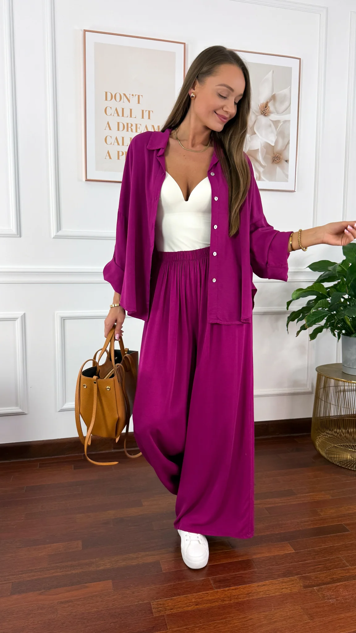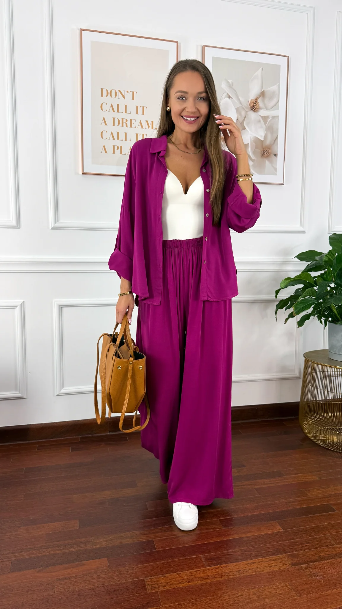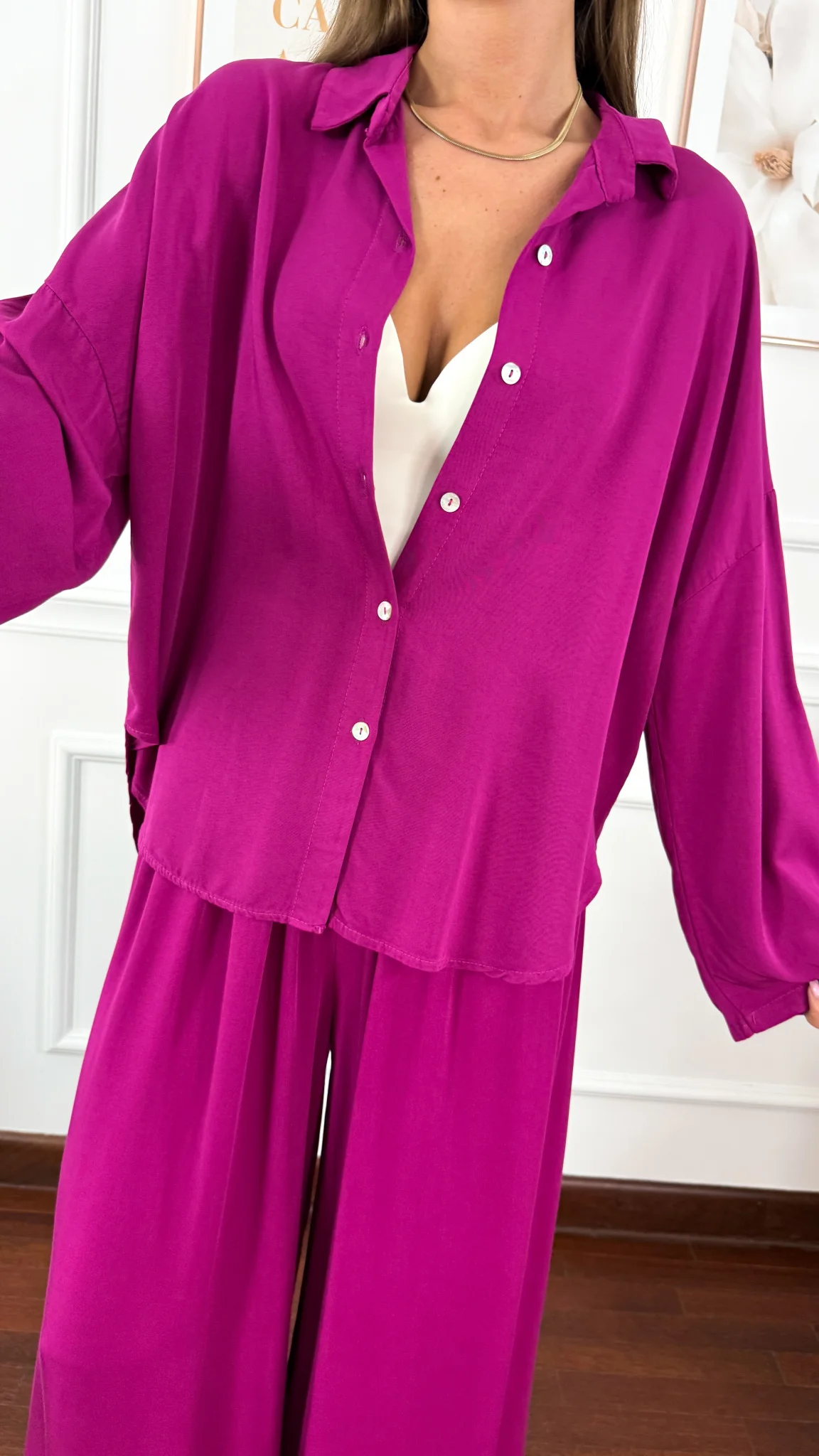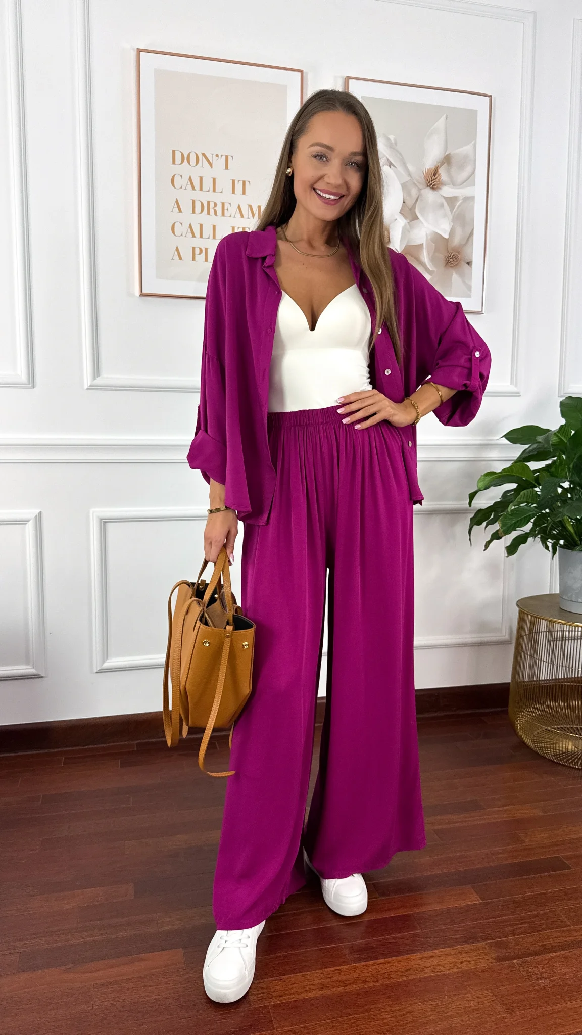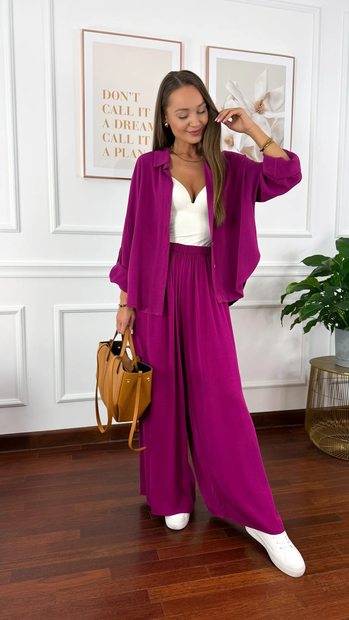 Model sprawdzi się na sylwetkę od S do XL. Wiskozowy komplet składający się z koszuli oraz spodni. Materiał jest lejący oraz niezwykle przyjemny w dotyku. Oversizowa koszula z przodu krótsza, z tyłu dłuższa. Rękawy można podwinąć i zapiąć na guzik. Spodnie mają wszytą gumkę w pasie. Nogawki są bardzo szerokie. Komplet idealnie sprawdzi się w cieplejsze dni.