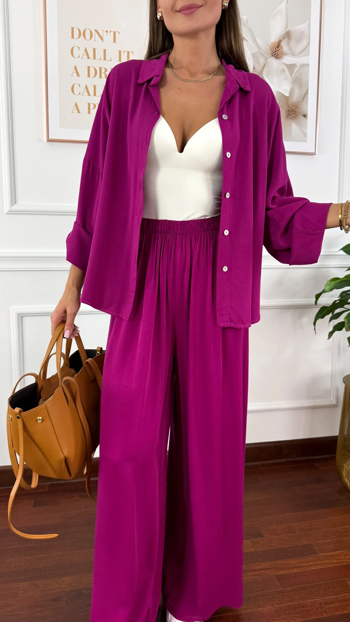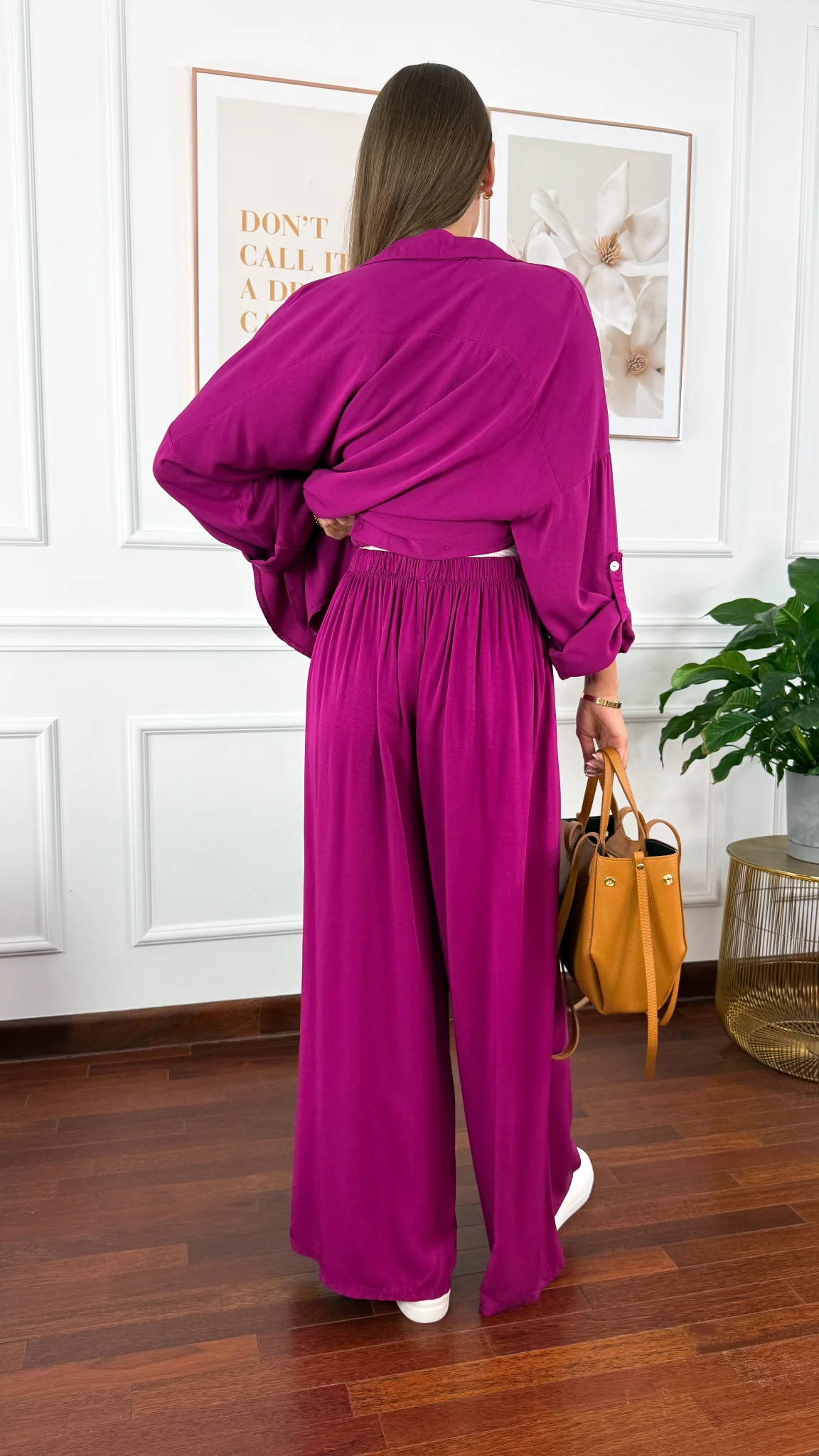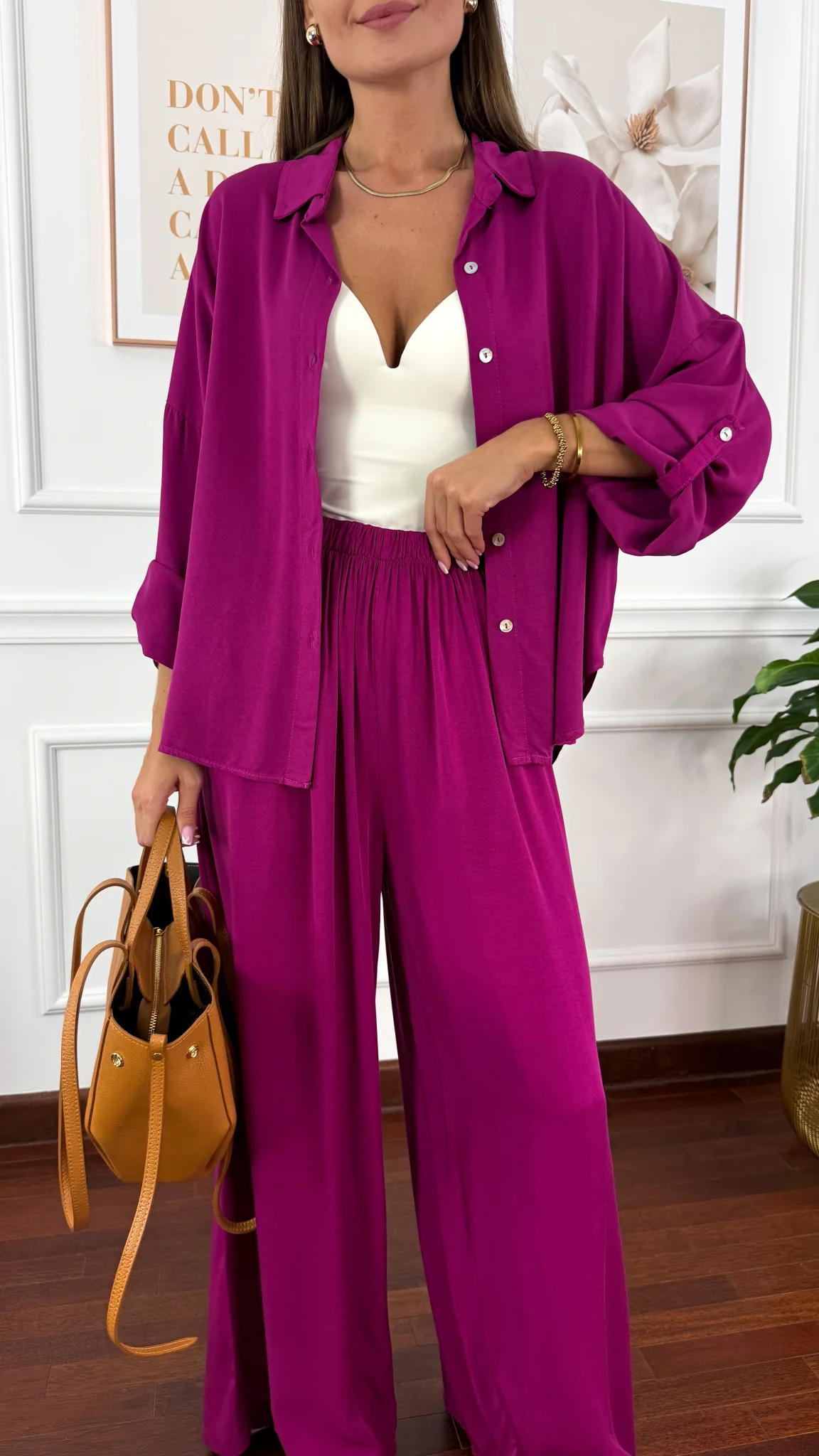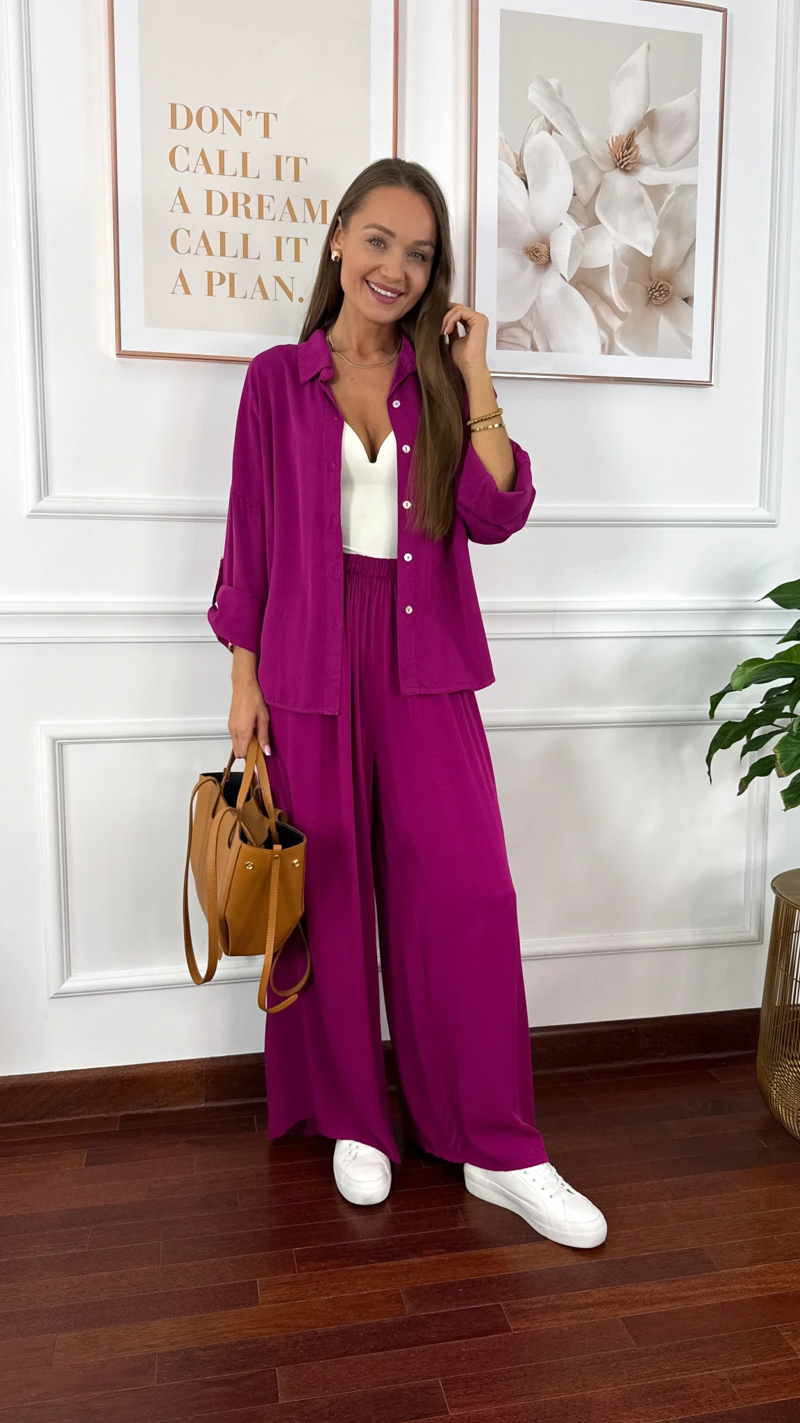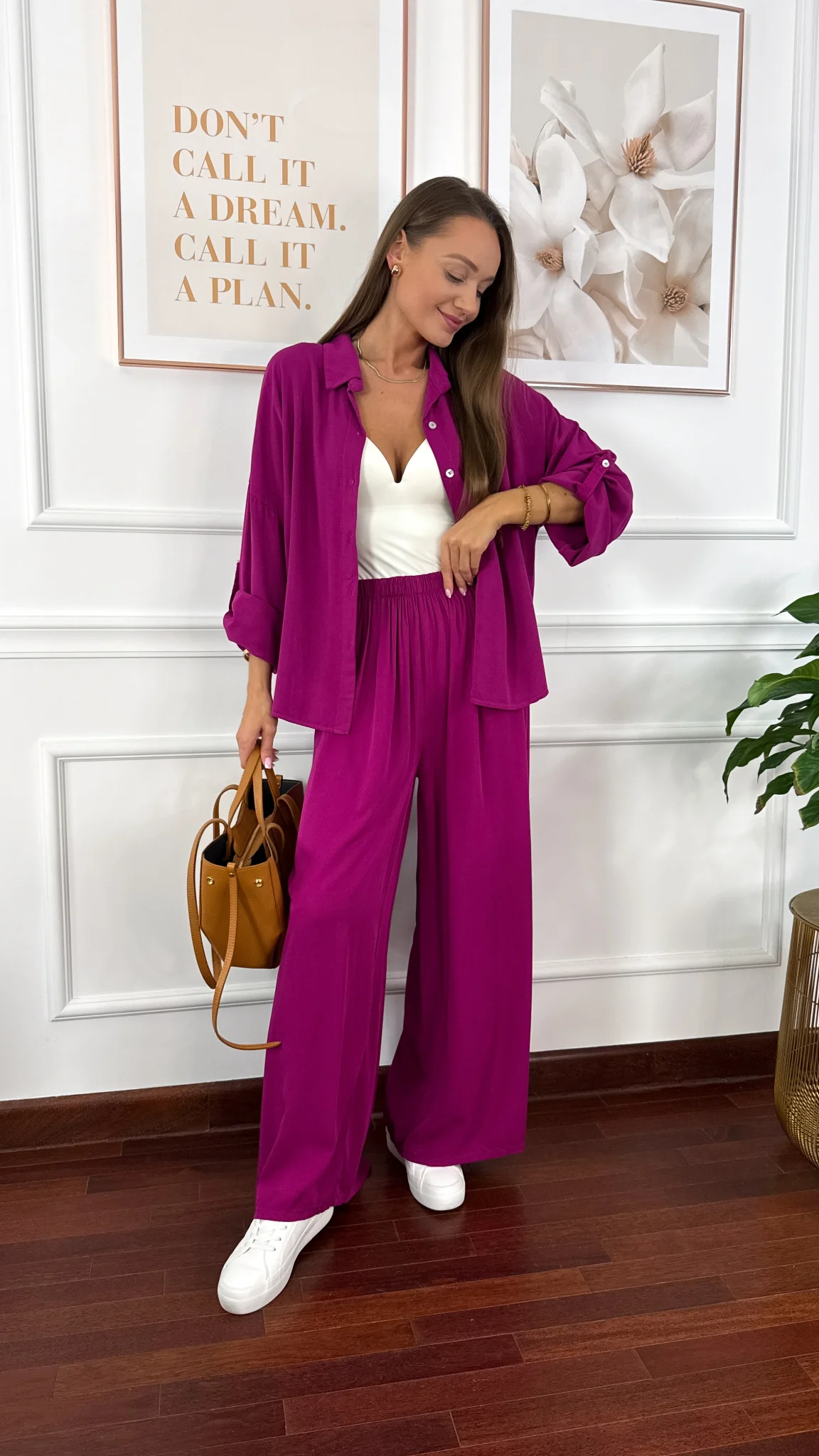 Model sprawdzi się na sylwetkę od S do XL. Wiskozowy komplet składający się z koszuli oraz spodni. Materiał jest lejący oraz niezwykle przyjemny w dotyku. Oversizowa koszula z przodu krótsza, z tyłu dłuższa. Rękawy można podwinąć i zapiąć na guzik. Spodnie mają wszytą gumkę w pasie. Nogawki są bardzo szerokie. Komplet idealnie sprawdzi się w cieplejsze dni.