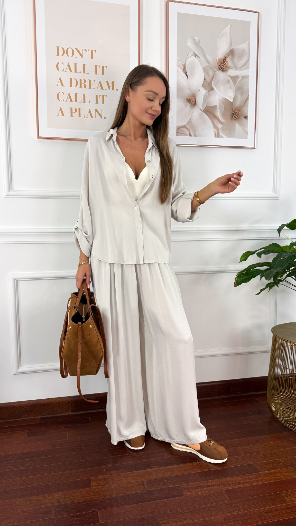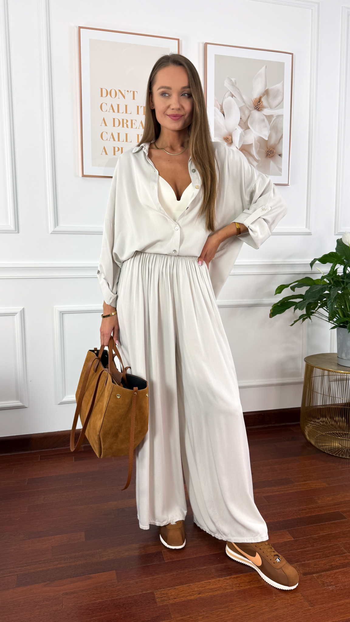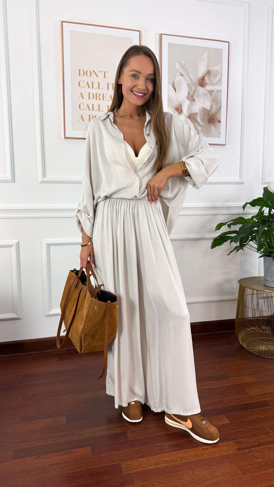Model sprawdzi się na sylwetkę od S do XL. Wiskozowy komplet składający się z koszuli oraz spodni. Materiał jest lejący oraz niezwykle przyjemny w dotyku. Oversizowa koszula z przodu krótsza, z tyłu dłuższa. Rękawy można podwinąć i zapiąć na guzik. Spodnie mają wszytą gumkę w pasie. Nogawki są bardzo szerokie. Komplet idealnie sprawdzi się w cieplejsze dni.