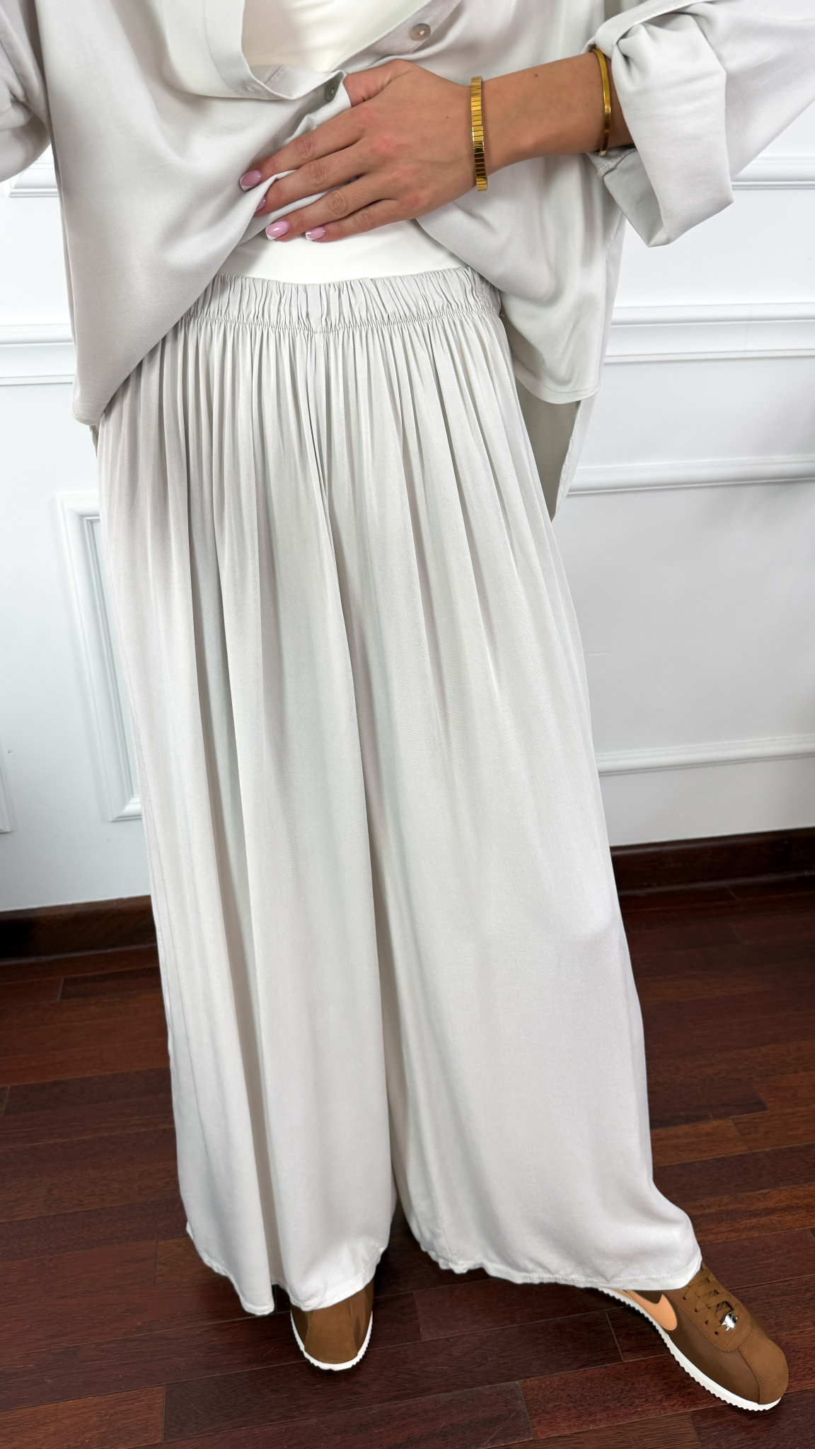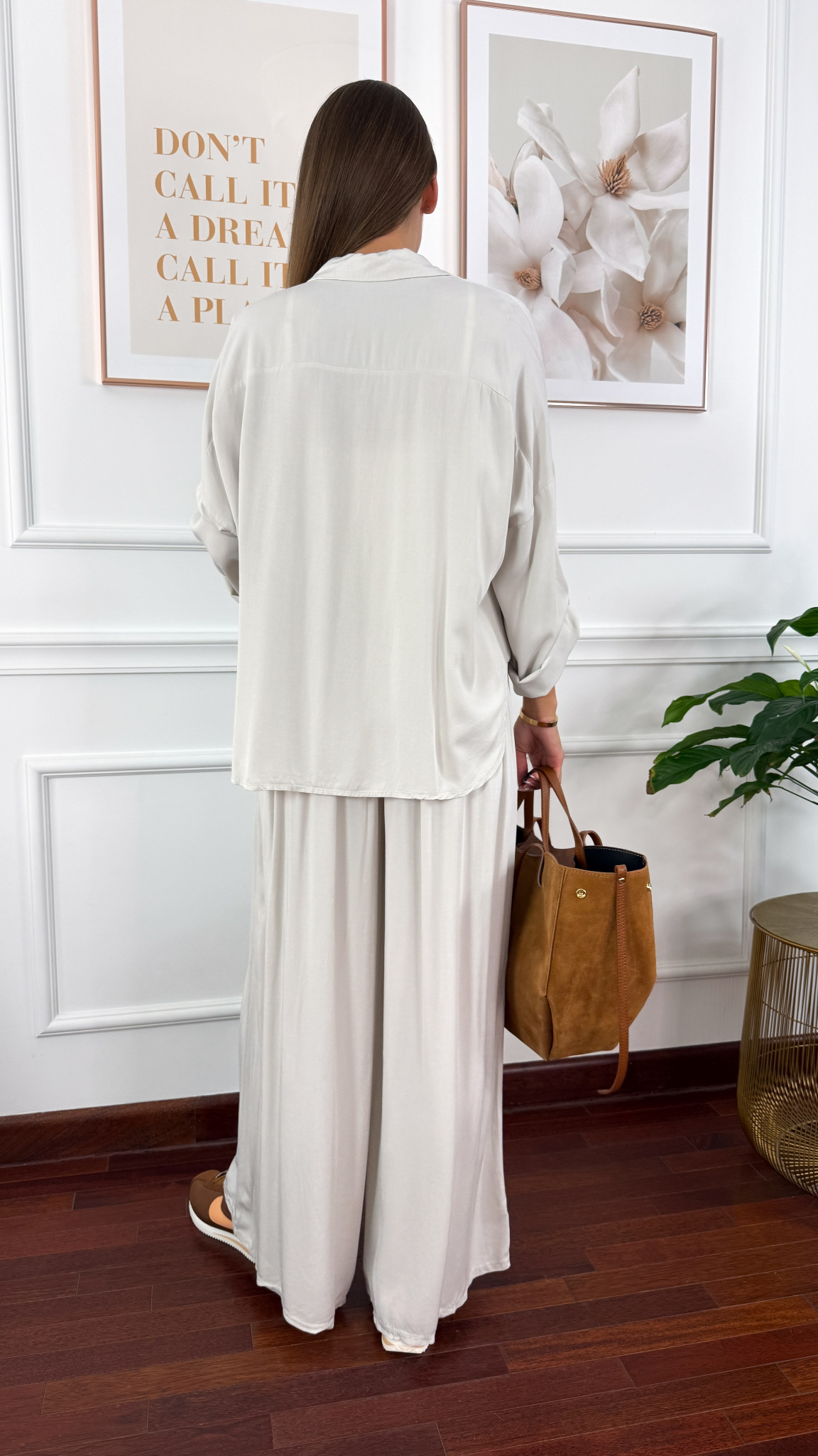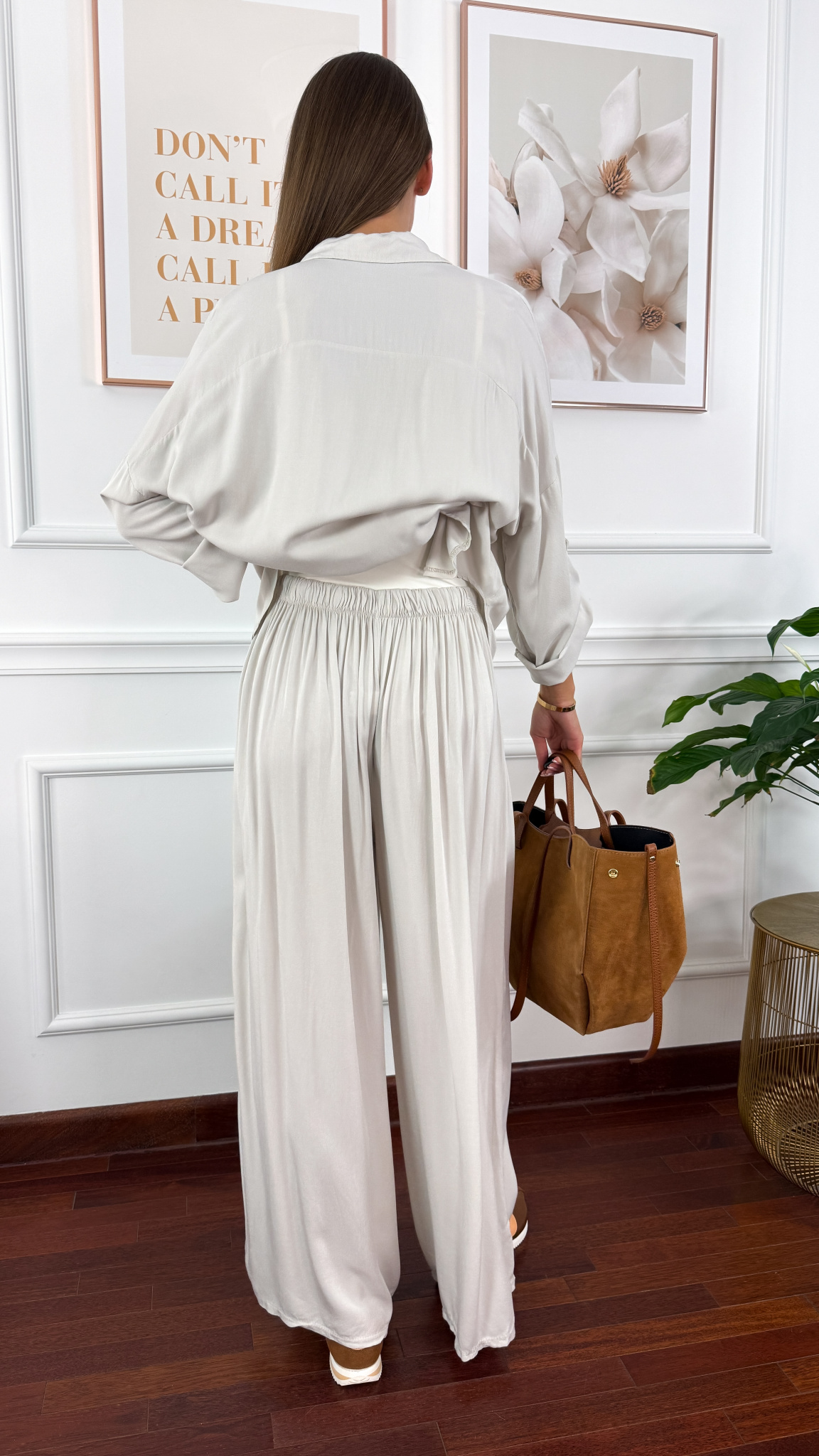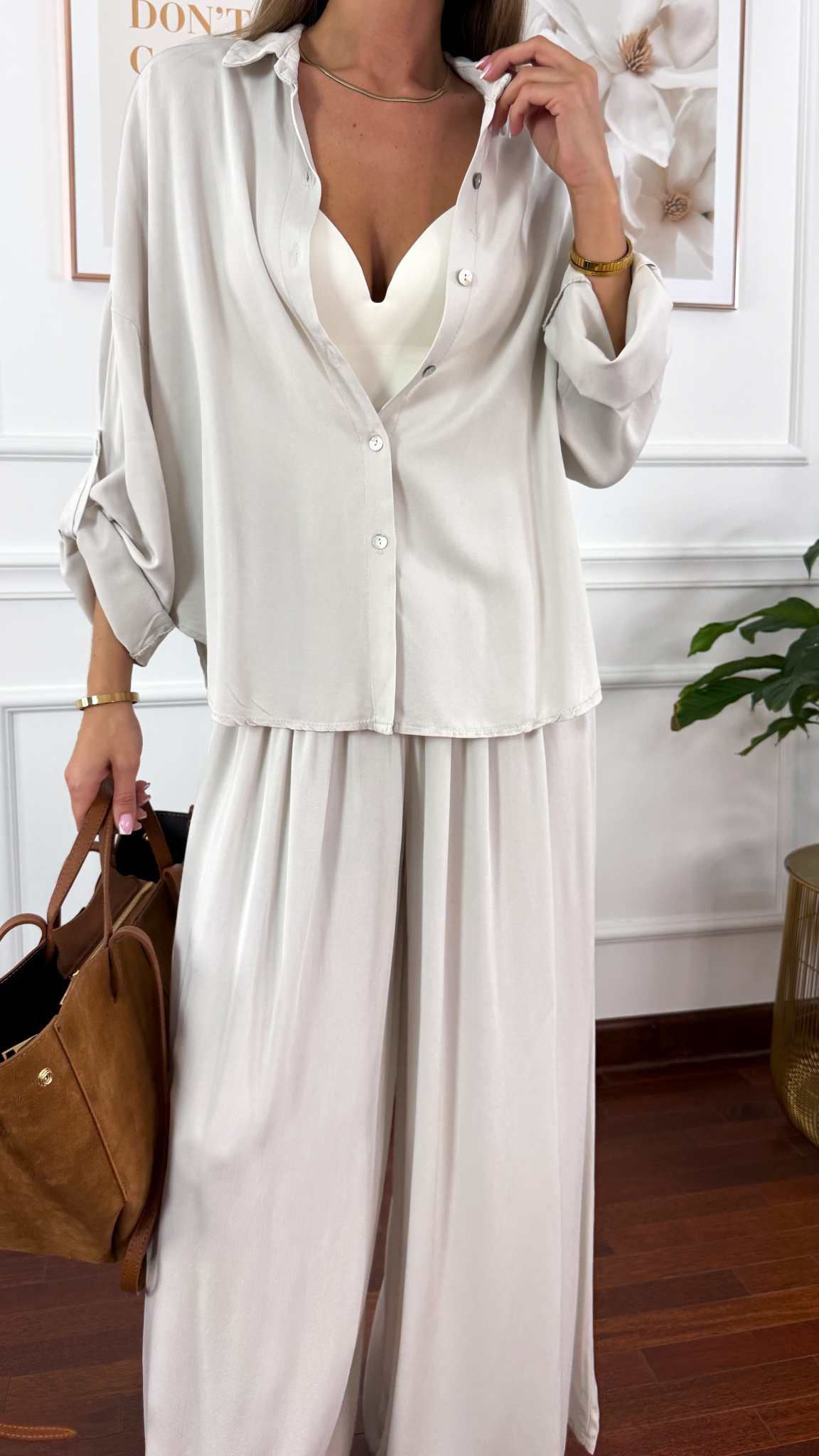 Model sprawdzi się na sylwetkę od S do XL. Wiskozowy komplet składający się z koszuli oraz spodni. Materiał jest lejący oraz niezwykle przyjemny w dotyku. Oversizowa koszula z przodu krótsza, z tyłu dłuższa. Rękawy można podwinąć i zapiąć na guzik. Spodnie mają wszytą gumkę w pasie. Nogawki są bardzo szerokie. Komplet idealnie sprawdzi się w cieplejsze dni.