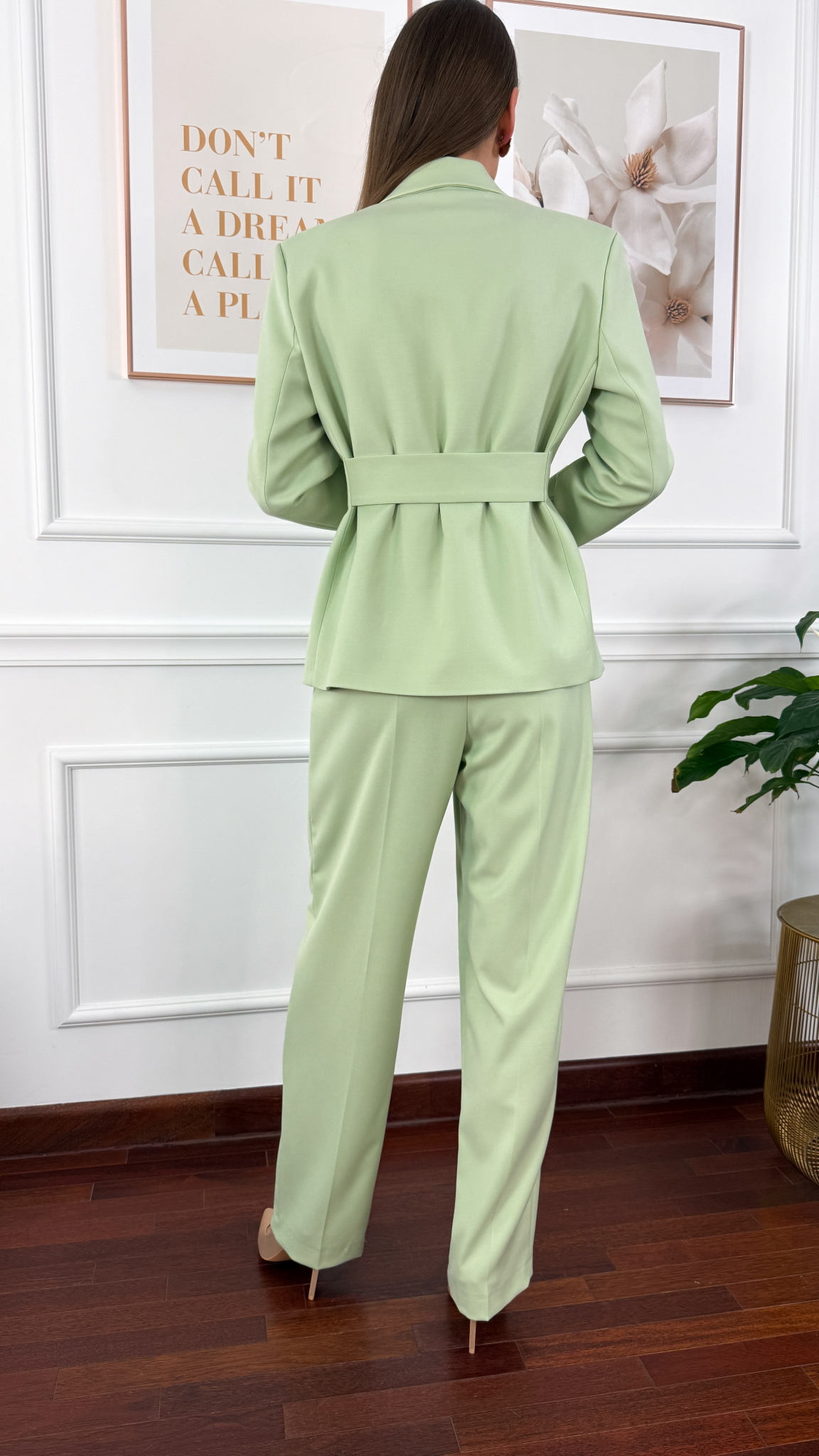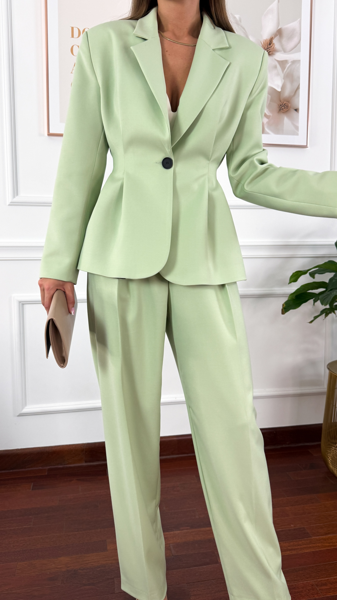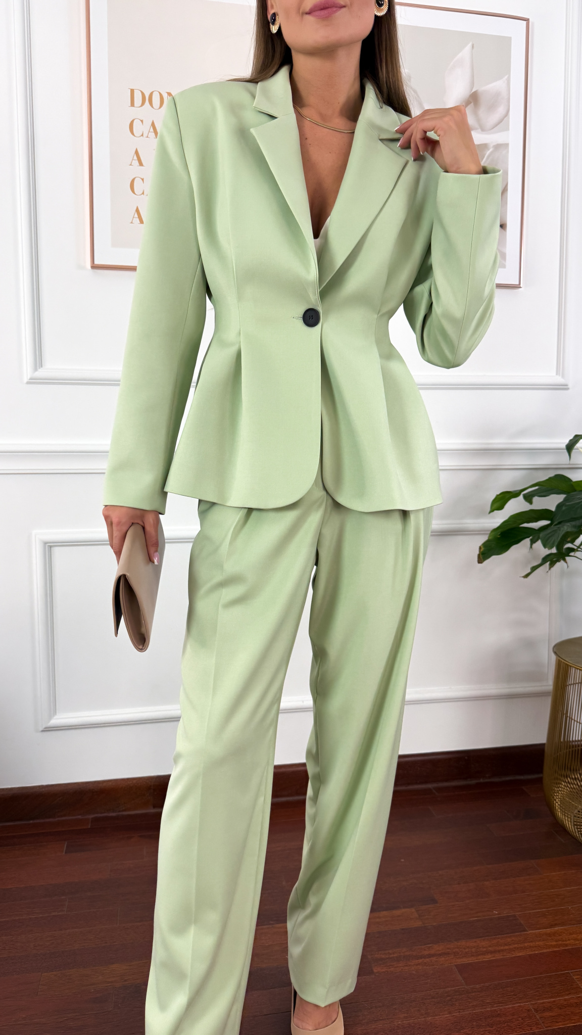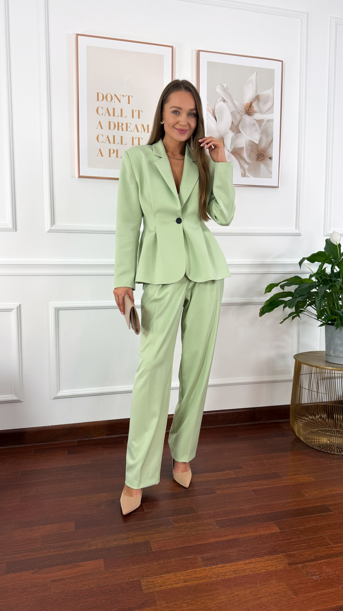 Komplet składający się z marynarki oraz spodni. Marynarka taliowana, zakończona baskinką i zapinana na guzik. Na ramionach wszyte są poduszki. Spodnie proste z wysokim stanem. Komplet idealnie sprawdzi się na chrzciny, komunie.
