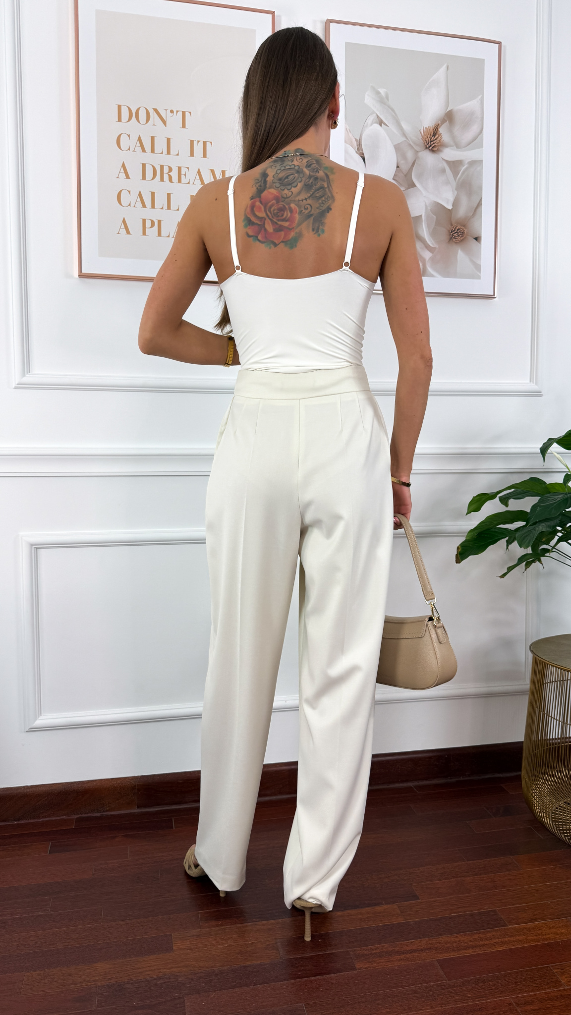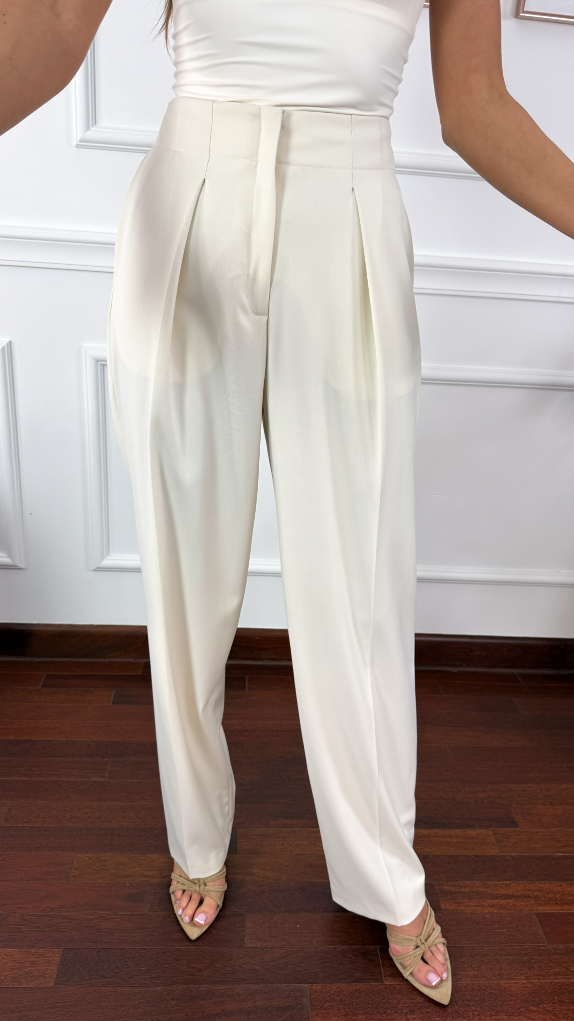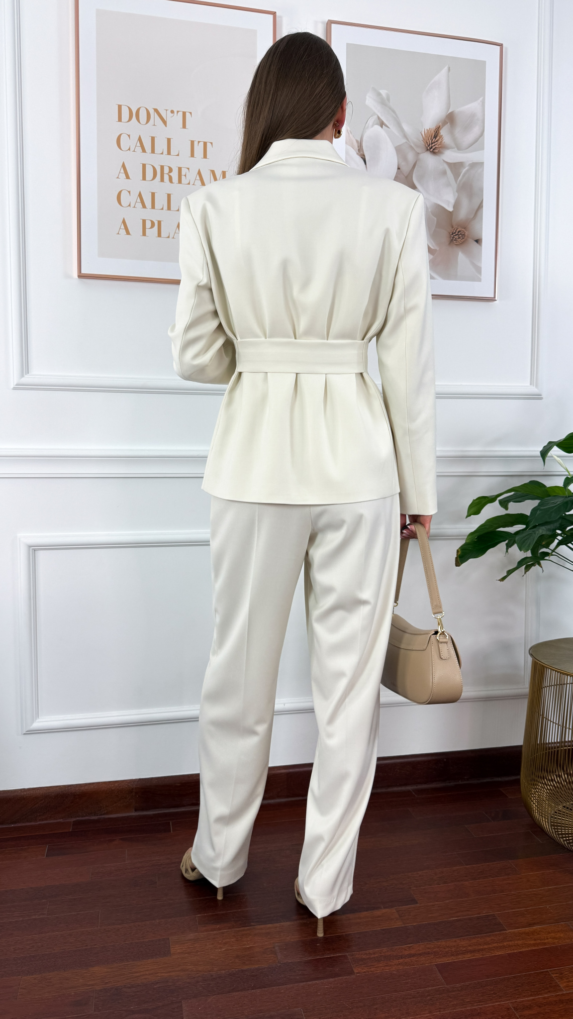 Komplet składający się z marynarki oraz spodni. Marynarka taliowana, zakończona baskinką i zapinana na guzik. Na ramionach wszyte są poduszki. Spodnie proste z wysokim stanem. Komplet idealnie sprawdzi się na chrzciny, komunie.