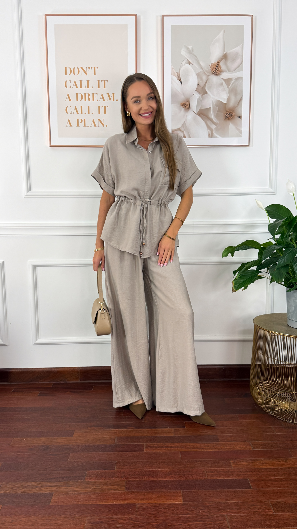 Komplet sprawdzi się na sylwetkę od S do L. Wiskozowy komplet składający się z bluzki oraz spodni. Oversizowa koszula z troczkiem w pasie. Spodnie mają wszytą gumkę w pasie. Nogawki są rozszerzane. Materiał jest karbowany. Komplet idealnie sprawdzi się w cieplejsze dni.