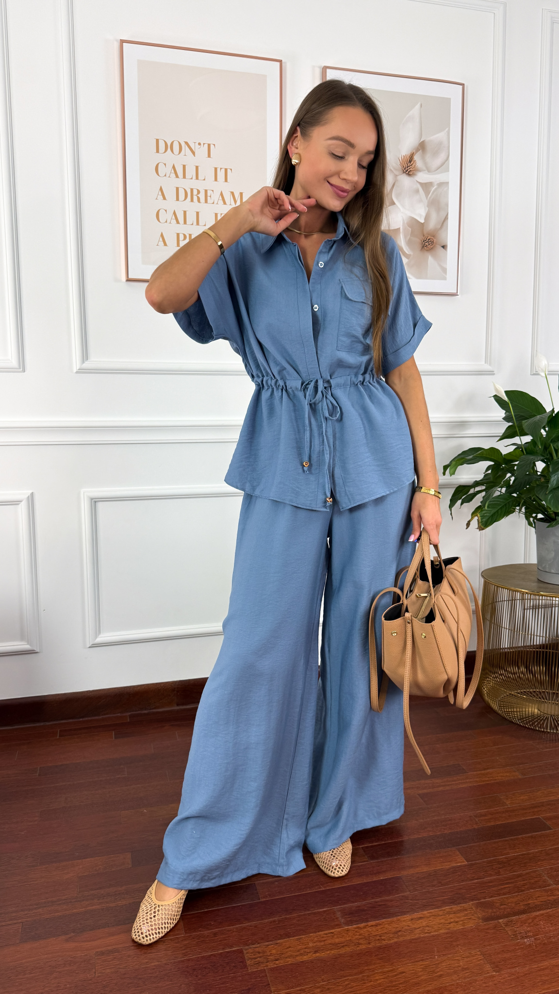 Komplet sprawdzi się na sylwetkę od S do L. Wiskozowy komplet składający się z bluzki oraz spodni. Oversizowa koszula z troczkiem w pasie. Spodnie mają wszytą gumkę w pasie. Nogawki są rozszerzane. Materiał jest karbowany. Komplet idealnie sprawdzi się w cieplejsze dni.