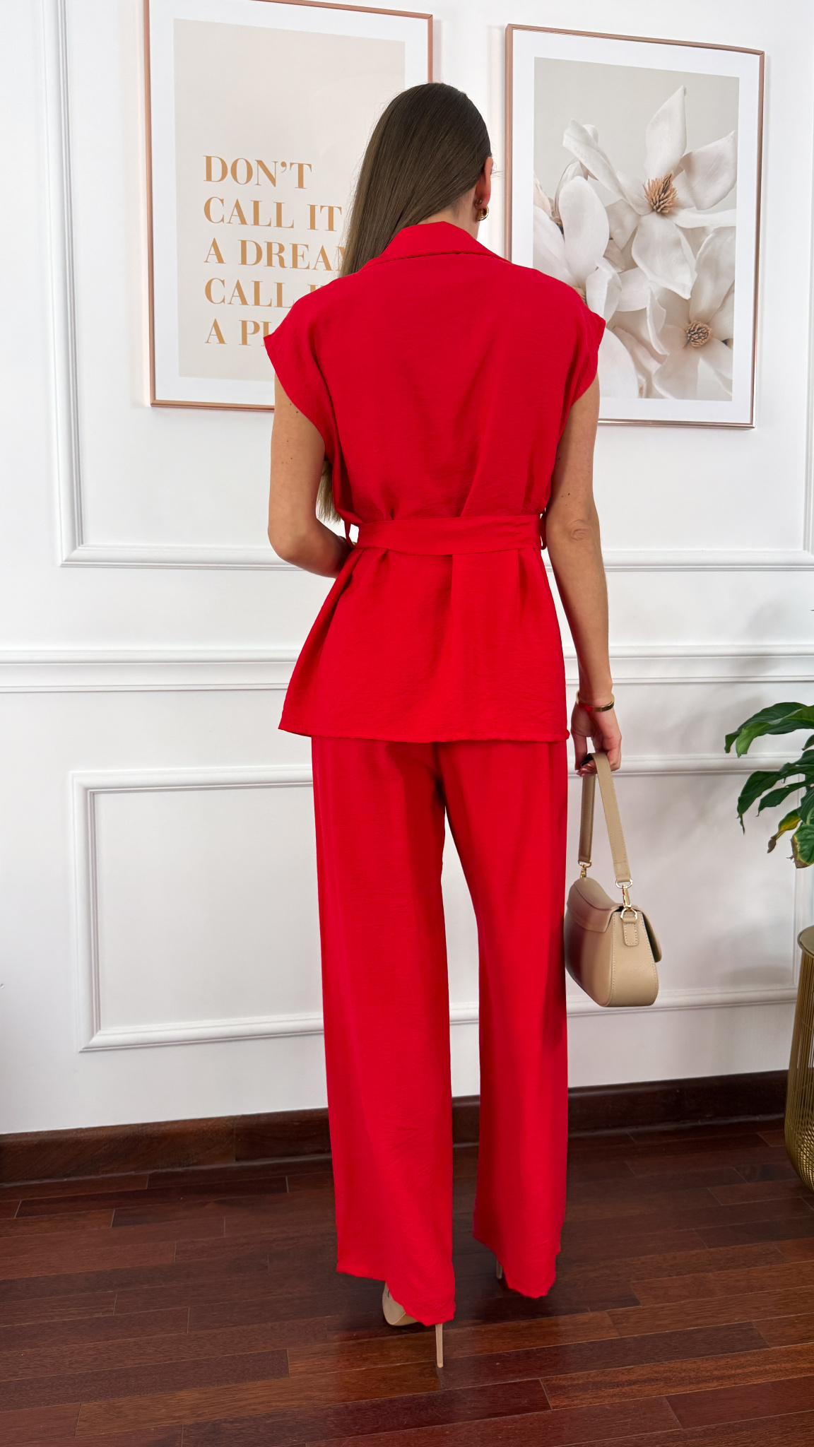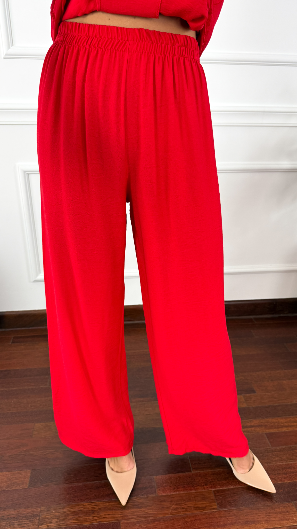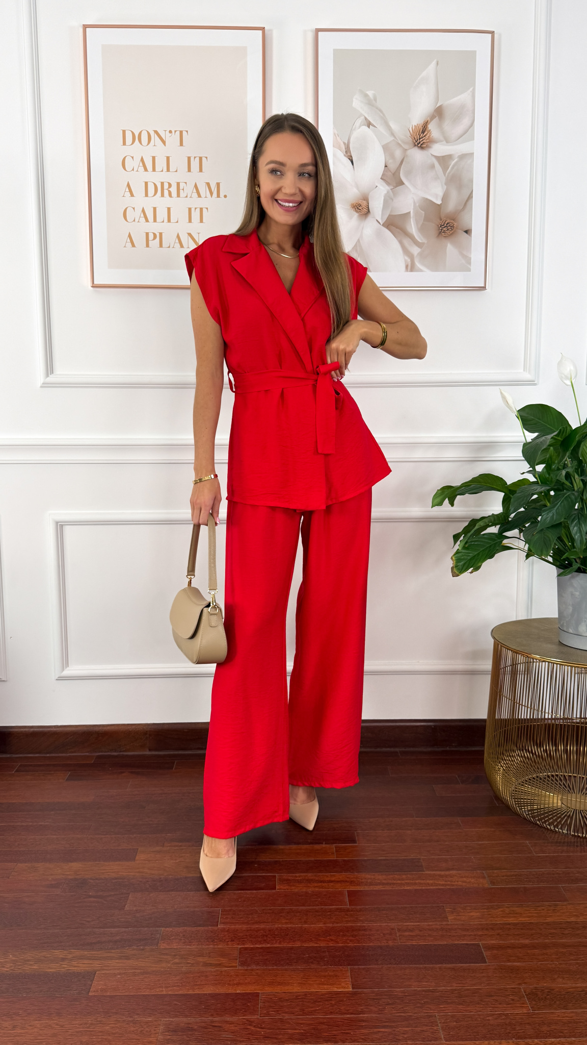 Model sprawdzi się na sylwetkę w rozmiarze od S do L. Wiskozowy komplet składający się z przekładanej bluzki oraz spodni. Przewiązywana bluzka z dekoltem kopertowym. Spodnie mają wszytą gumkę w pasie. Nogawki są bardzo szerokie. Komplet idealnie sprawdzi się w cieplejsze dni.