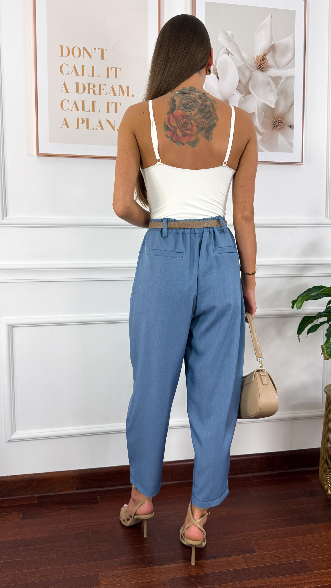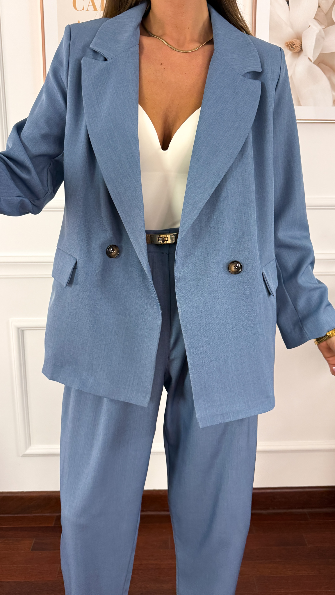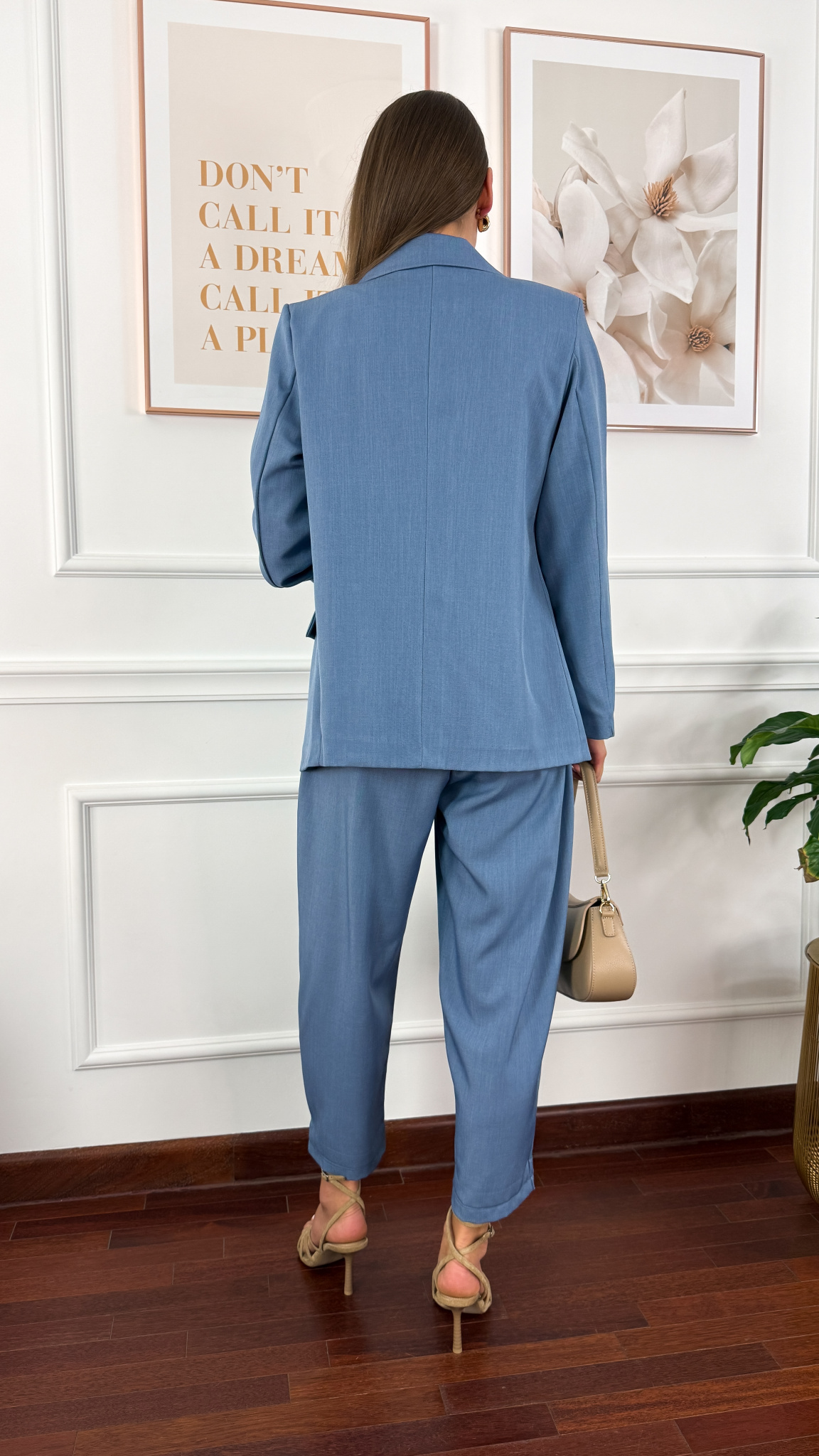 Komplet sprawdzi się od rozmiaru S do L. Składający się z marynarki oraz spodni. Marynarka z przodu delikatnie wydłużana, zapinana na guzik. Na ramionach wszyto poduszki. Posiada praktyczne kieszonki. Spodnie cygaretki/baloon z wysokim stanem w pasie mają wszytą gumkę. Komplet idealnie sprawdzi się na chrzciny, komunie.