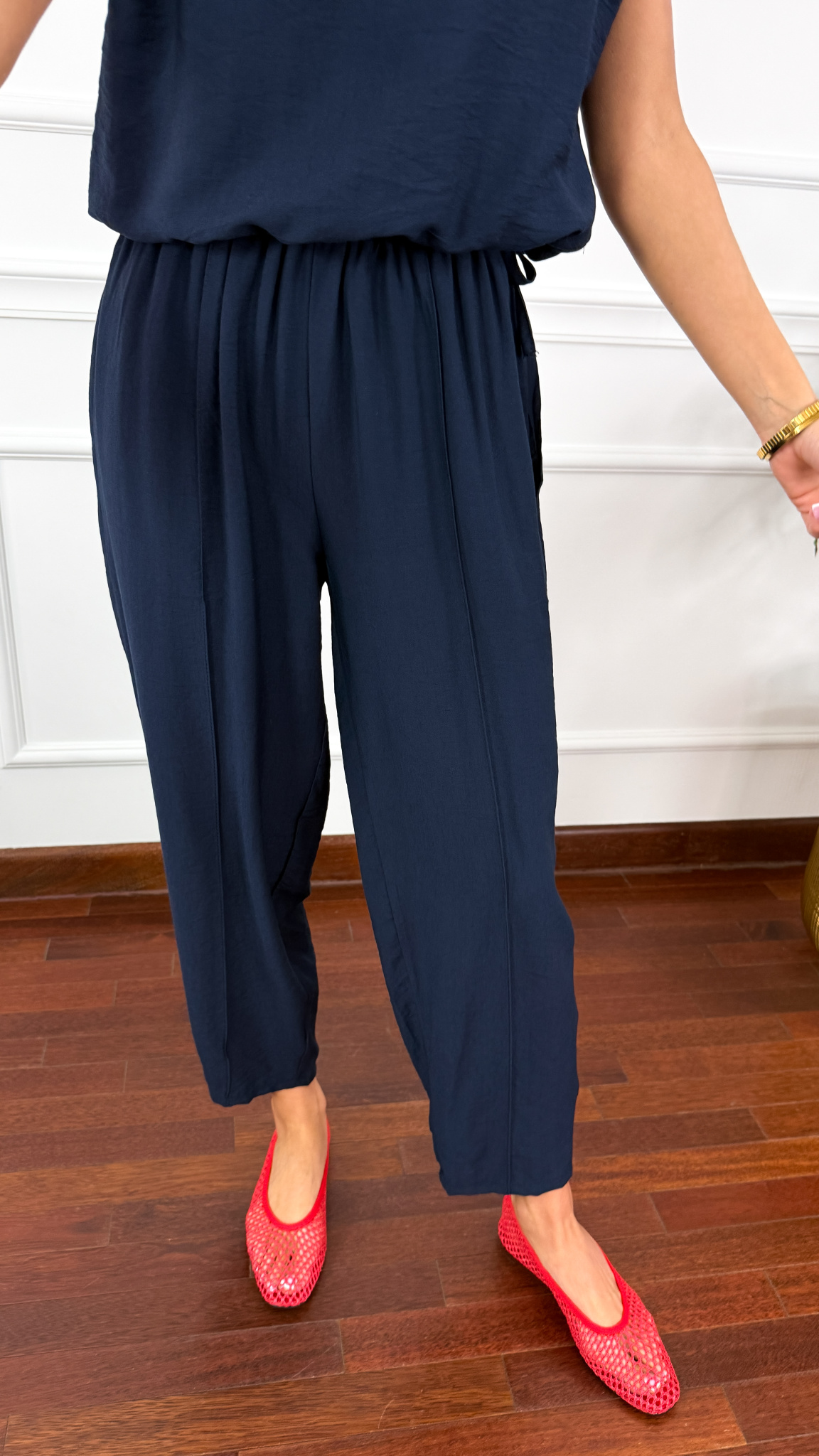 Model sprawdzi się na sylwetkę w rozmiarze od XS do L. Wiskozowy komplet składający się z bluzki oraz spodni. Bluzka na krótki rękaw. Dół zakończony troczkiem. Spodnie mają wszytą gumkę w pasie. Szerokie nogawki z przeszyciem przez całą długość. Komplet idealnie sprawdzi się w cieplejsze dni.
