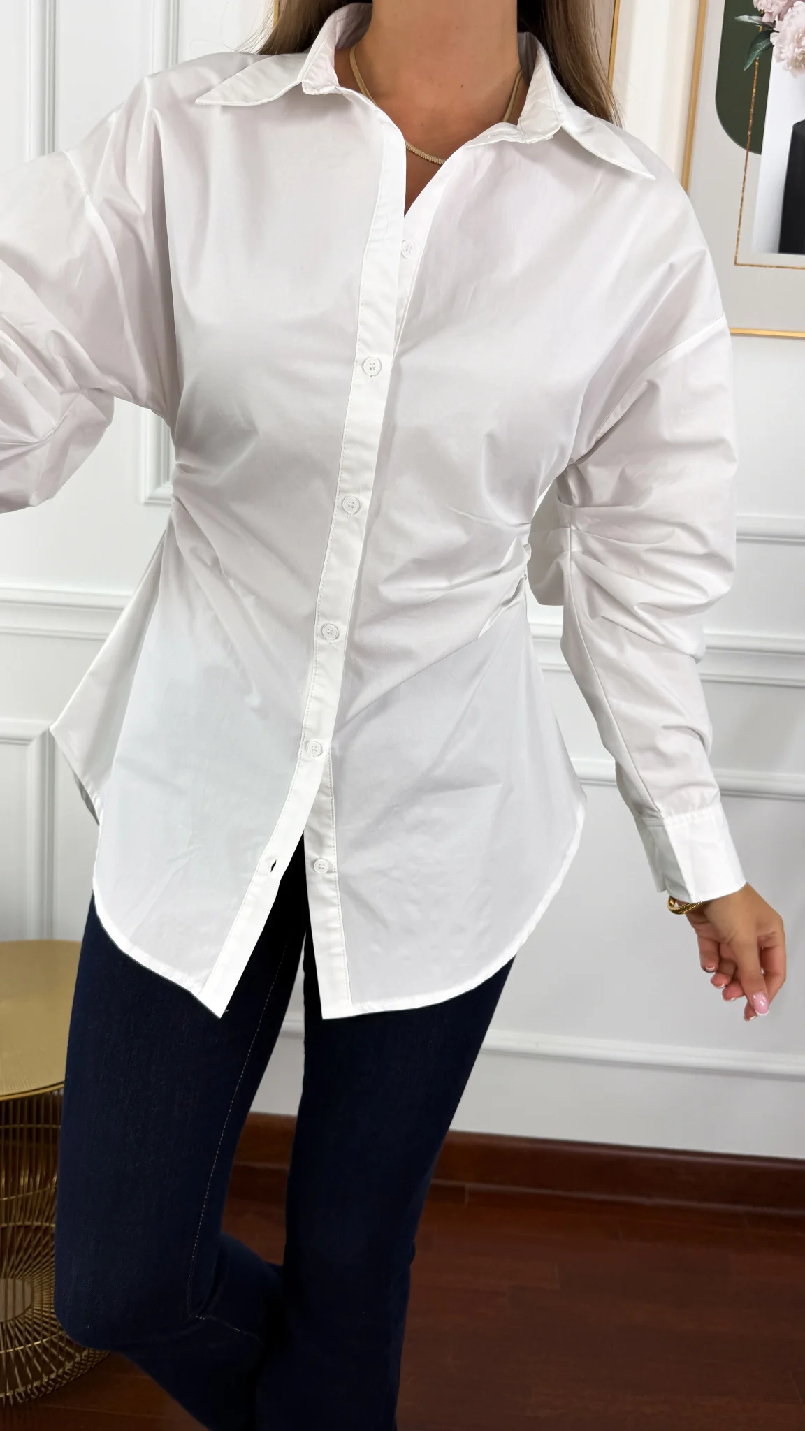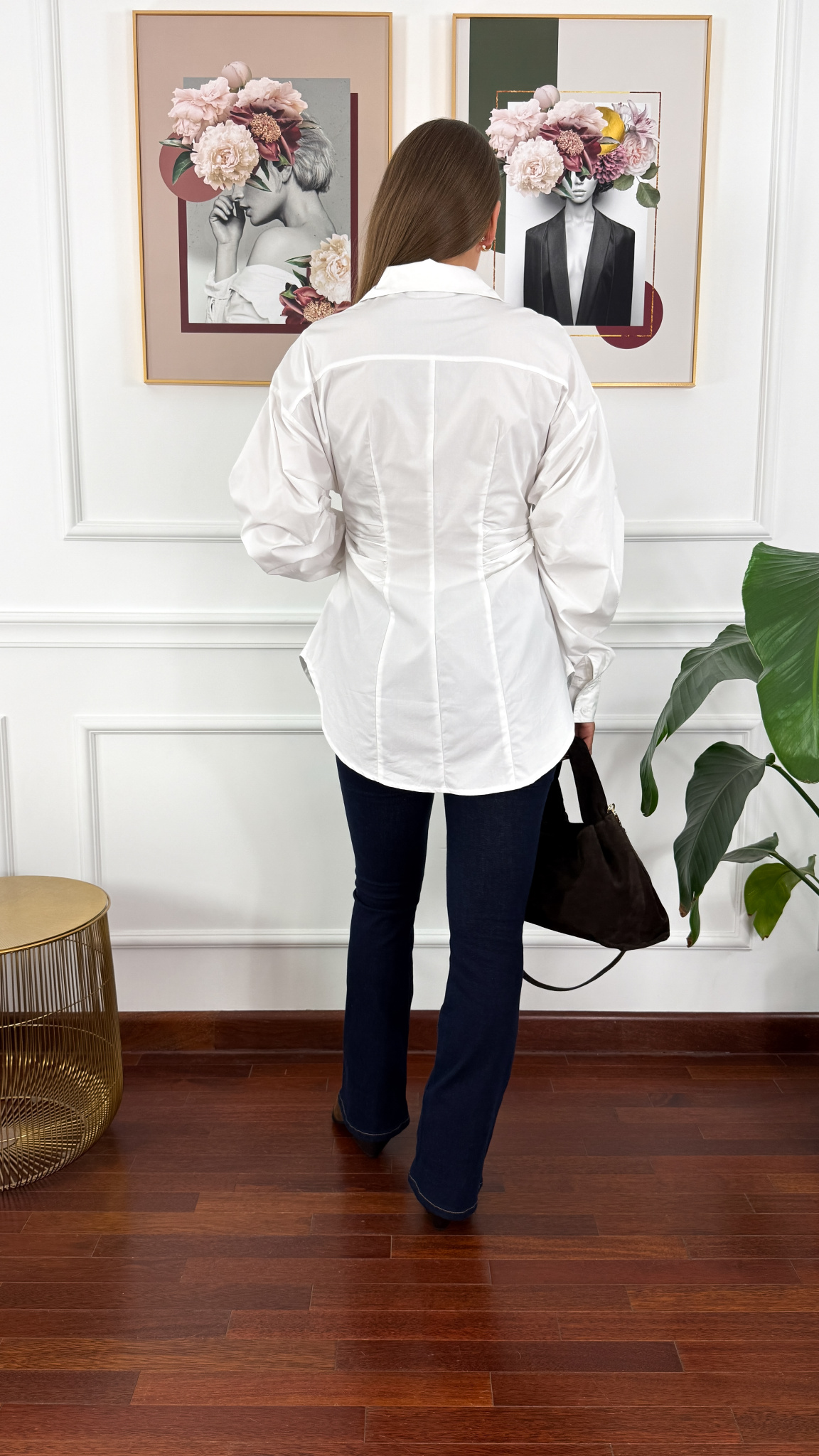 Bawełniana koszula z kołnierzykiem. Ozdobne marszczenia występujące w talii oraz na rękawach. Rękaw zakończony mankietem zapinanym na guzik.
