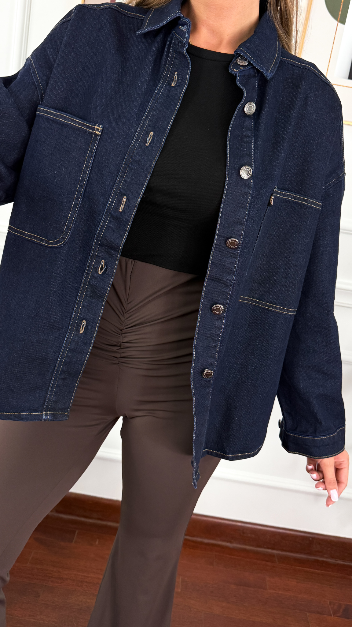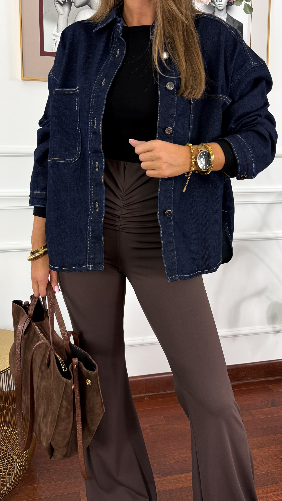 Denimowa oversizowa koszula z kołnierzykiem. Posiada dwie praktyczne kieszonki na wysokości biustu. Rękaw zakończony mankietem zapinanym na guzik. Model można nosić również jako okrycie wierzchnie.
