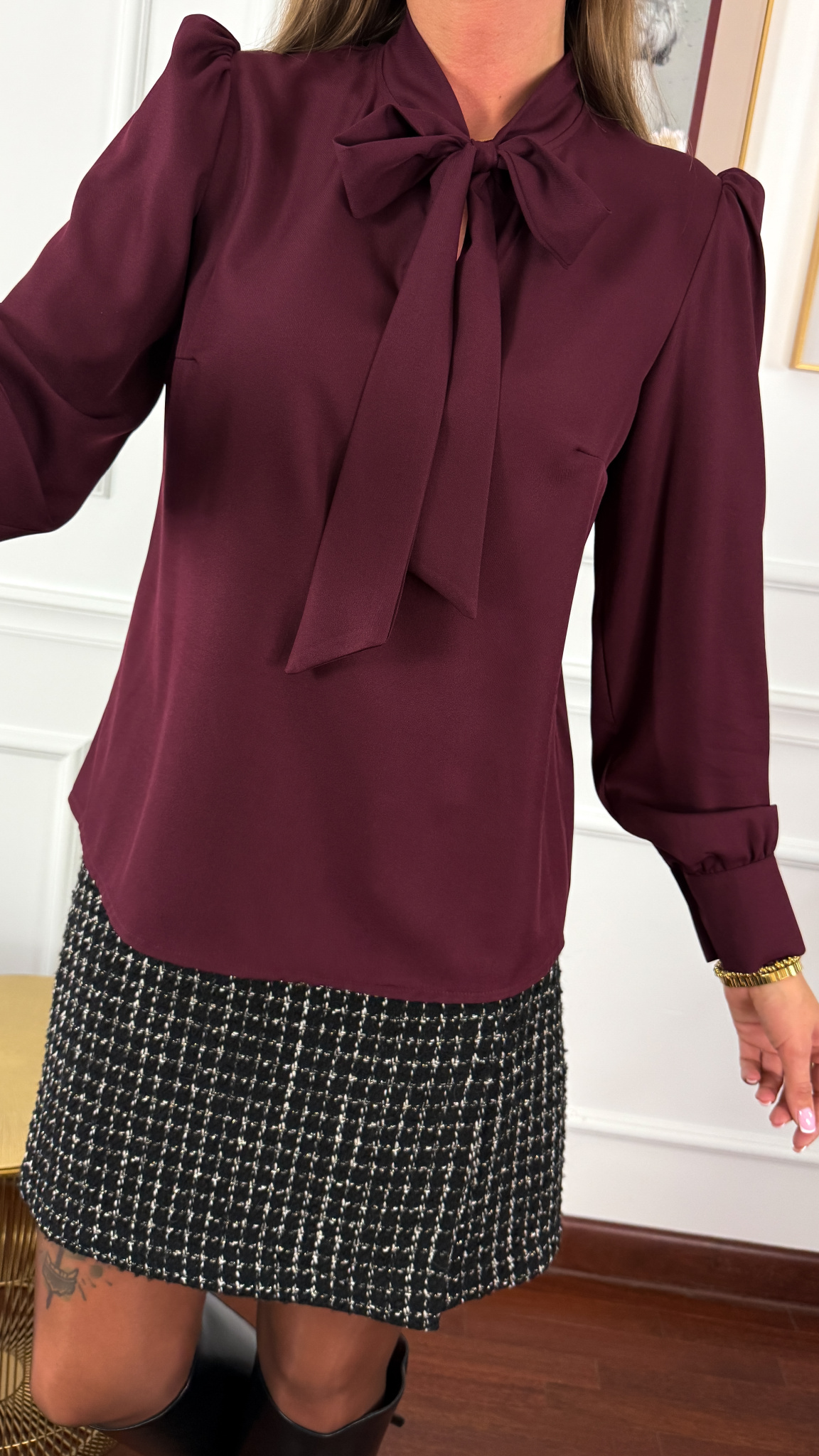 Koszula z dekoltem w serek i wiązaniem przy szyi. Rękaw zakończony mankietem zapinanym na dwa guziki. Na ramionach delikatna bufka. Koszula ma zaniżoną rozmiarówkę, warto wybrać rozmiar większy.