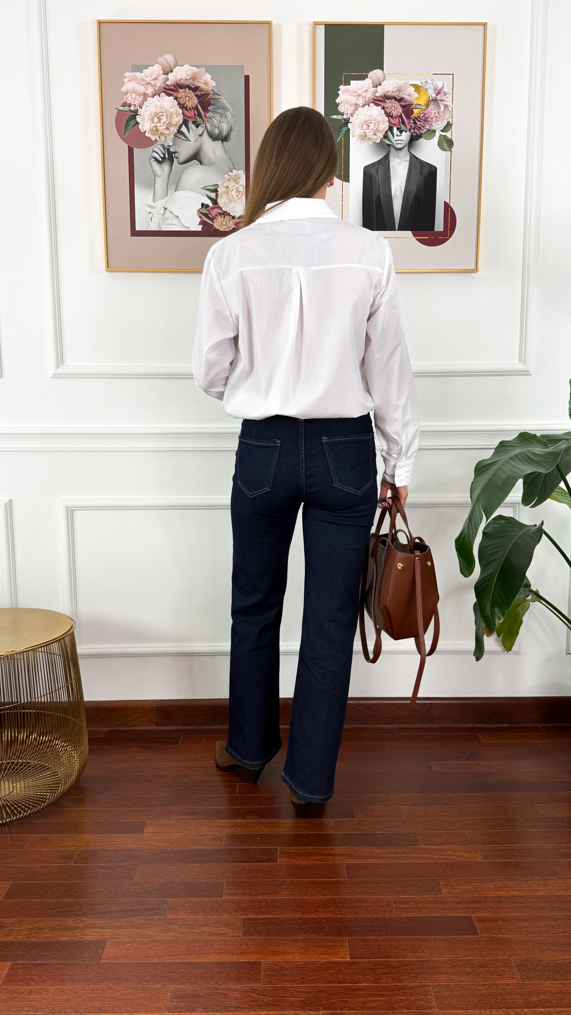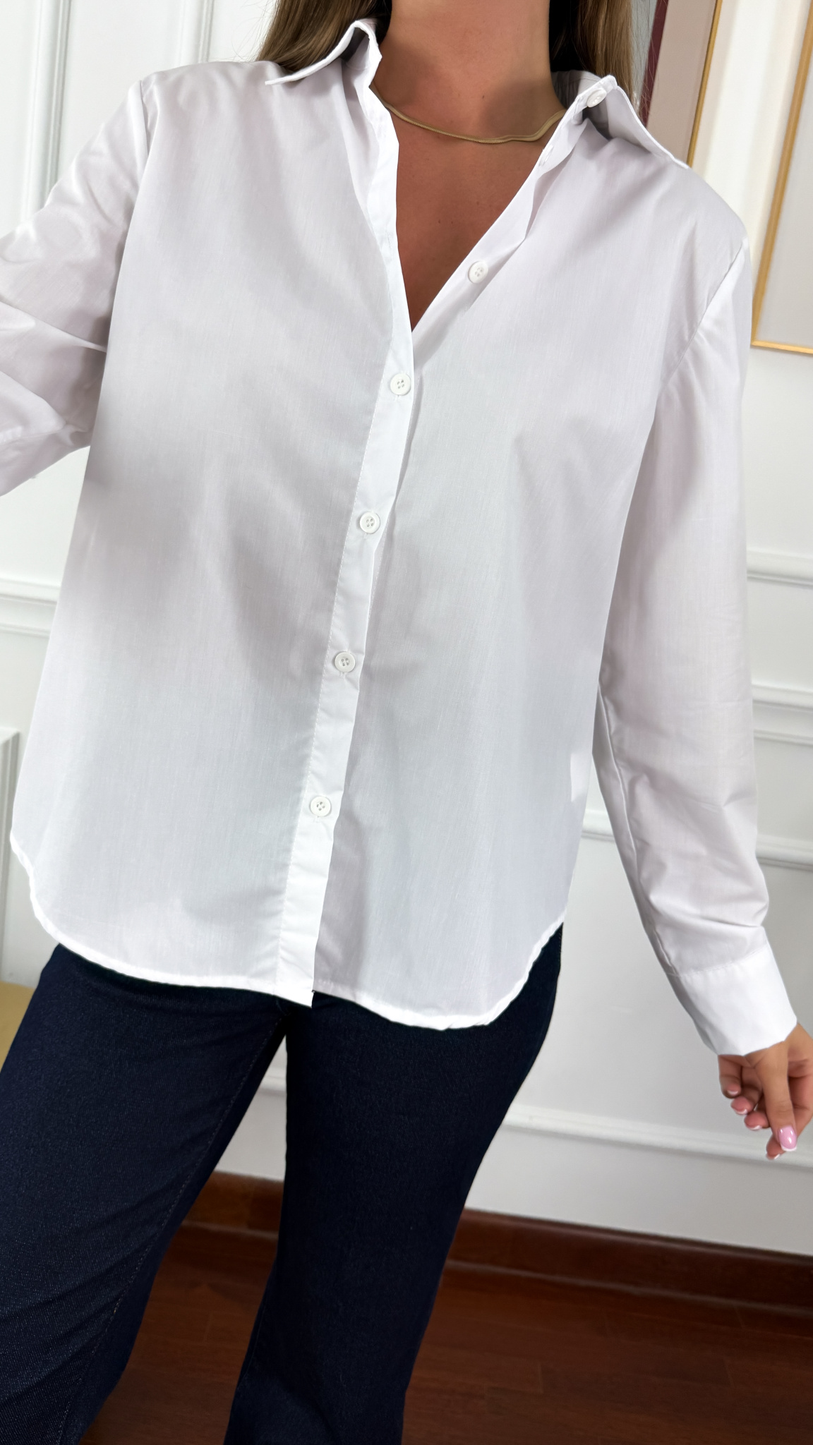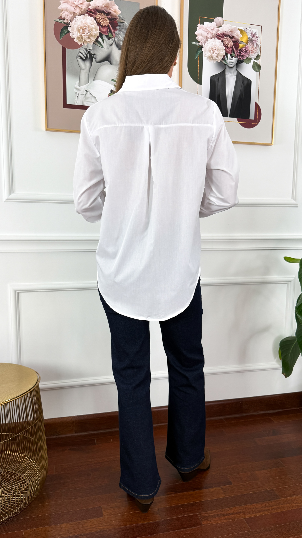 Bawełniana koszula z kołnierzykiem, delikatnie taliowana. Rękaw zakończony mankietem zapinanym na guzik. Wydłużony tył.