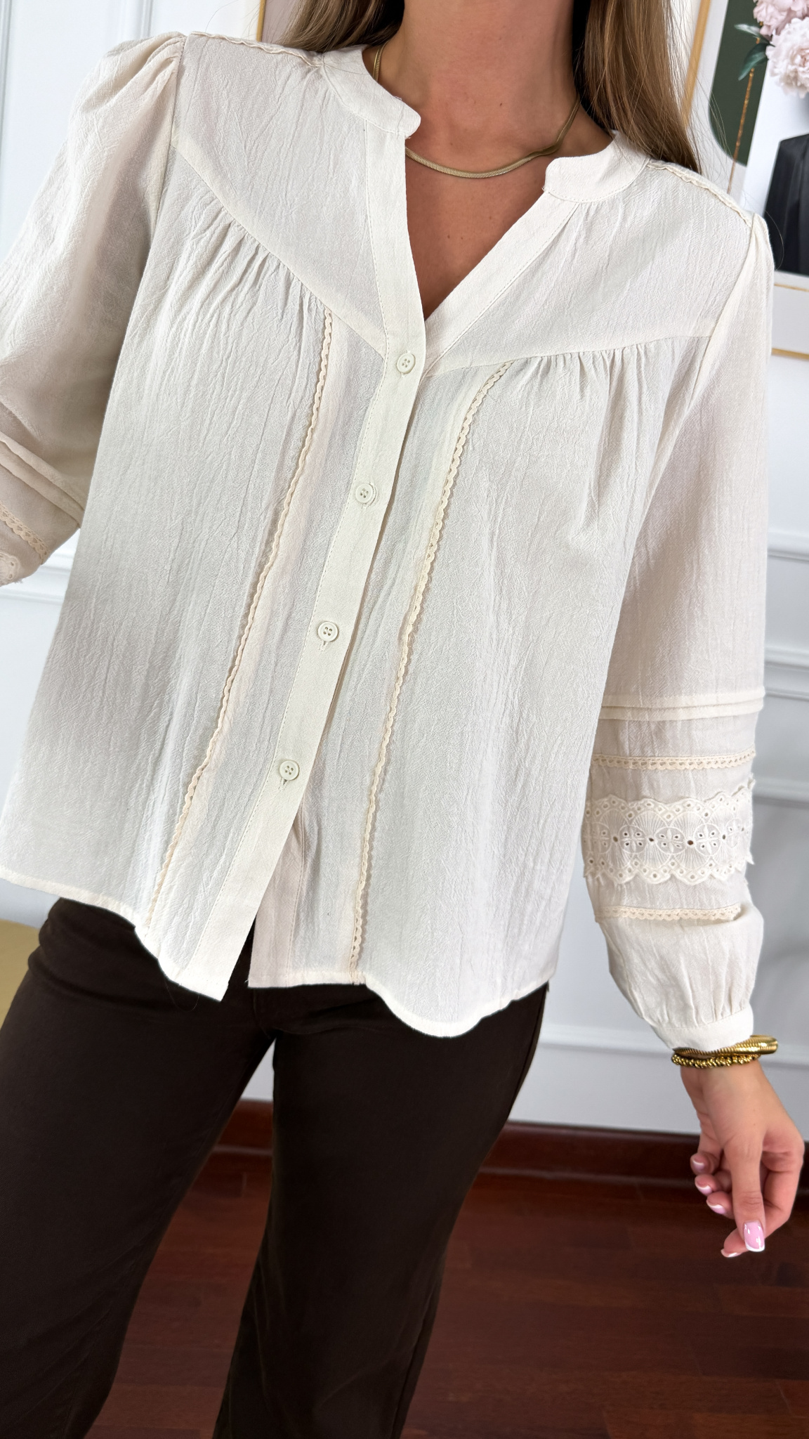 Bawełniana koszula z długim rękawem. Zapinany przy mankiecie na guzik. Na rękawie występuje ozdobne przeszycie.