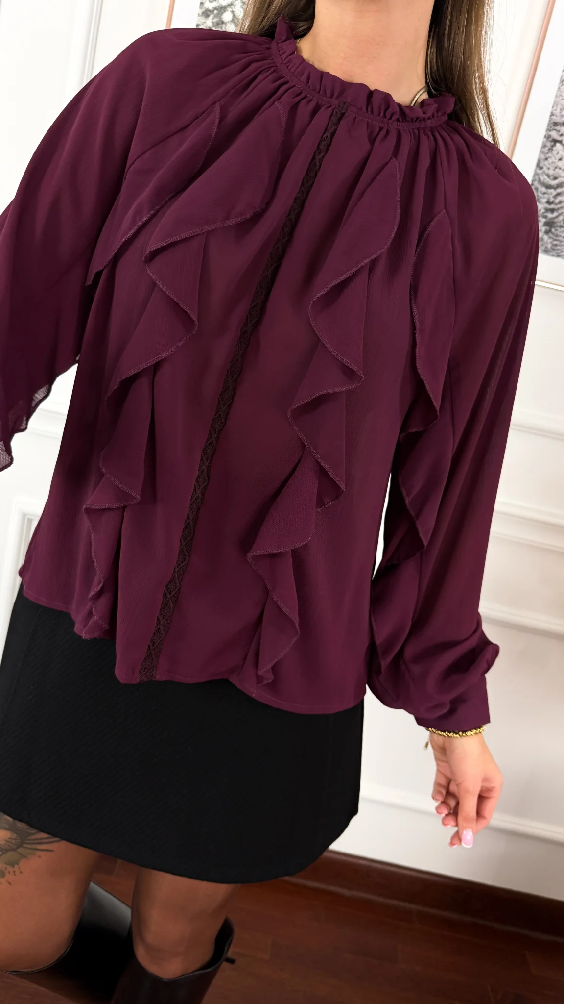 Wiskozowa koszula z ozdobnymi falbanami. Zapinana guzikiem na wysokości szyi. Rękaw zakończony mankietem zapinanym na dwa guziki.
