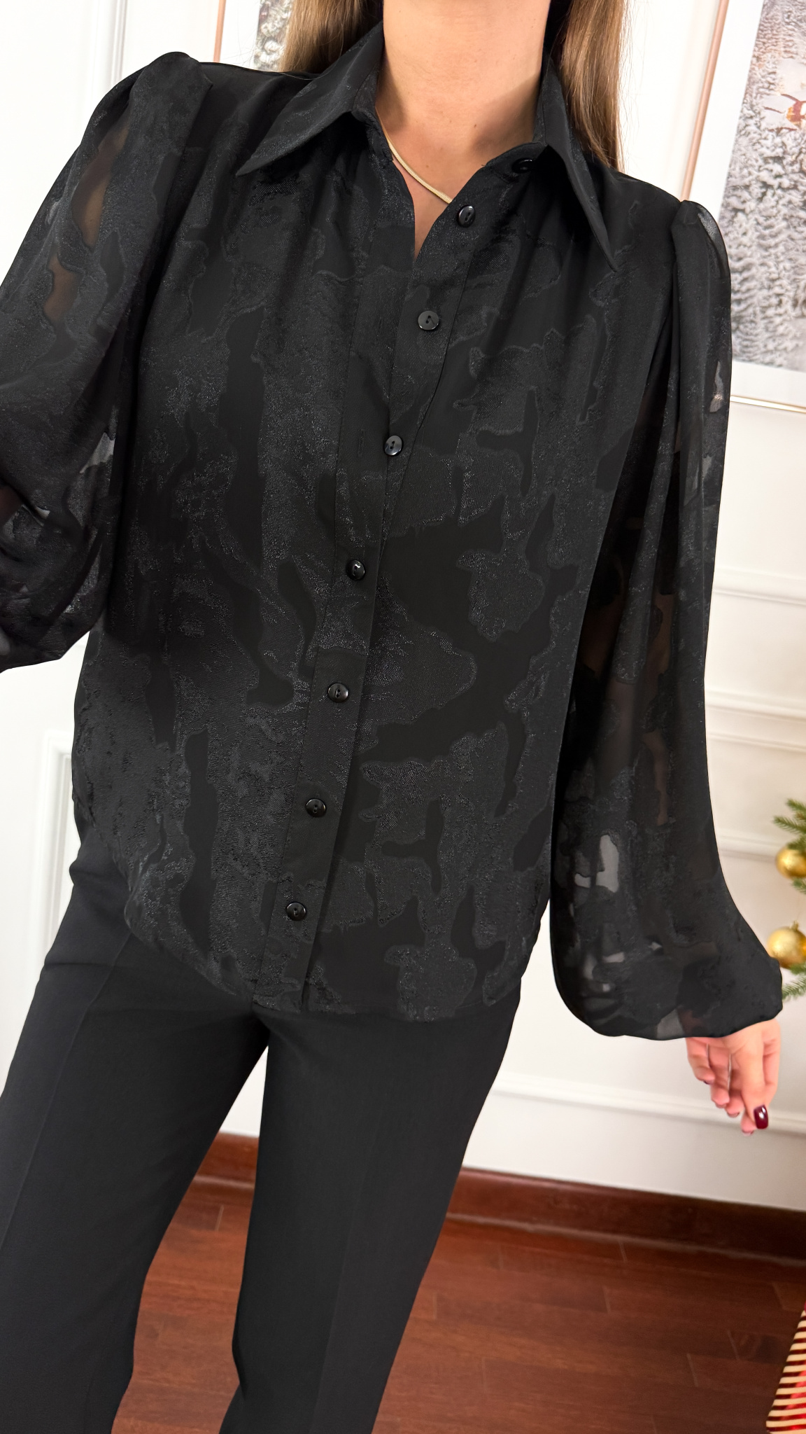 Wiskozowa koszula z kołnierzem. Długi bufiasty rękaw z zaznaczoną linią ramion zakończony gumką. Rękawy lekko prześwitujące, w pozostałej części koszuli wszyto podwójny materiał.