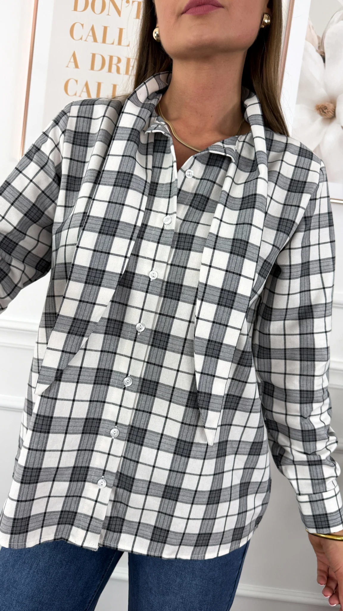 Bawełniana koszula w kratę z ozdobnym wiązaniem przy szyi. Rękawy zakończone krótkim mankietem zapinanym na guzik.