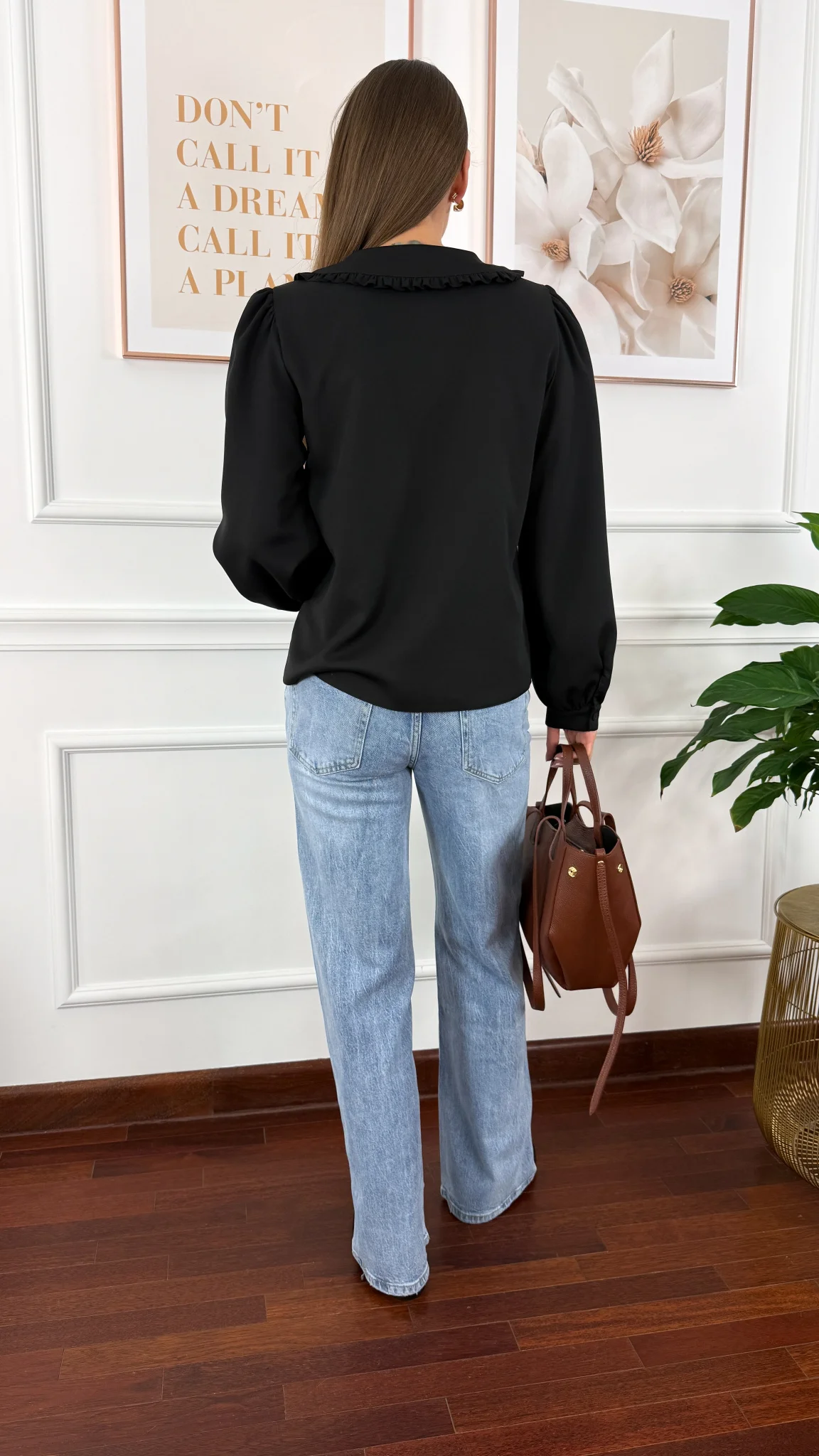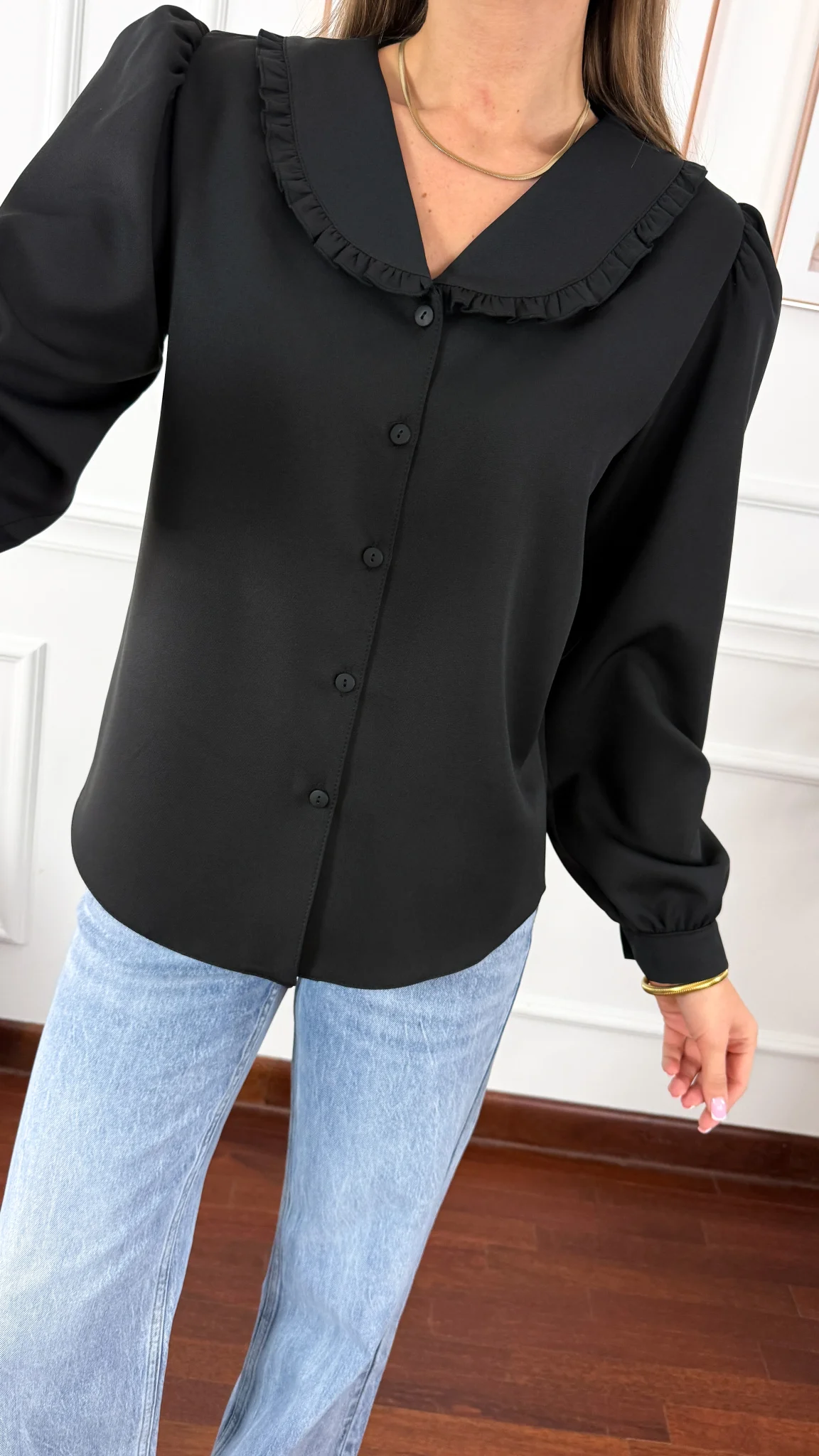 Model sprawdzi się na sylwetkę w rozmiarze od S do L. Wiskozowa koszula z ozdobny kołnierzem z falbanką. Zapinana na guziki. Bufki na rękawach. Rękawy zakończone mankietem zapinane na guziki.