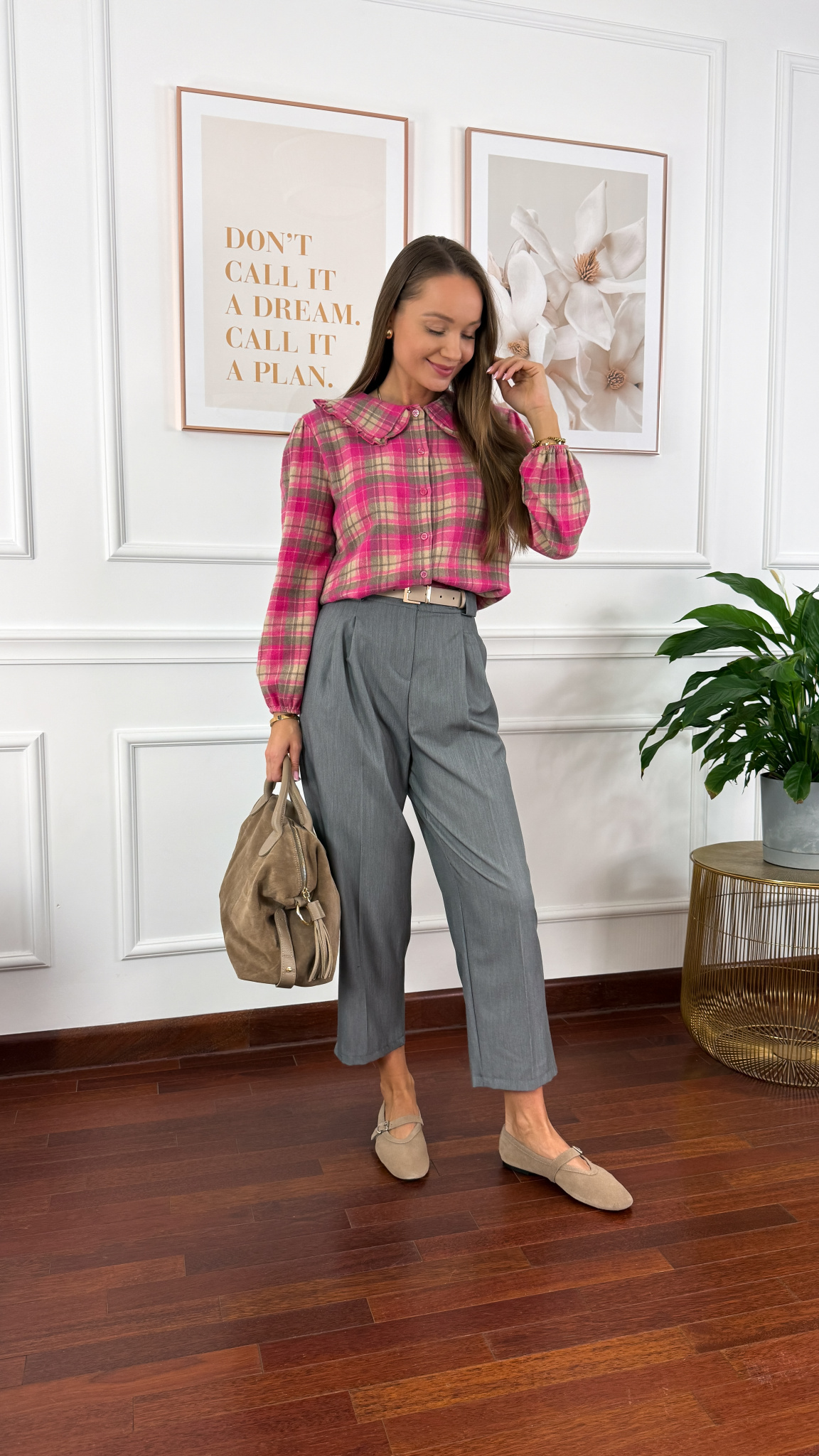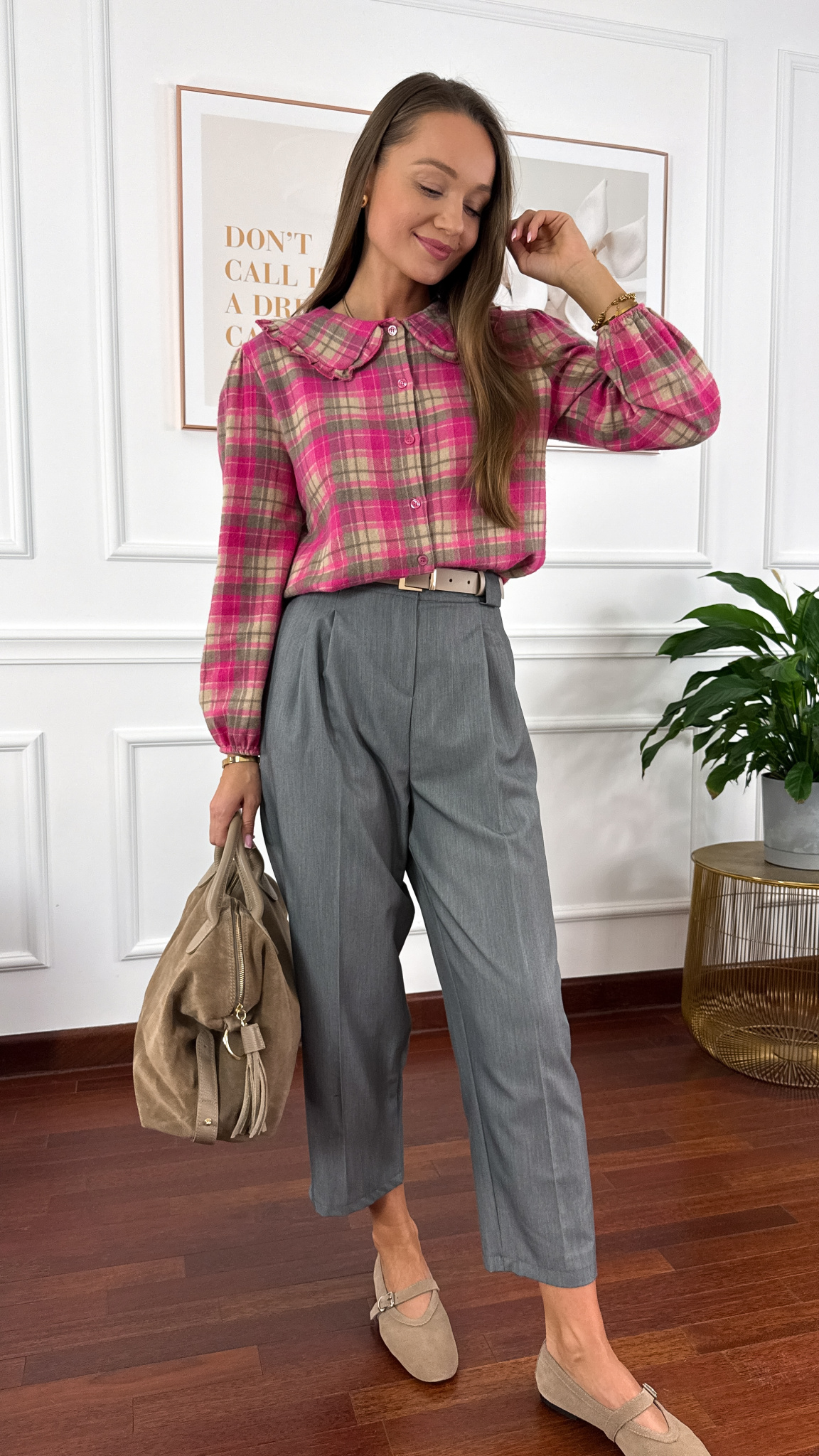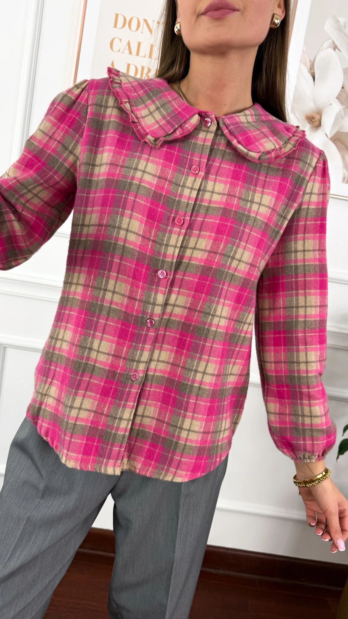 Model sprawdzi się na sylwetkę w rozmiarze od S do L. Bawełniana koszula w kratę z ozdobnym kołnierzykiem zapinana na guziki. Rękawy zakończone mankietem zapinanym na guzik.