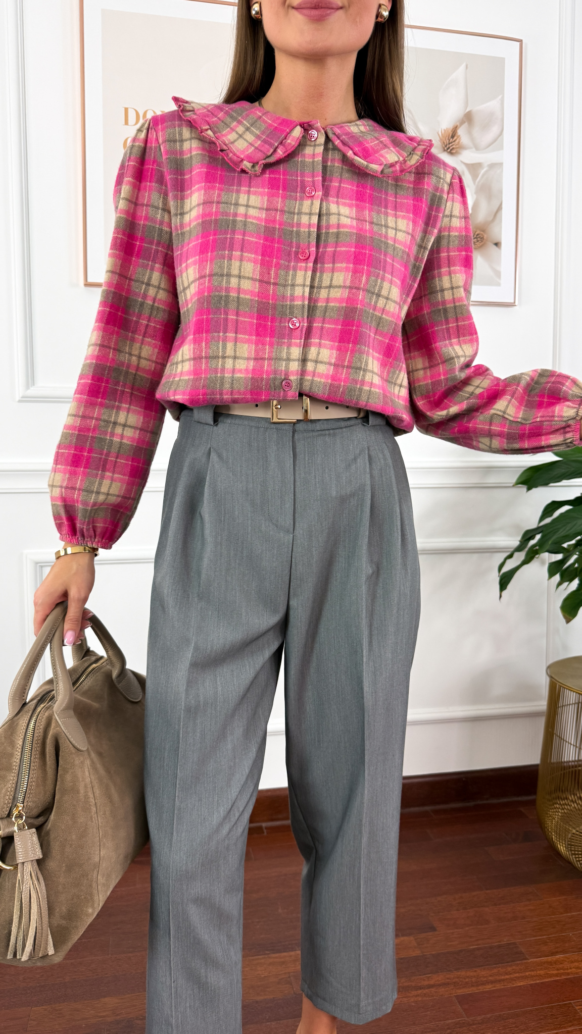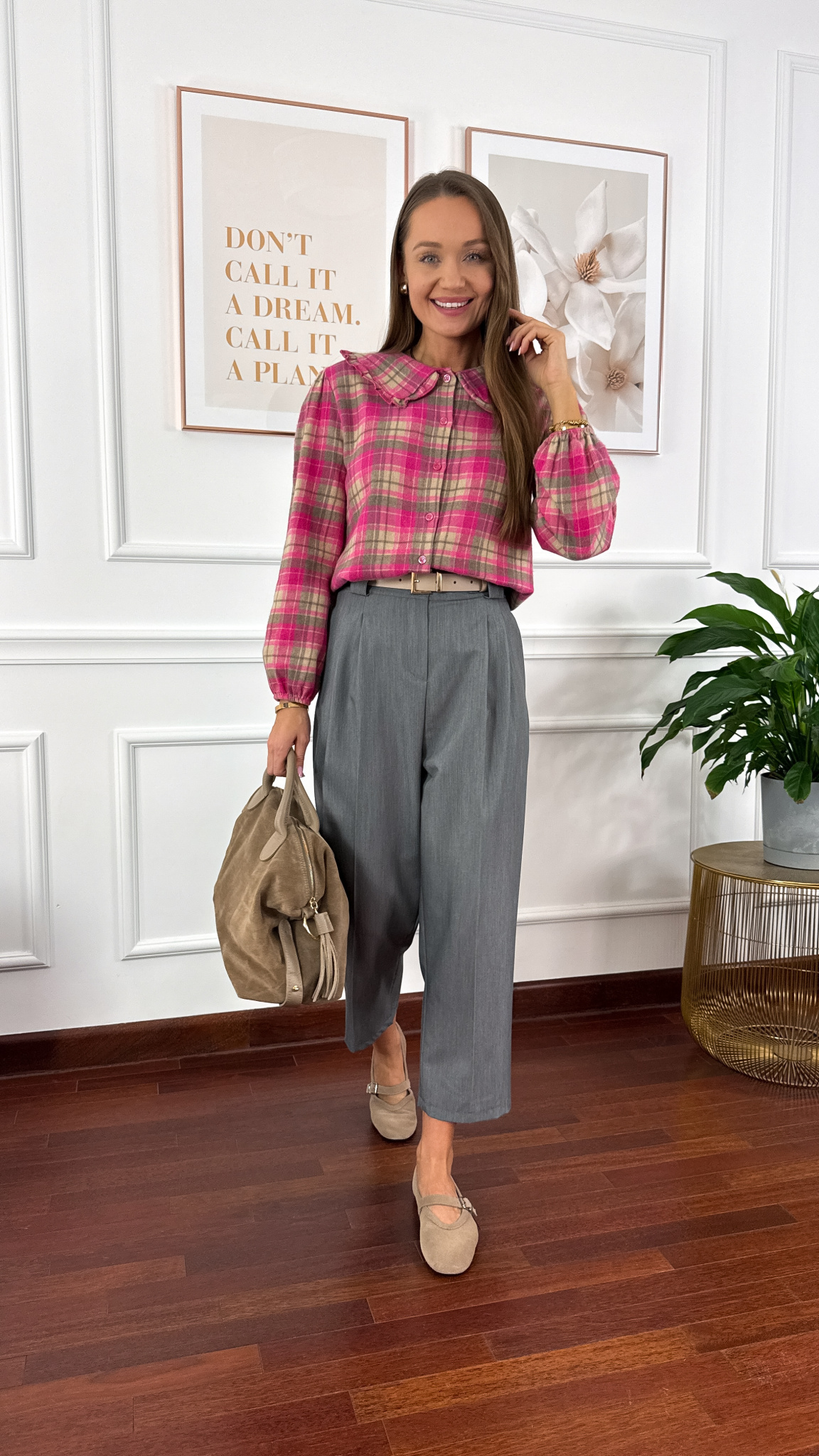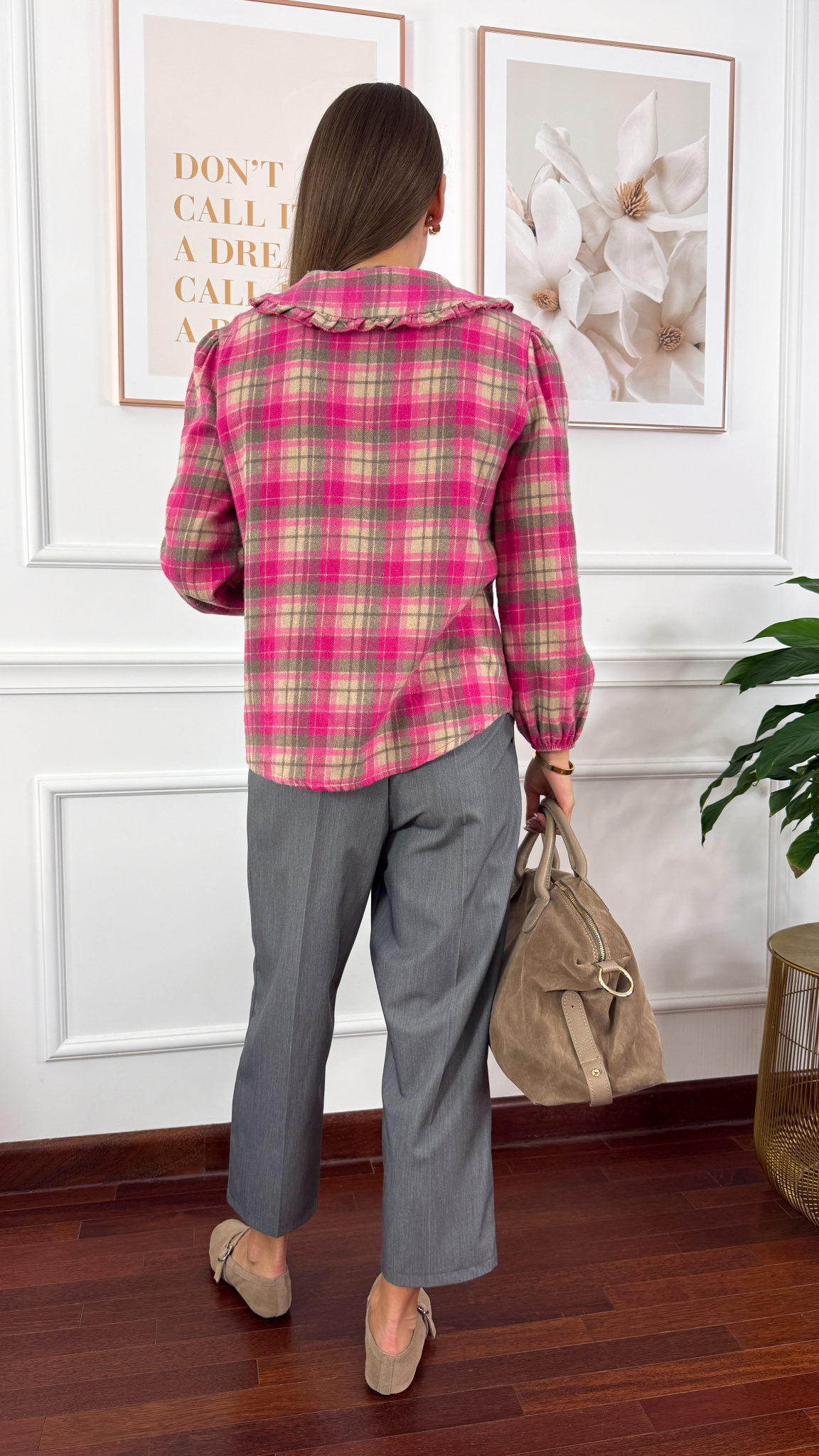 Model sprawdzi się na sylwetkę w rozmiarze od S do L. Bawełniana koszula w kratę z ozdobnym kołnierzykiem zapinana na guziki. Rękawy zakończone mankietem zapinanym na guzik.