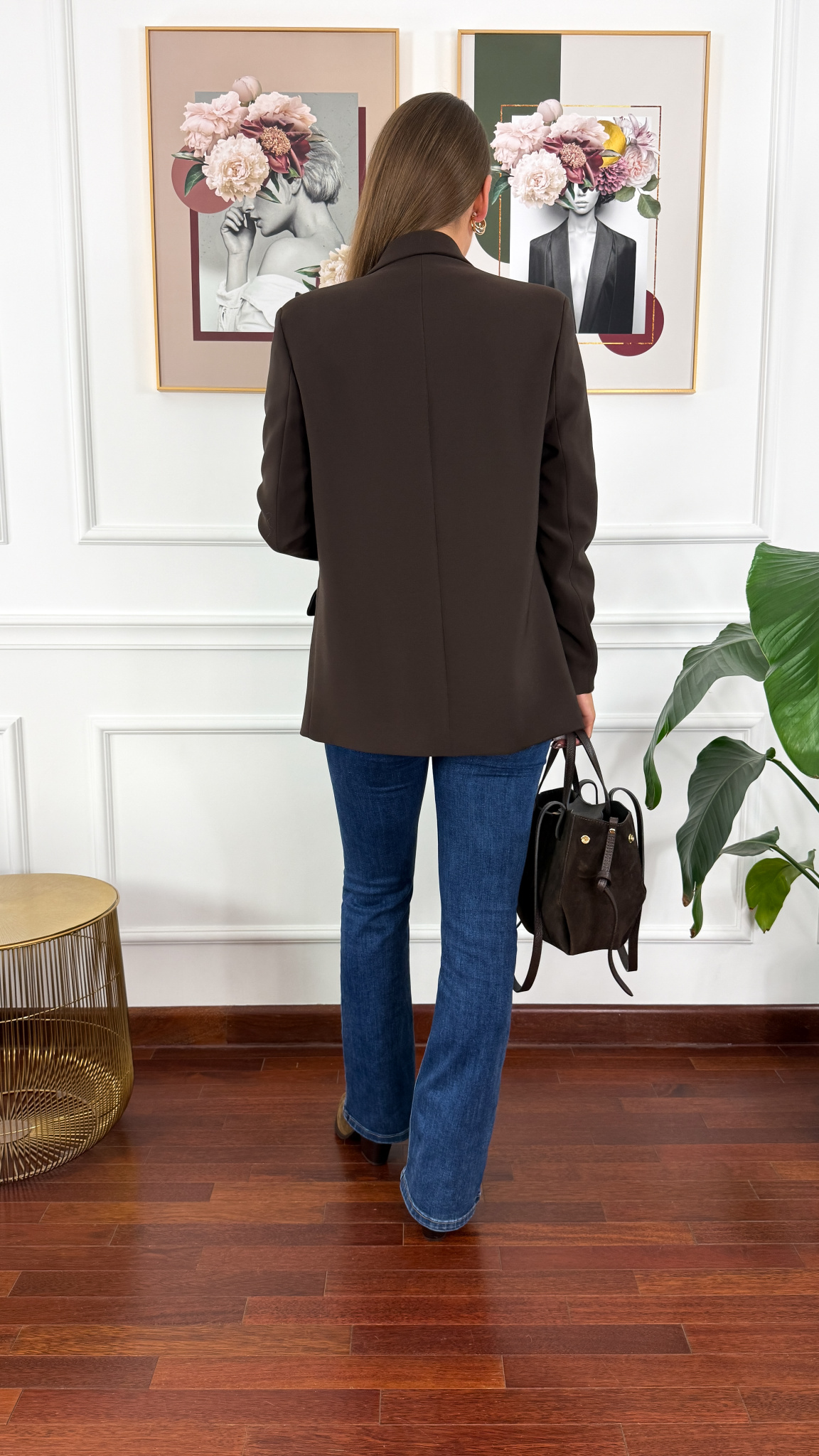 Delikatnie taliowana jednorzędowa marynarka. Posiada imitację kieszonek. Na ramionach wszyte są poduszki.