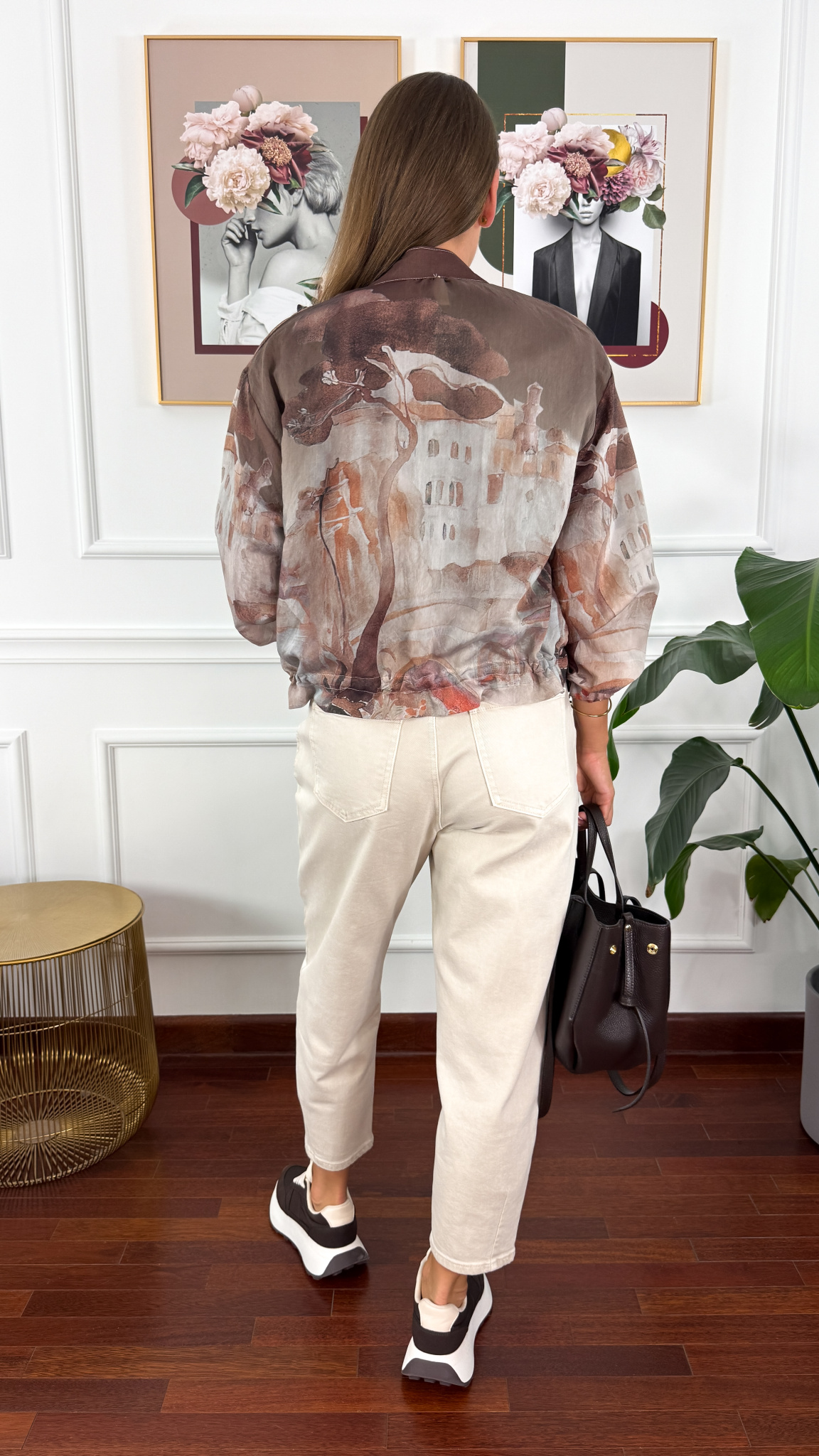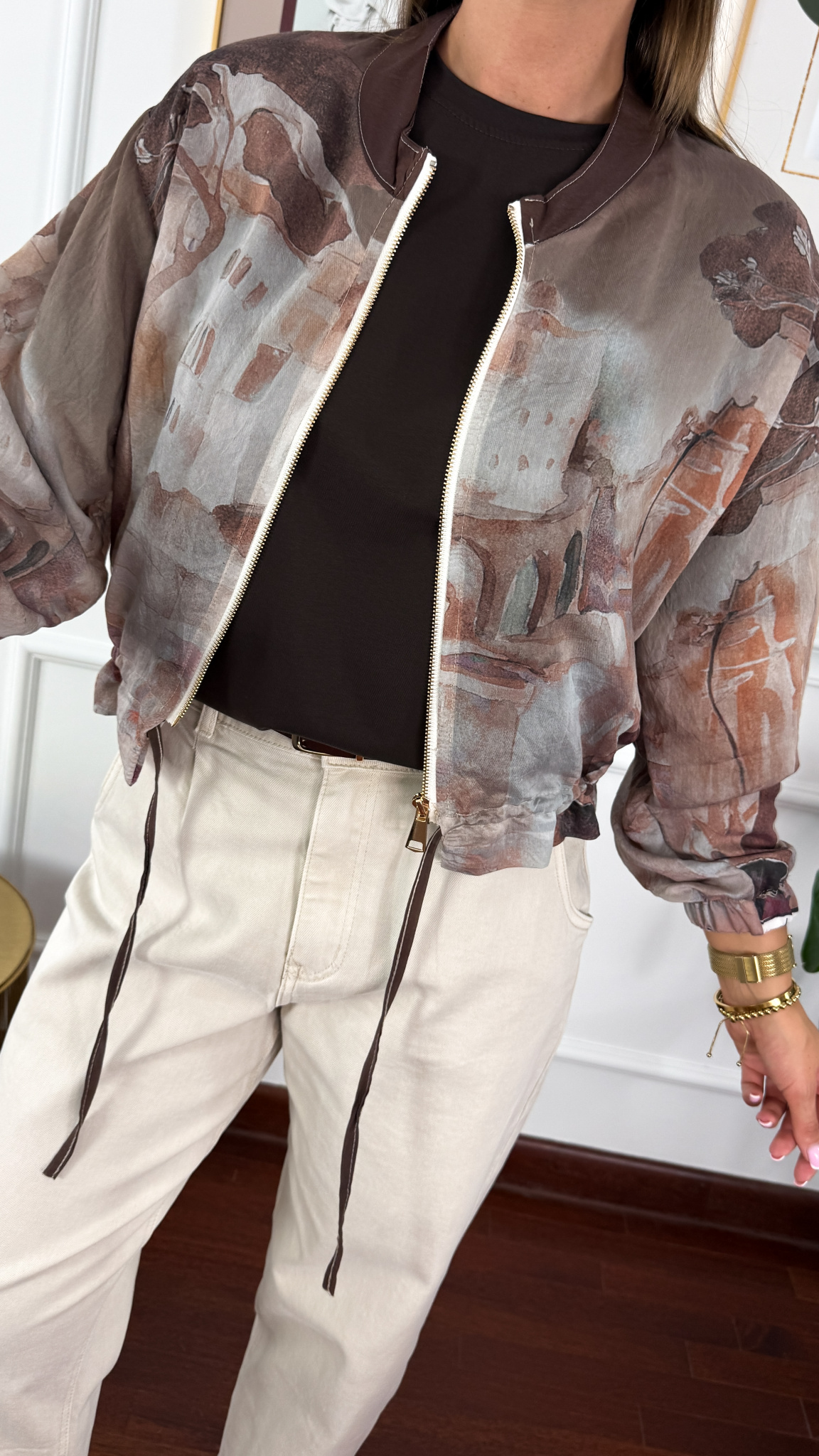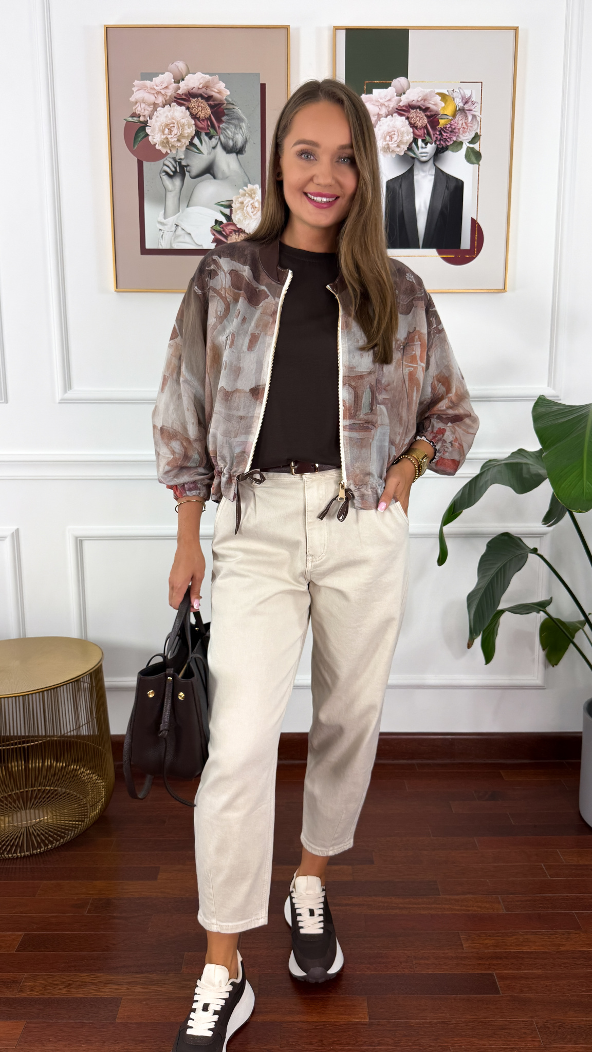 Model sprawdzi się na sylwetkę od S do L. Bomberka ze stójką zapinana na pozłacany zamek. Rękawy zakończone gumką. W dolnej części wszyto troczek. Materiał to mgiełka.
