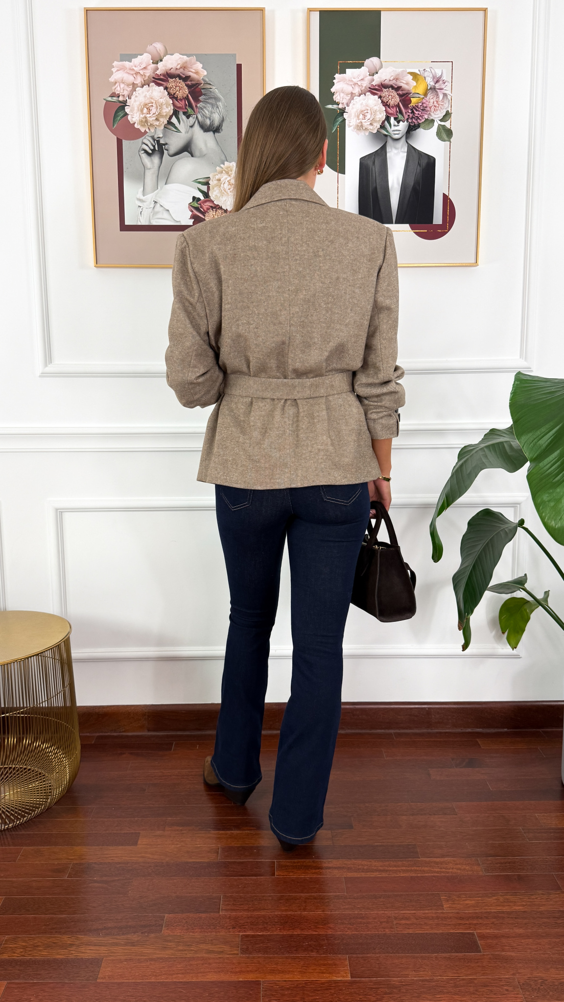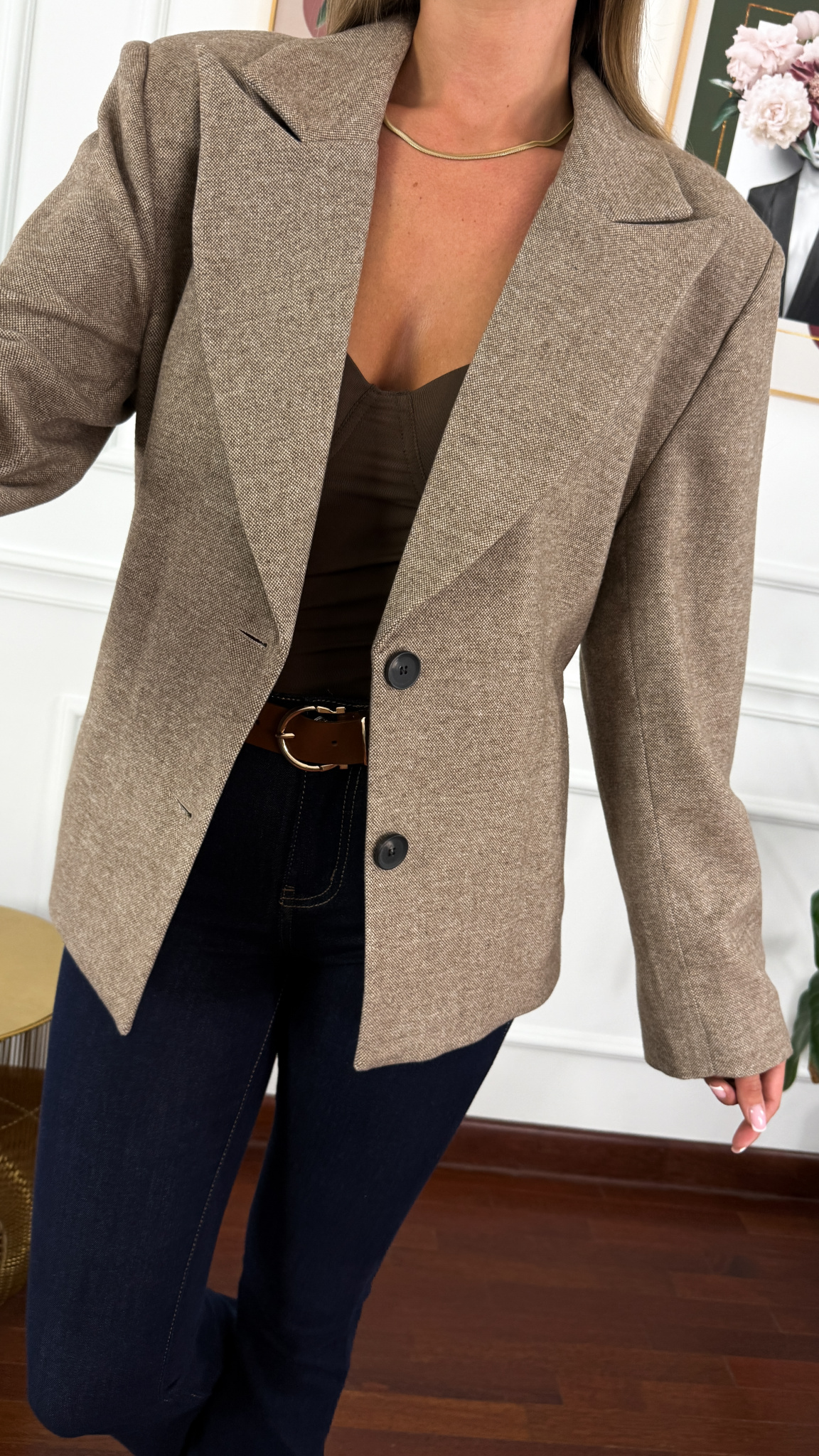 Dłuższa dwurzędowa marynarka. Delikatnie luźniejszy fason, który idealnie sprawdzi się do codziennych stylizacji. Posiada imitację kieszonki. Na ramionach wszyte są poduszki.