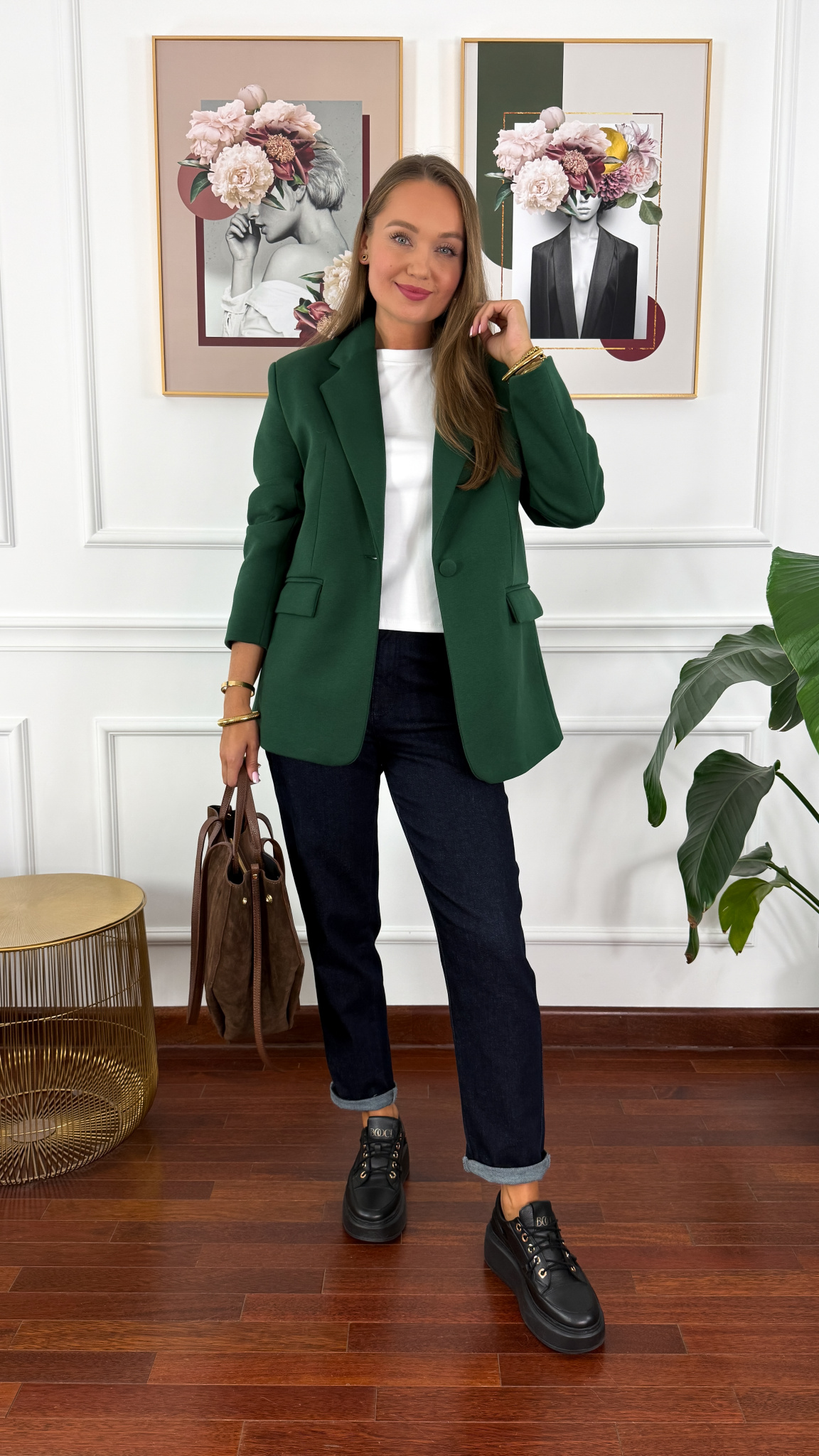 Delikatnie taliowana jednorzędowa marynarka. Na ramionach wszyte są poduszki.