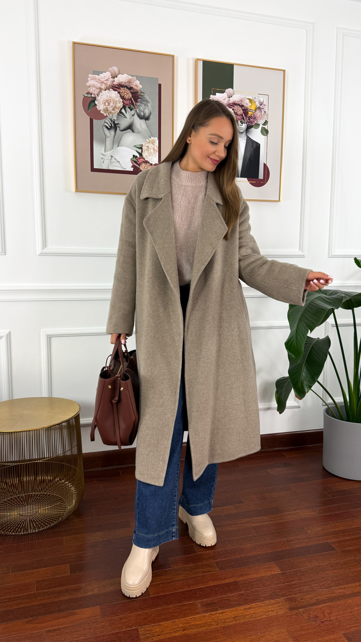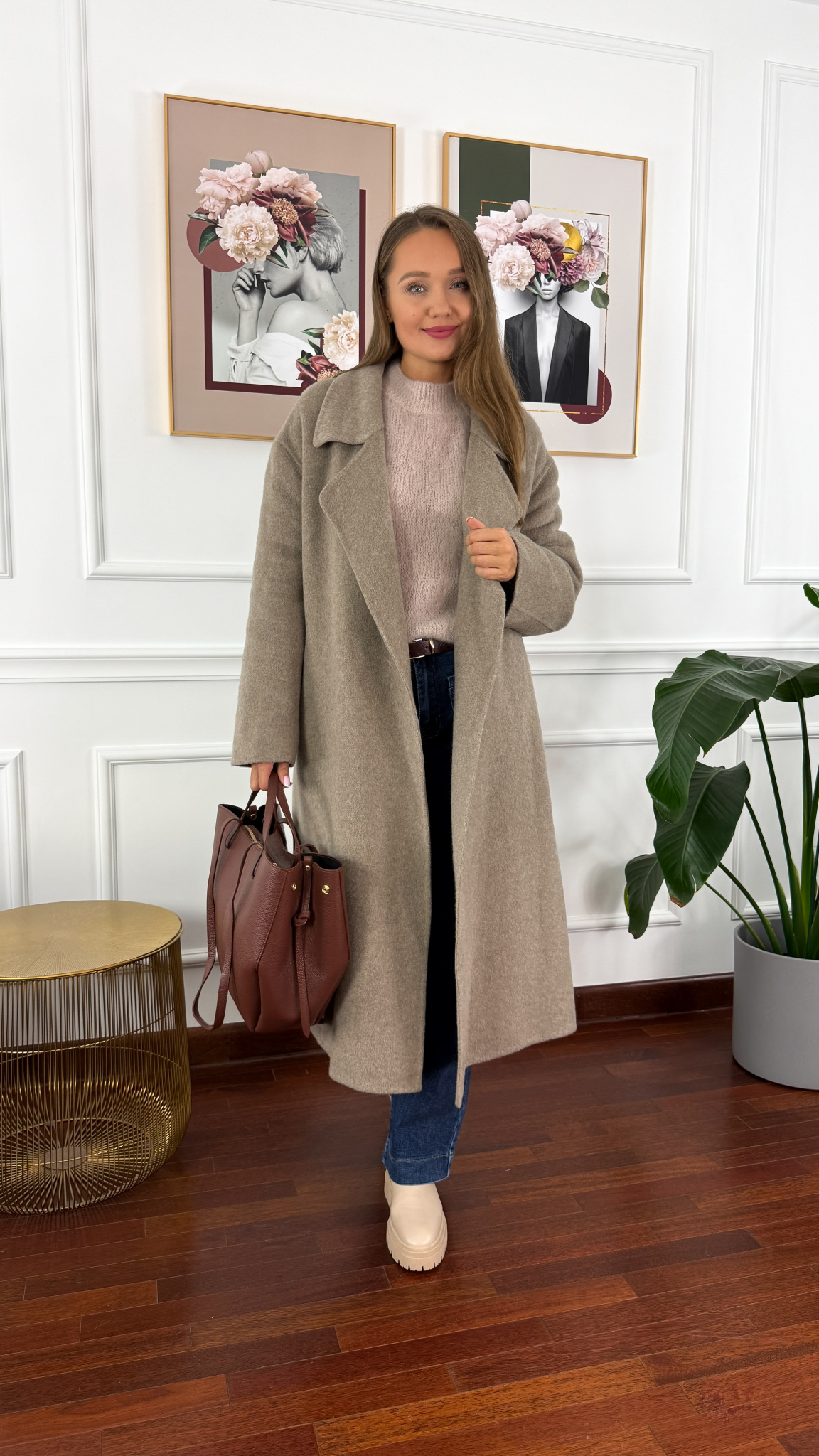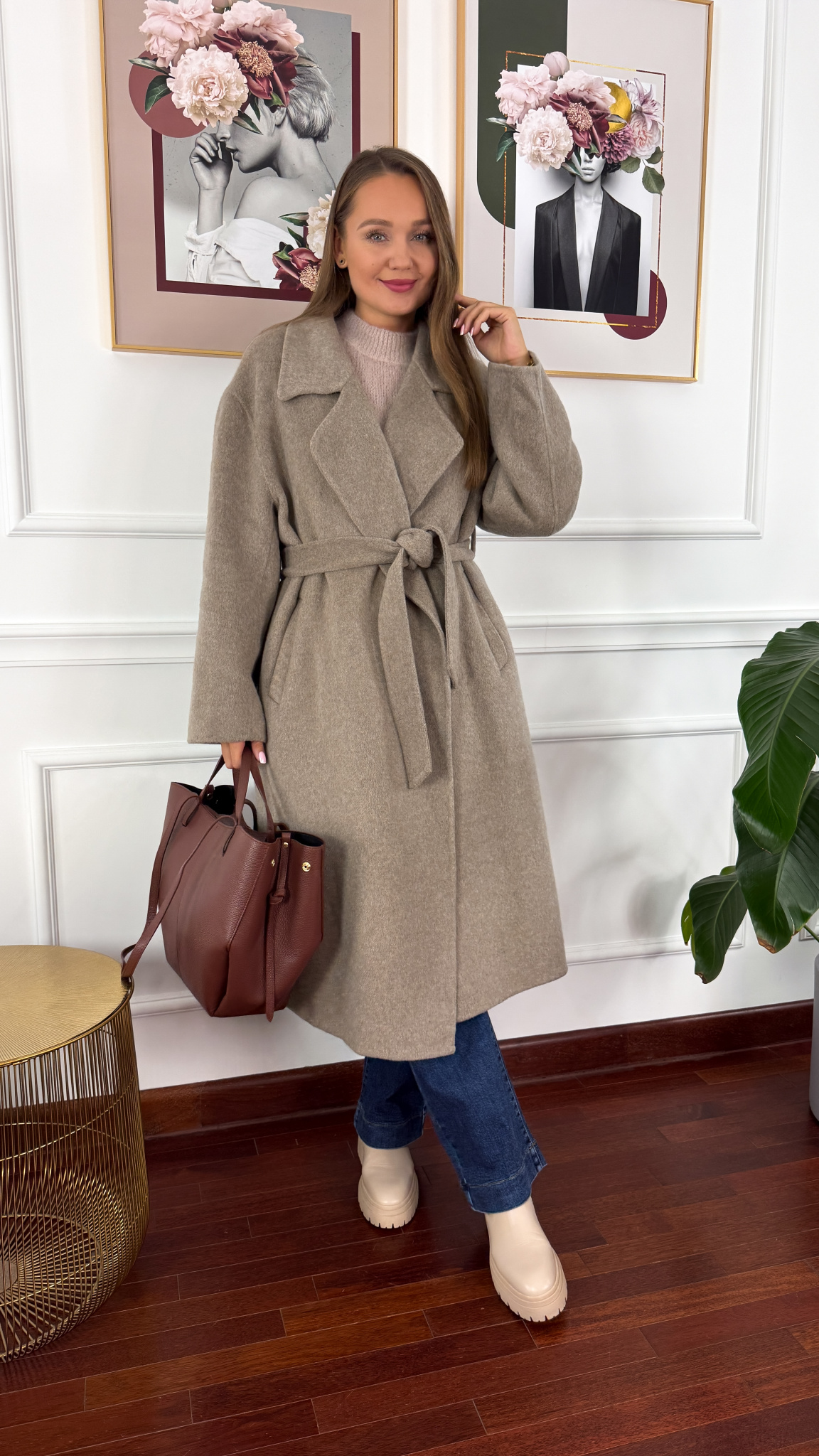 Długi płaszcz zawiązywany w pasie. Posiada praktyczne kieszonki. Rękaw jest prosty z możliwością jego podwinięcia. Nie posiada podszewki.